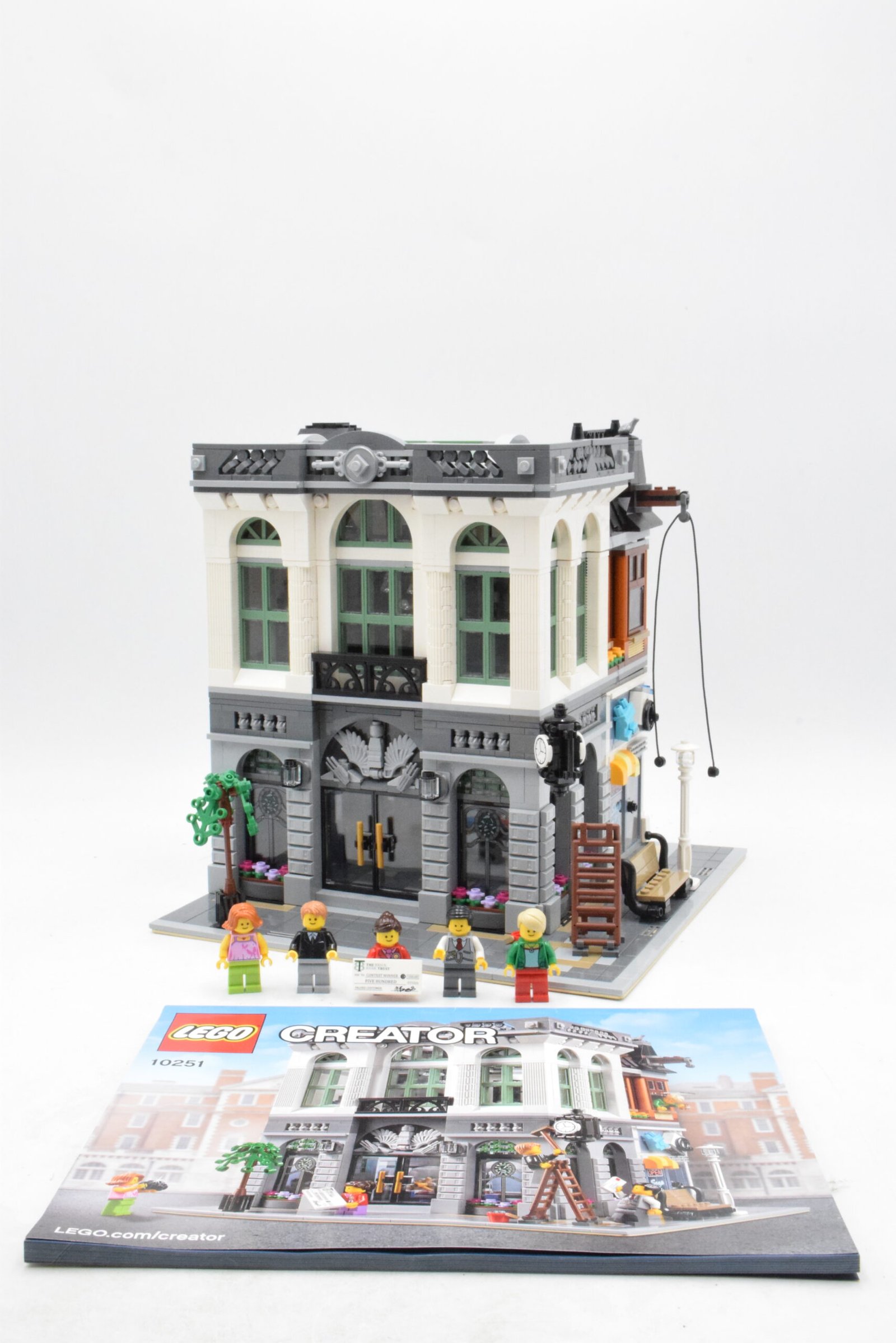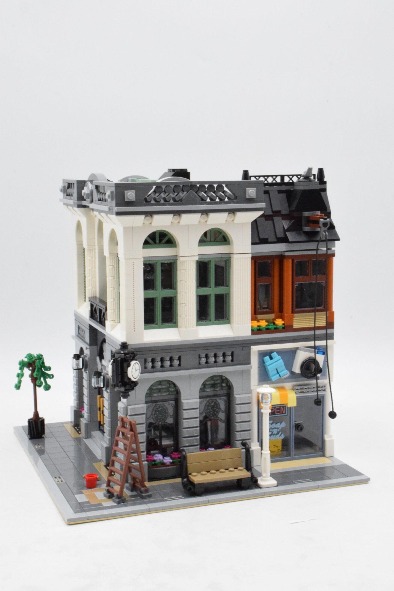 Le set inclut 5 figurines : des employés de banque, un client et même un enfant, chacun avec accessoires. Il comporte également une laverie attenante, accessible depuis la ruelle, ajoutant une touche de réalisme et de narration.