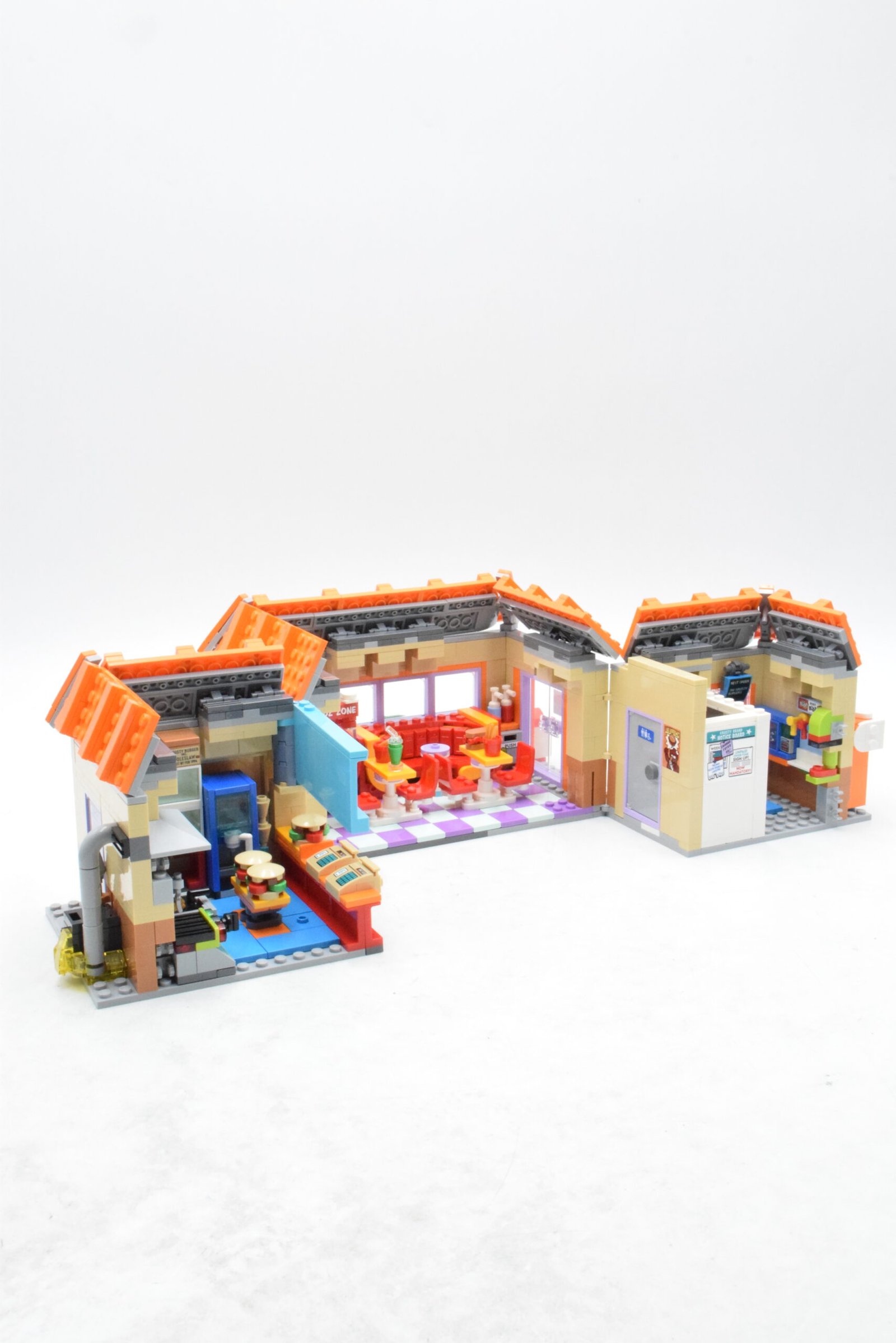 Le bâtiment du Krusty Burger est reproduit avec un grand souci du détail, aussi bien à l’extérieur qu’à l’intérieur. La façade reconnaissable, l’enseigne caractéristique et l’architecture typique plongent immédiatement dans l’ambiance de la série. L’intérieur, accessible et aménagé, propose plusieurs espaces distincts qui permettent d’imaginer des scènes du quotidien à Springfield. Chaque élément contribue à créer un décor vivant et cohérent, fidèle à l’esprit décalé des Simpson.
