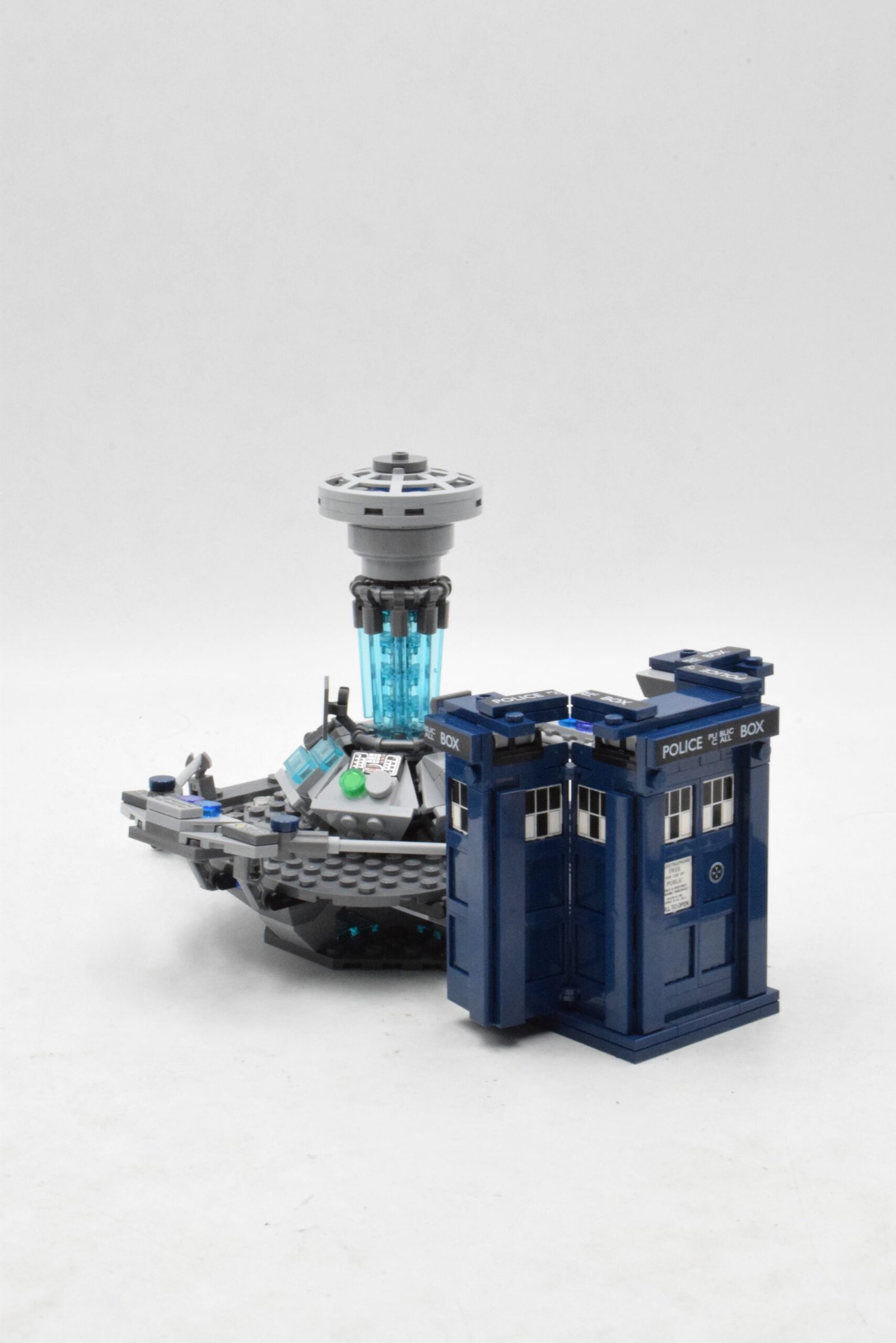 L’élément central est la salle de contrôle du TARDIS, reproduite avec ses consoles technologiques, écrans, leviers et panneaux lumineux. La plateforme hexagonale est fidèle aux versions modernes du décor et utilise des techniques de montage ingénieuses pour capturer l’esthétique complexe du vaisseau spatio-temporel. Le TARDIS extérieur, bleu emblématique, peut s’ouvrir et se connecter directement à l’intérieur, renforçant la cohérence visuelle.