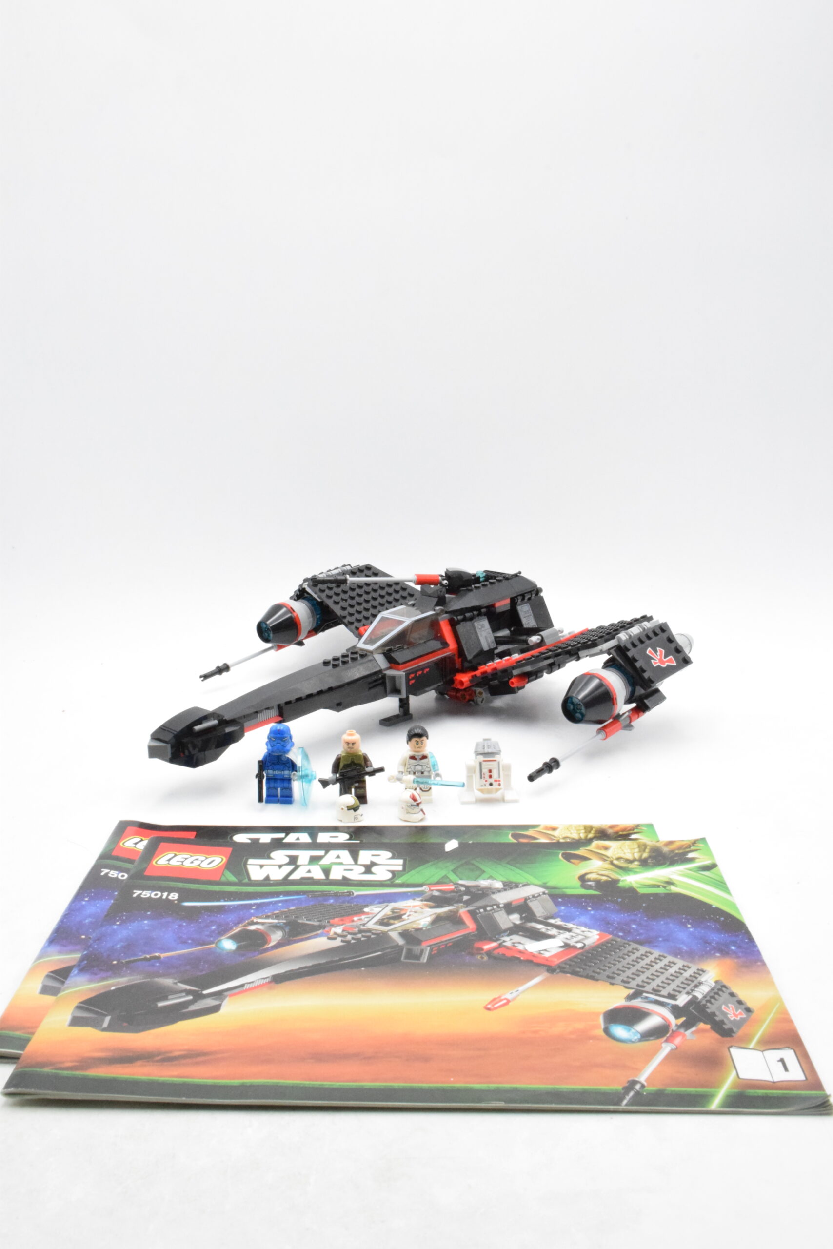 Le Starfighter 75018 est doté de ailes repliables, d’un cockpit ouvrant capable d’accueillir une minifigurine, d’un train d’atterrissage rétractable, et d’un canon orientable/en hauteur. Il comprend également un compartiment de rangement pour un Holocron, un droïde astromech R4‑G0, et deux missiles “flick‑missiles” pour des attaques rapides. Le cockpit offre une bonne visibilité et espace de maniement.
