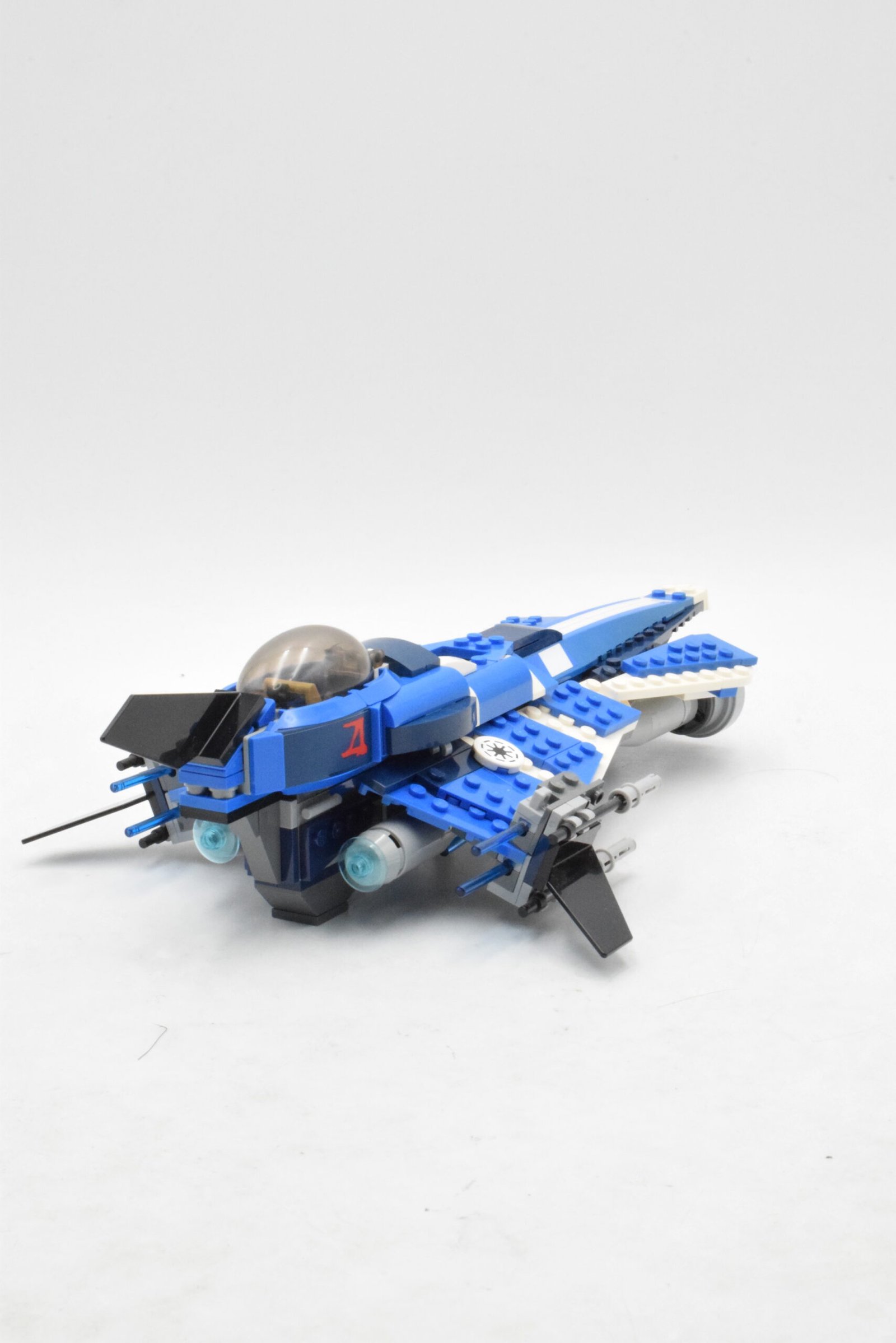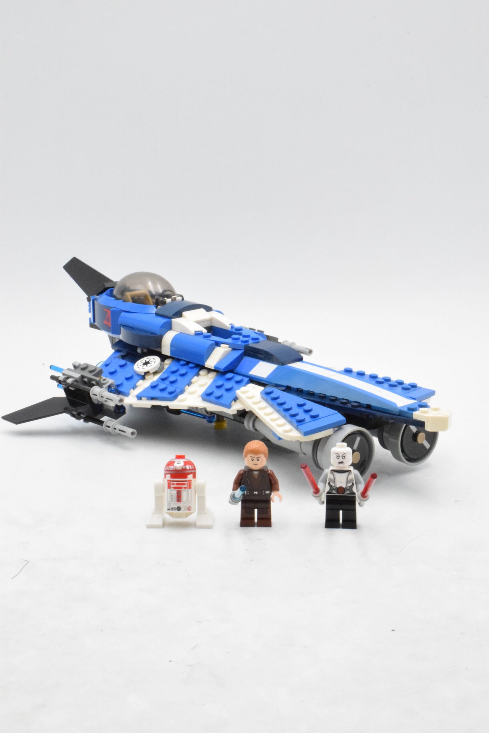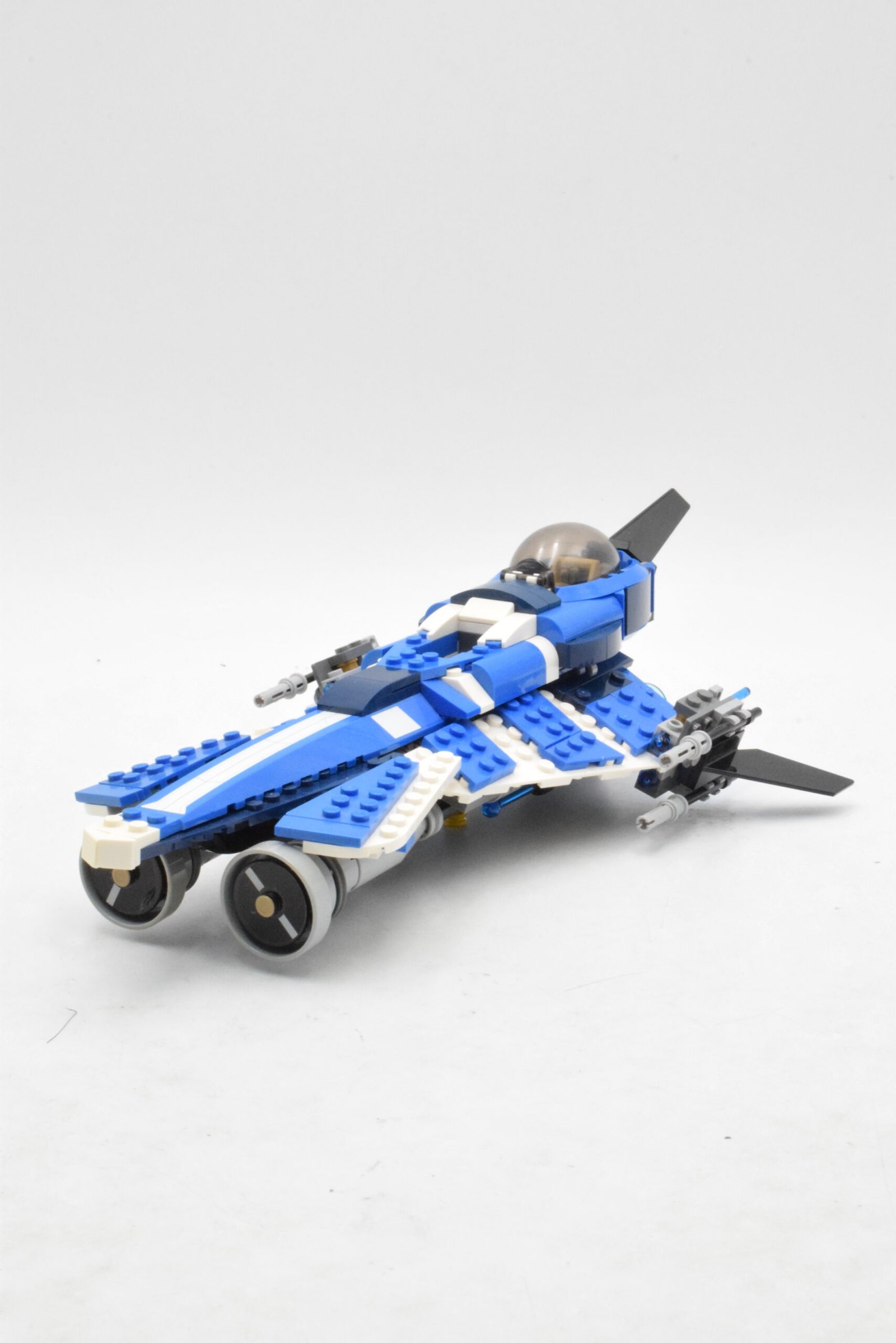 Le vaisseau se distingue par son design asymétrique bleu foncé et blanc, rappelant les choix esthétiques d’Anakin dans la série. Les ailes angulaires, les détails imprimés et la verrière ouvrante renforcent l’aspect expérimental et personnalisé de ce modèle. Le cockpit peut accueillir la minifigurine d’Anakin et inclut des commandes détaillées pour des scénarios de vol immersifs.