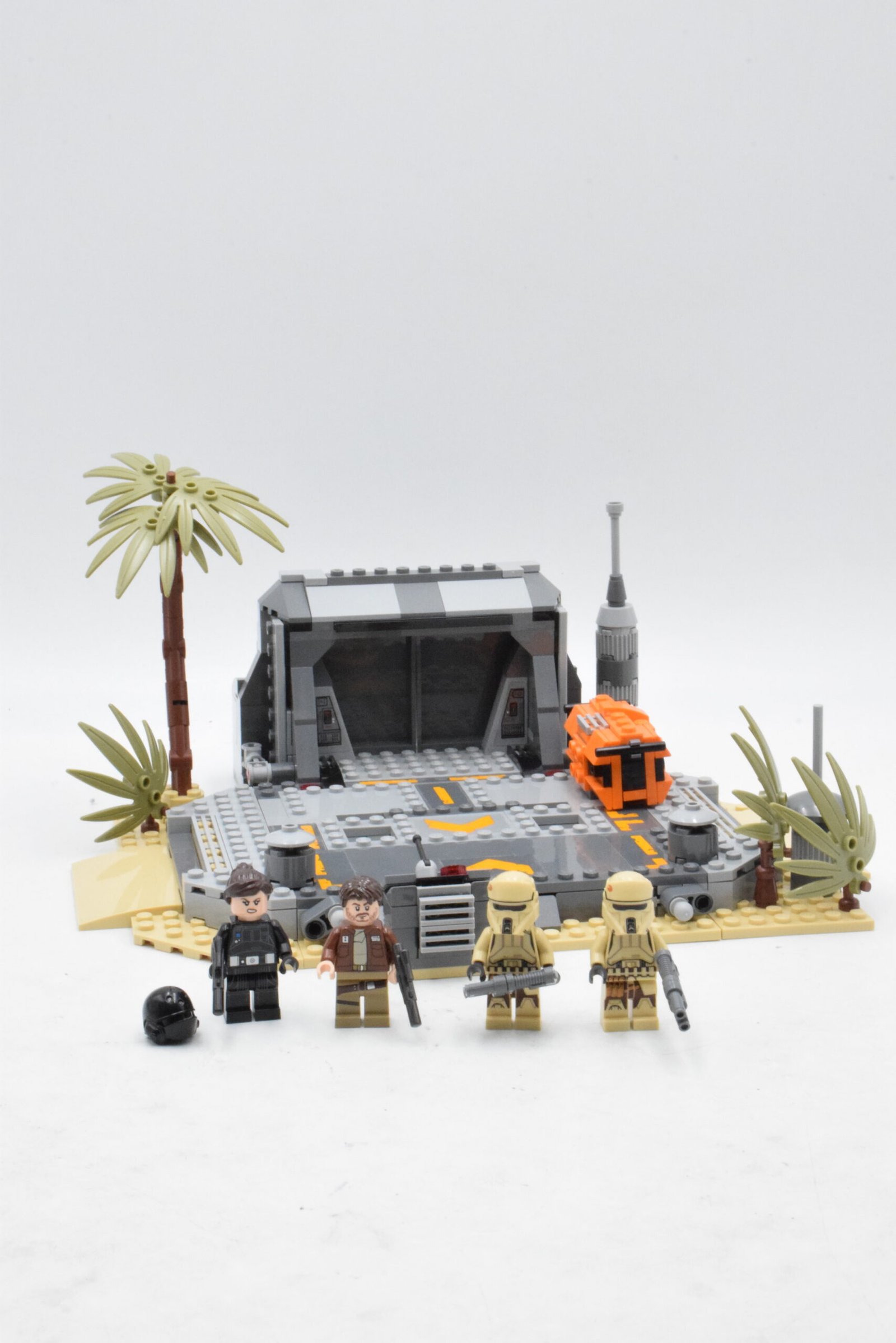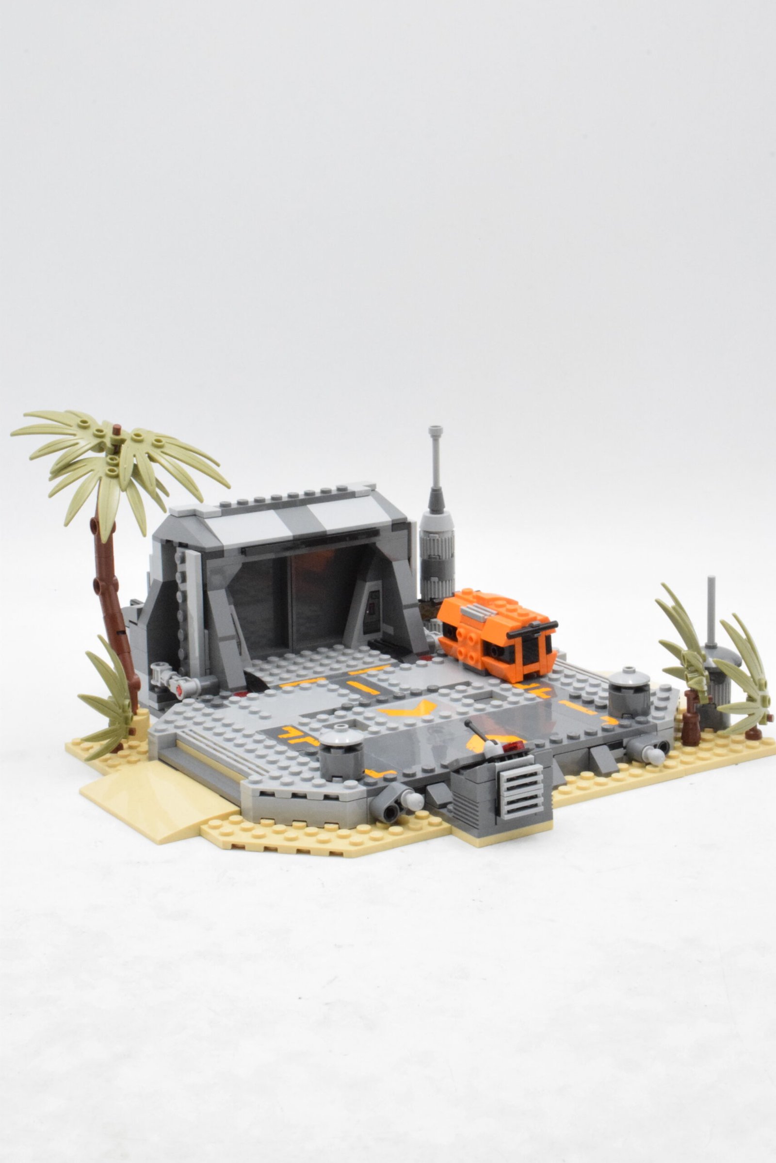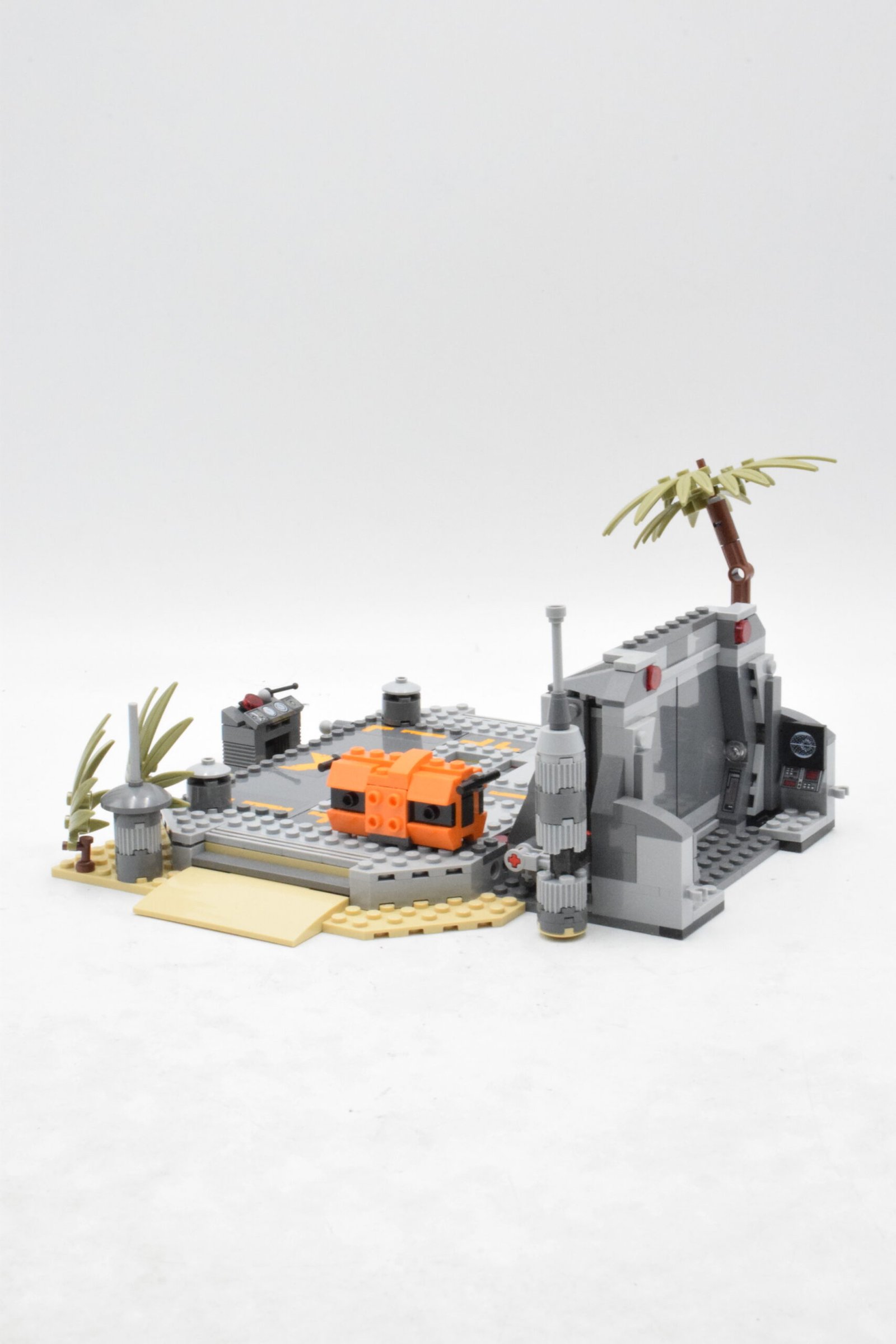 La construction principale représente un bunker impérial côtier, fidèle à l’esthétique tropicale de Scarif. L’extérieur combine palmiers, passerelles et modules blindés, contrastant avec l’intérieur technologique composé d’un terminal de sécurité, de caisses d’armes et de panneaux lumineux. Plusieurs mécanismes de jeu permettent d’activer des explosions, d’ouvrir des portes coulissantes ou de révéler des compartiments secrets.
