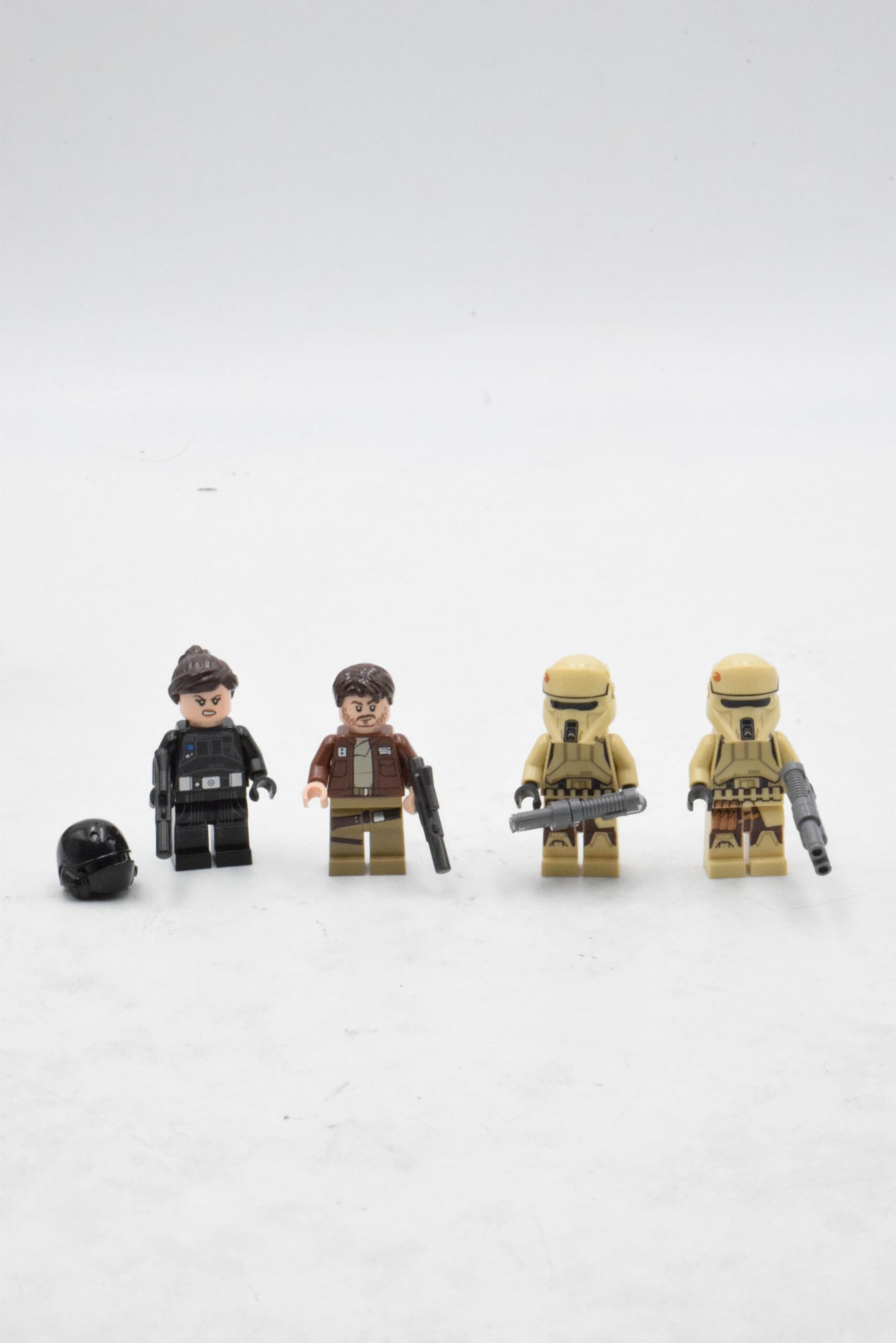 Le set inclut quatre minifigurines : Cassian Andor, Jyn Erso (déguisée en opératrice impériale) et deux Shoretroopers, tous dotés d’impressions détaillées inspirées du film. Les Shoretroopers bénéficient d’armures uniques beige et bleu, parfaitement adaptées à l’environnement tropical. Cassian et Jyn sont équipés de blasters et de tenues tactiques adaptées à une opération d’infiltration.