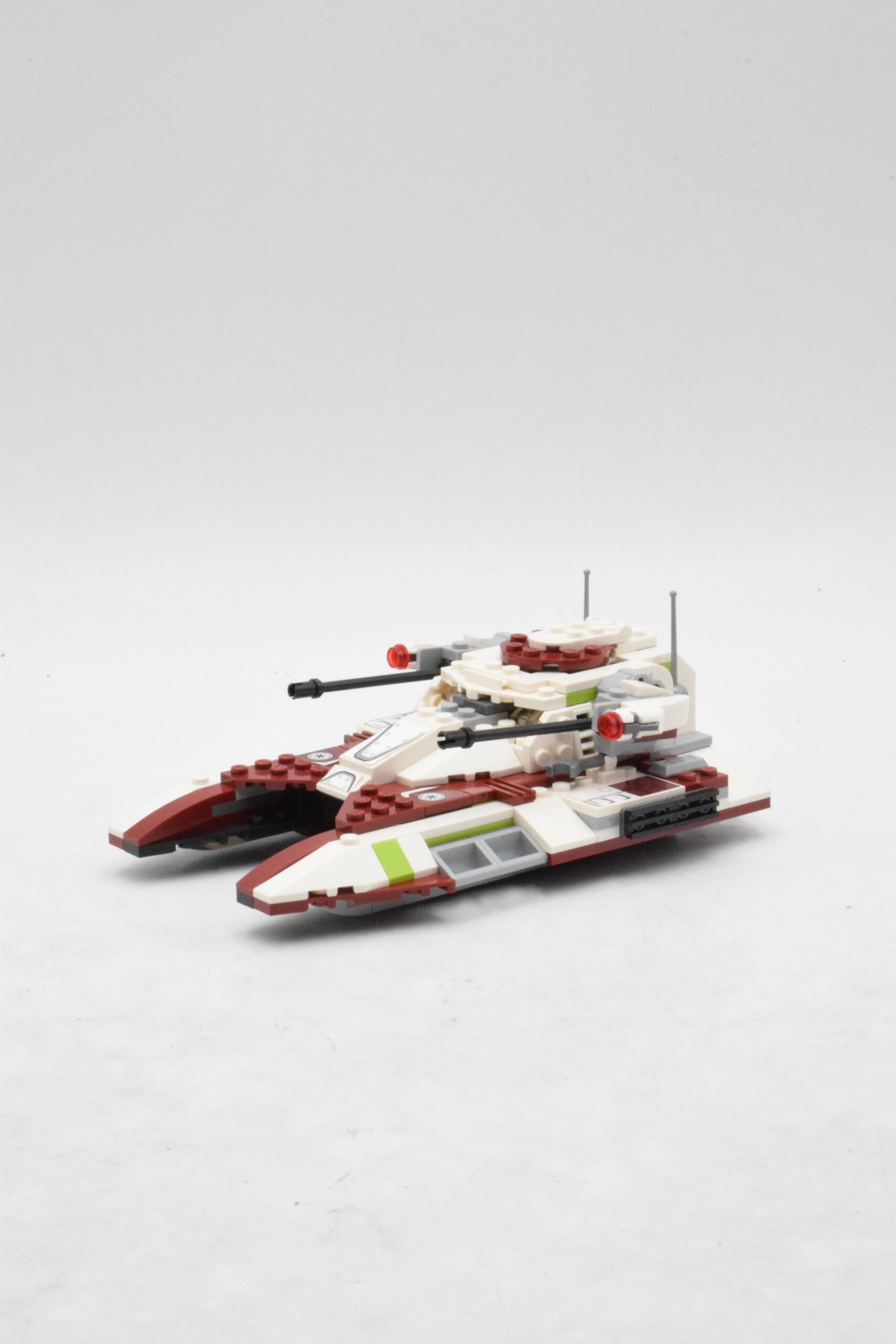 Le Republic Fighter Tank se distingue par son design robuste et anguleux, fidèle à l’esthétique militaire de la République. Sa structure est pensée pour le jeu dynamique, avec des canons orientables, un cockpit accessible et une silhouette imposante qui renforce l’impression de puissance. Les lignes rouges et blanches caractéristiques apportent un rendu visuel immédiatement reconnaissable, parfait pour compléter un univers LEGO Star Wars existant.