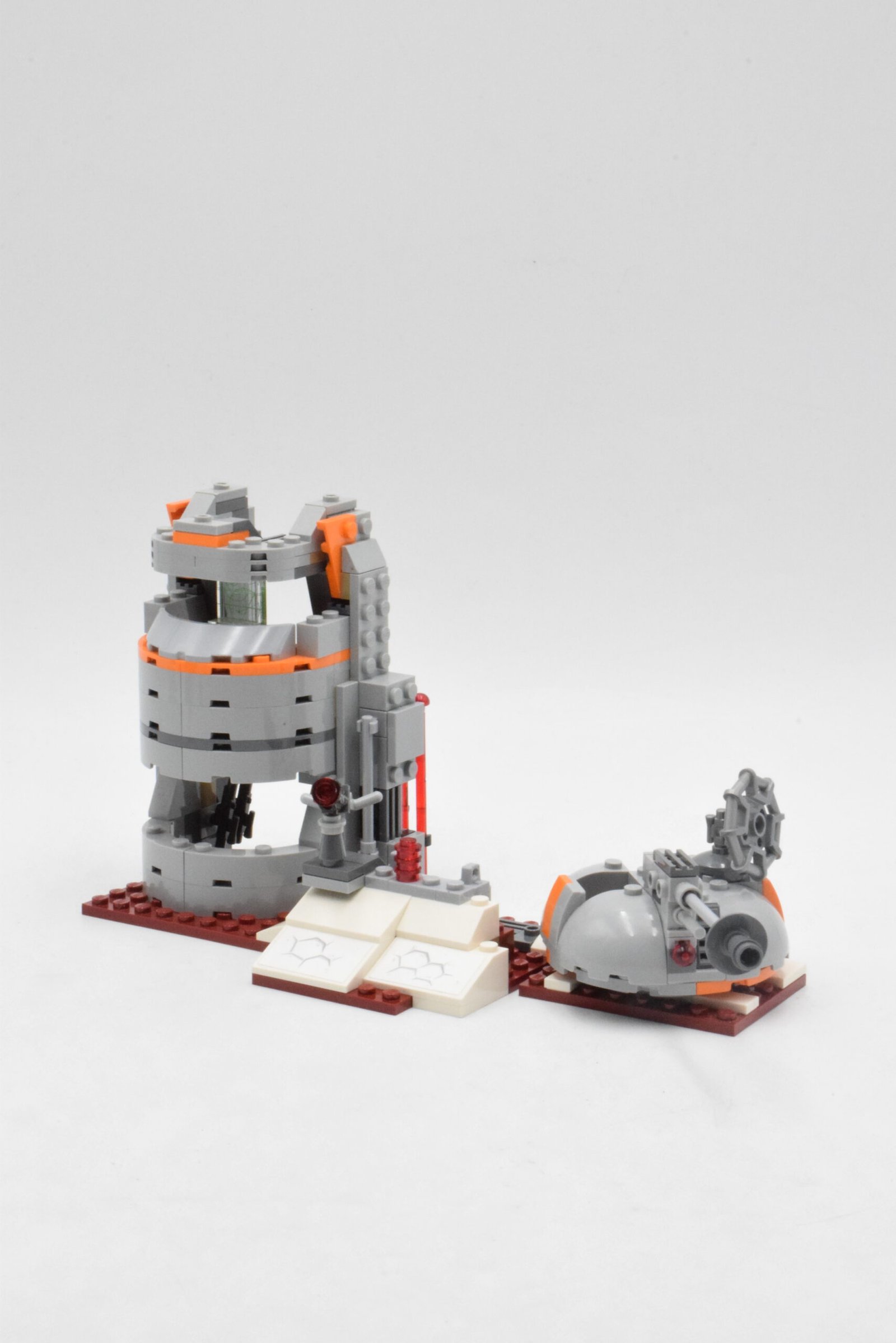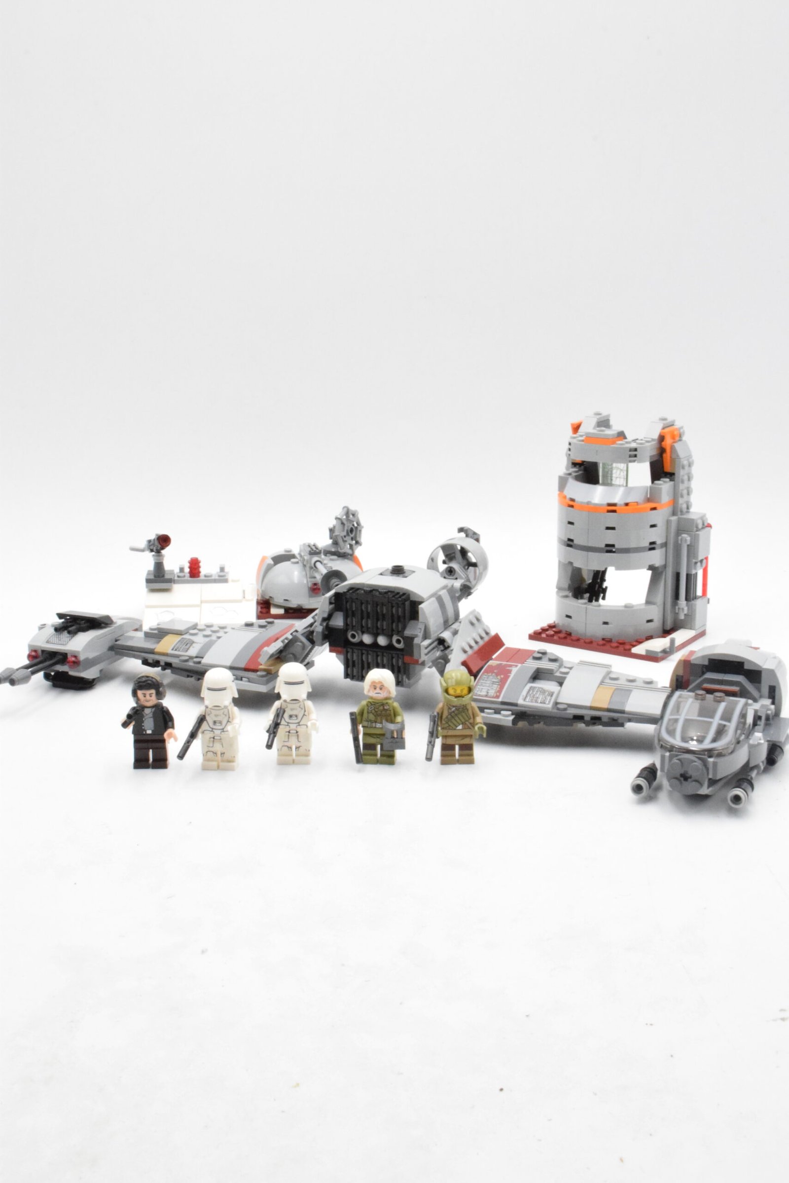 L’élément central du set est le ski-speeder, reconnaissable à sa silhouette effilée et à ses ailes allongées, pensé pour des manœuvres rapides à basse altitude. Sa conception favorise la jouabilité avec des détails mécaniques visibles et une prise en main fluide. Le décor est enrichi par des positions défensives et des installations modulaires, permettant de créer un véritable champ de bataille évolutif. Les contrastes de couleurs et les textures renforcent l’immersion dans l’environnement de Crait.