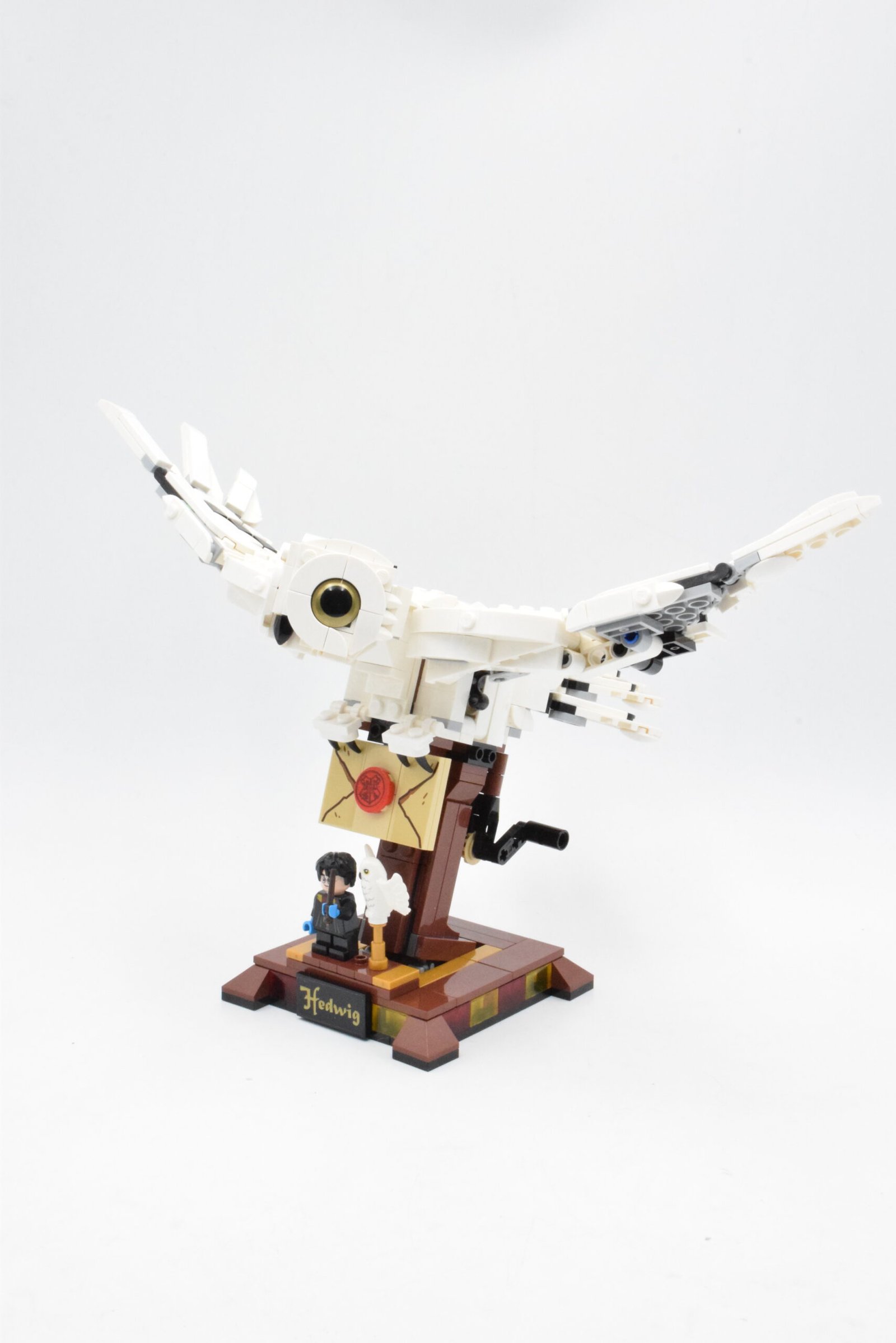 Hedwige est représentée en plein vol, ailes déployées, tenant une enveloppe dans son bec. Le mécanisme intégré permet d’animer les ailes grâce à une manivelle discrète, apportant une dimension dynamique et vivante au modèle. Les plumes sont soigneusement restituées par un jeu de briques blanches et de courbes subtiles, tandis que la tête orientable renforce l’expressivité de la chouette. Le socle noir, sobre et stable, est accompagné d’une plaque nominative qui souligne le caractère collection et exposition du set.