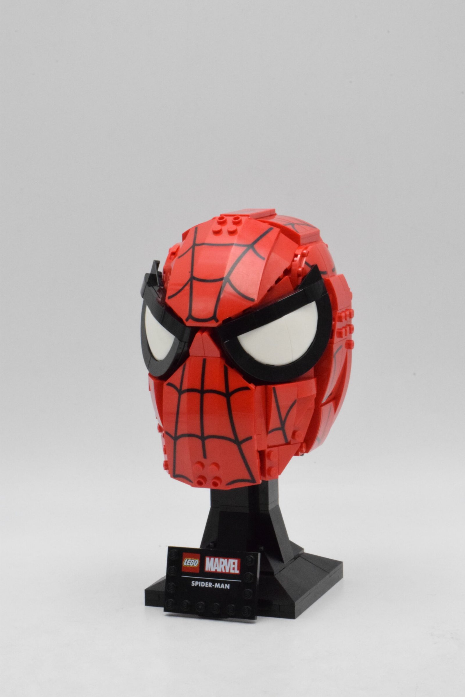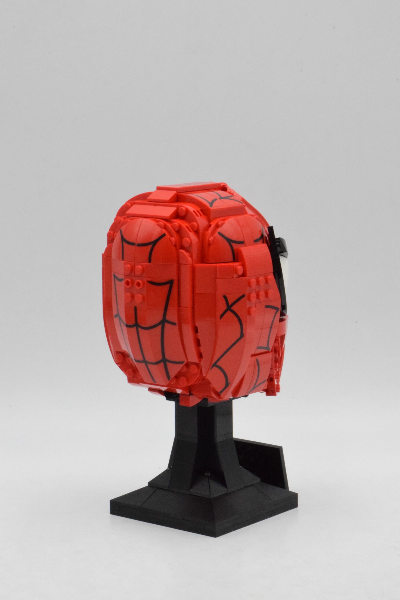 Le masque reproduit fidèlement la forme iconique du visage de Spider-Man, avec ses grands yeux blancs expressifs et sa structure rouge intense. Les lignes noires caractéristiques du costume sont subtilement intégrées grâce à des techniques de construction précises, offrant un rendu graphique harmonieux et immédiatement reconnaissable. L’utilisation de pièces inclinées et de surfaces lisses permet de créer une silhouette fluide et équilibrée.