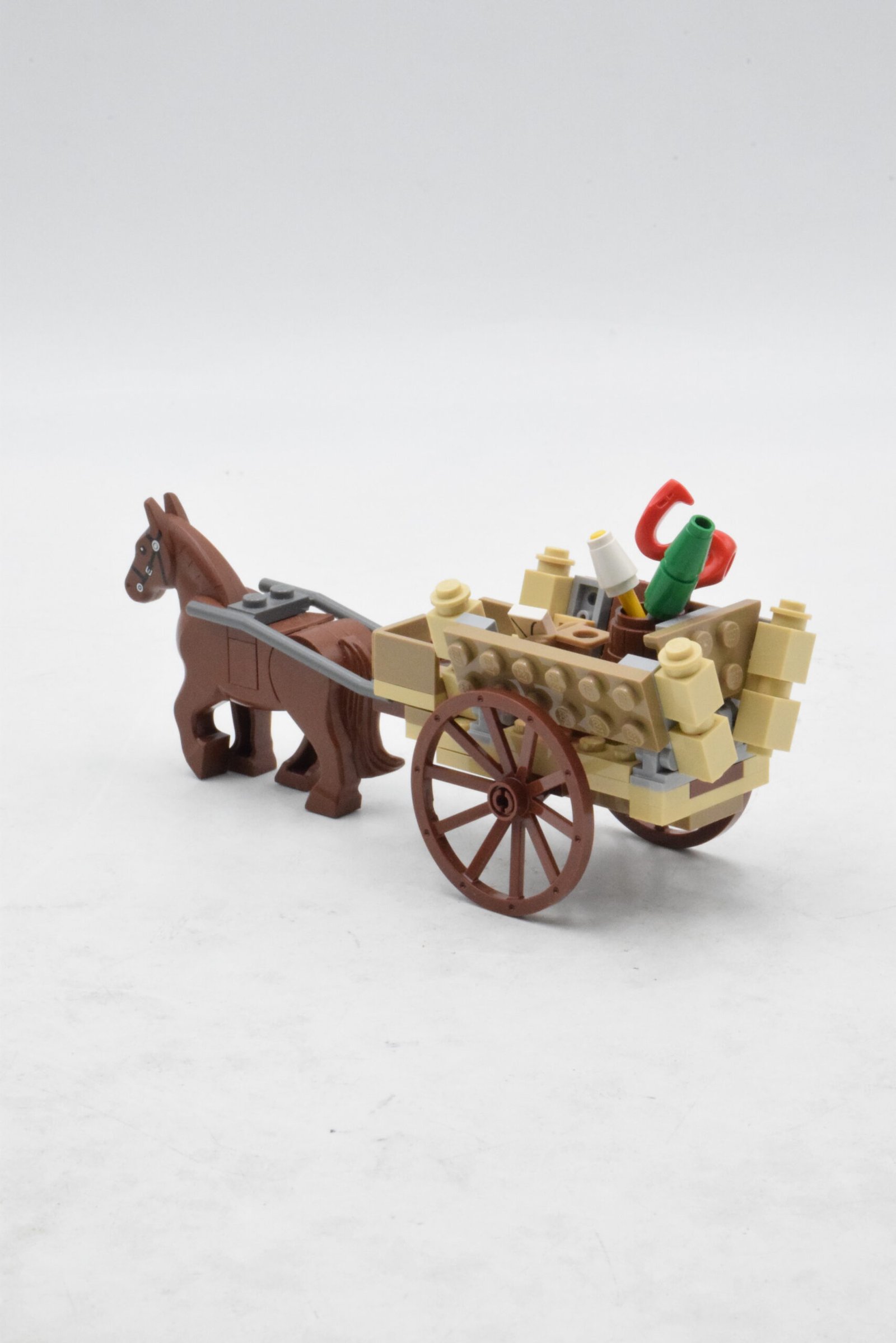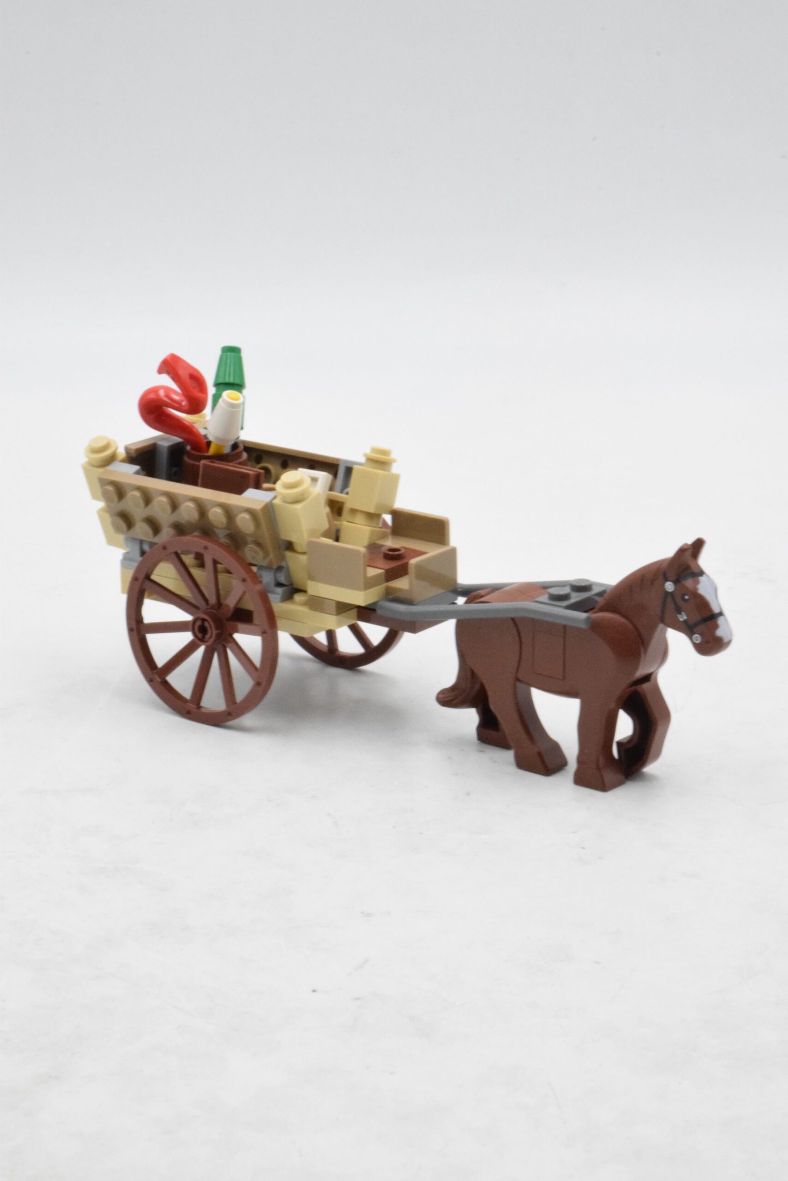 La construction principale comprend la charrette de Gandalf, tirée par un cheval, chargée de feux d’artifice colorés et d’accessoires magiques. Les roues fonctionnelles et la structure ouverte facilitent la mise en scène et le jeu. À côté, un petit élément de décor avec un arbre, un panneau directionnel et des éléments végétaux contribue à installer l’atmosphère bucolique de Hobbitbourg.