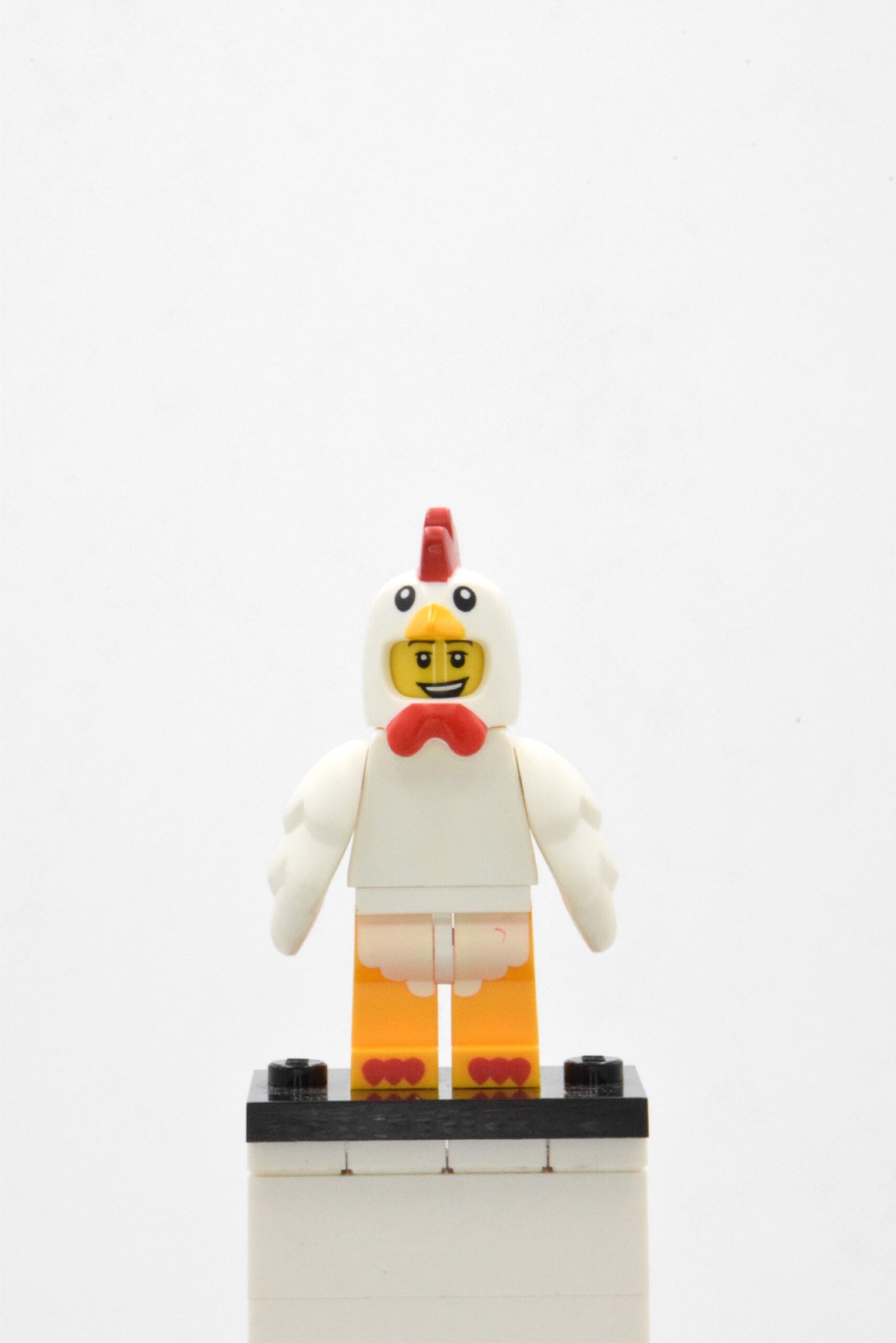 Le Chicken Suit Guy, issu de la Série 9 des LEGO Collectible Minifigures, est l’une des minifigs les plus populaires et emblématiques de toute la collection CMF. Avec son humour irrésistible et son design immédiatement reconnaissable, il incarne parfaitement l’esprit fun et décalé qui a fait le succès de la gamme.