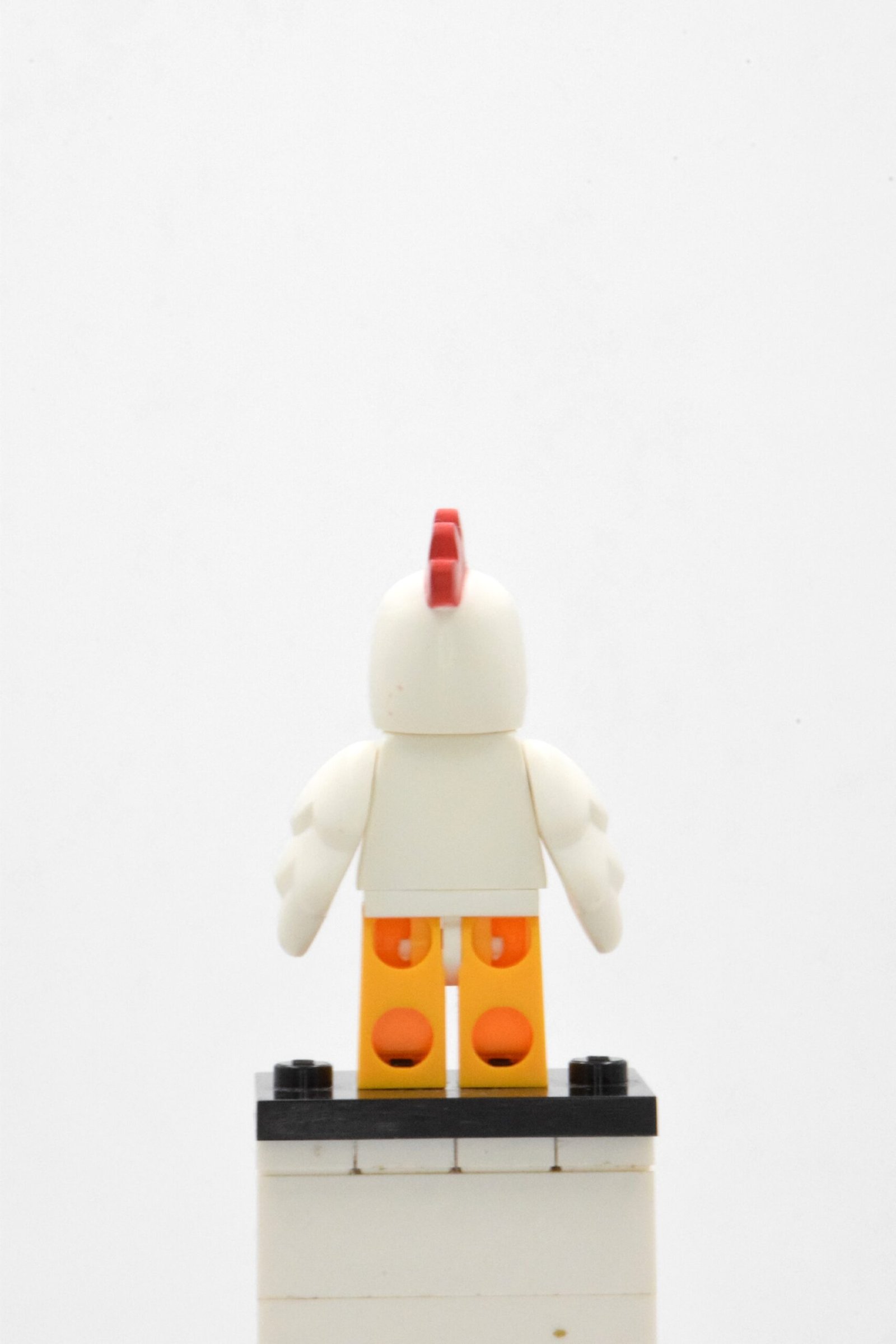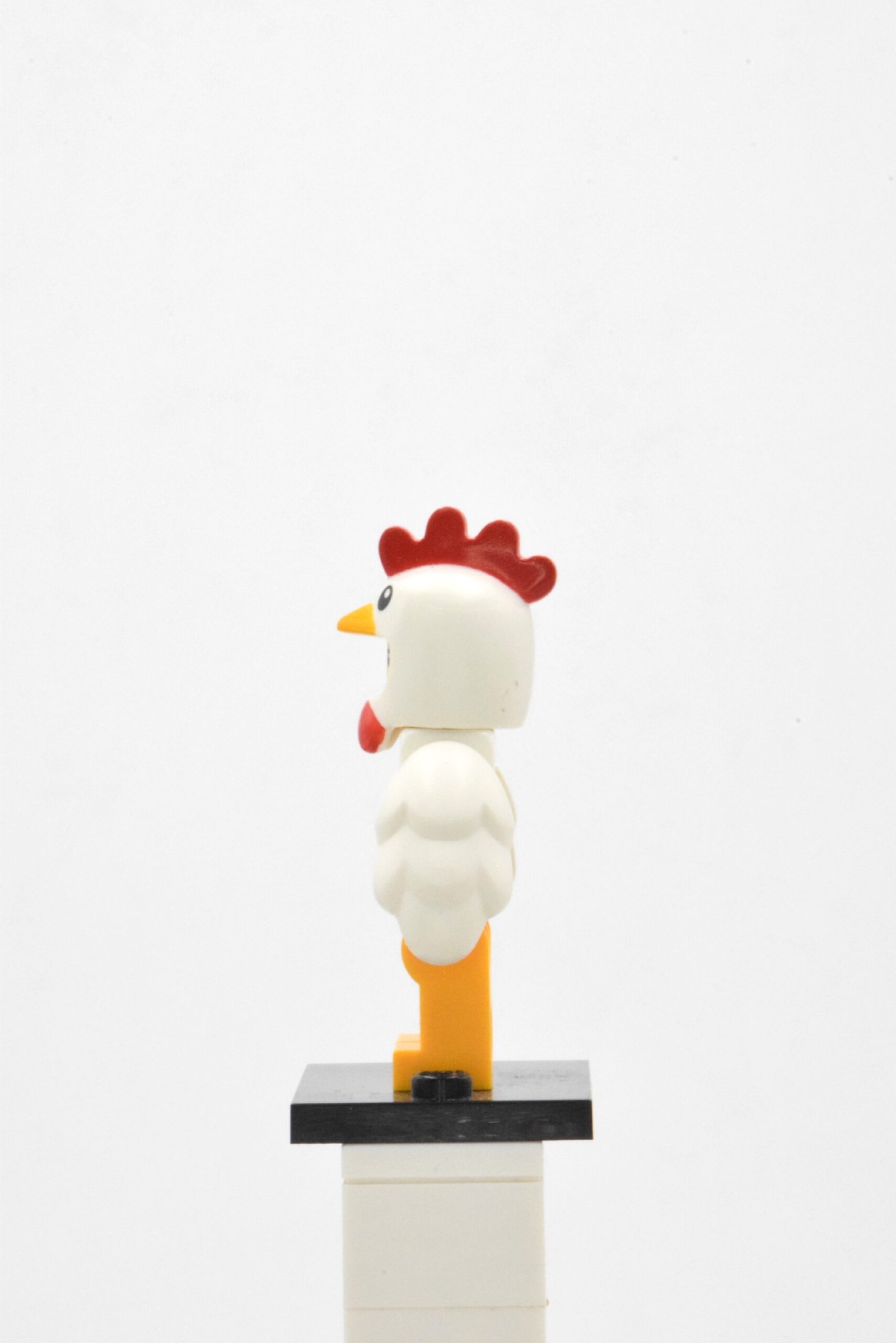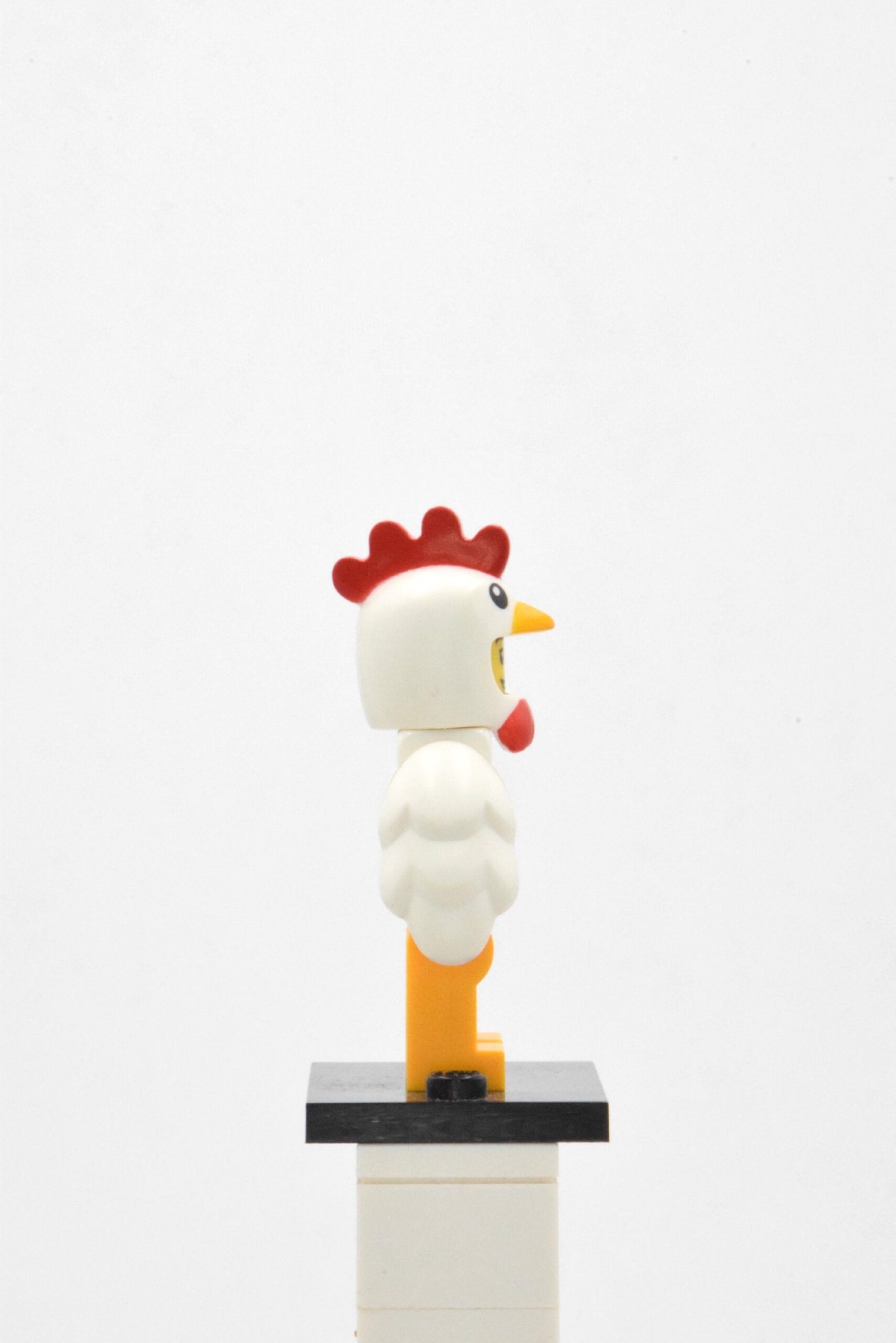 La minifigurine représente un personnage habillé dans un costume complet de poulet, comprenant une grande coiffe blanche moulée en forme de tête de poule avec bec orange, crête rouge et yeux expressifs. Le torse et les jambes, entièrement blancs, sont imprimés pour imiter le plumage, tandis que les ailes moulées remplacent les bras traditionnels et ajoutent une silhouette arrondie très réussie. Les pieds orange, élargis pour imiter des pattes d’oiseau, complètent à merveille cet ensemble humoristique.