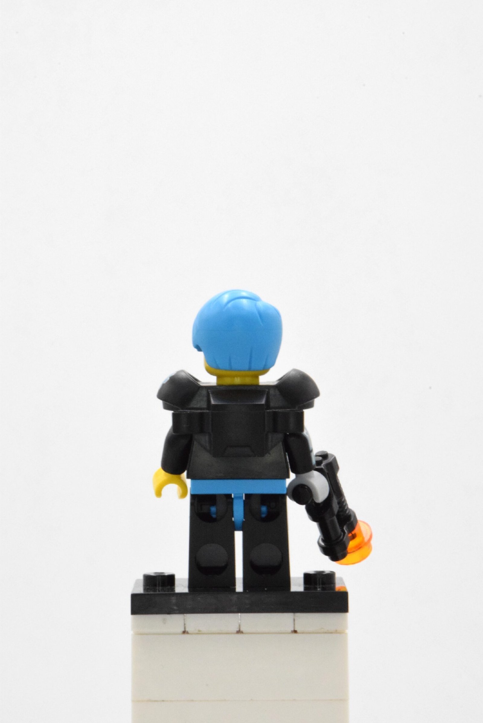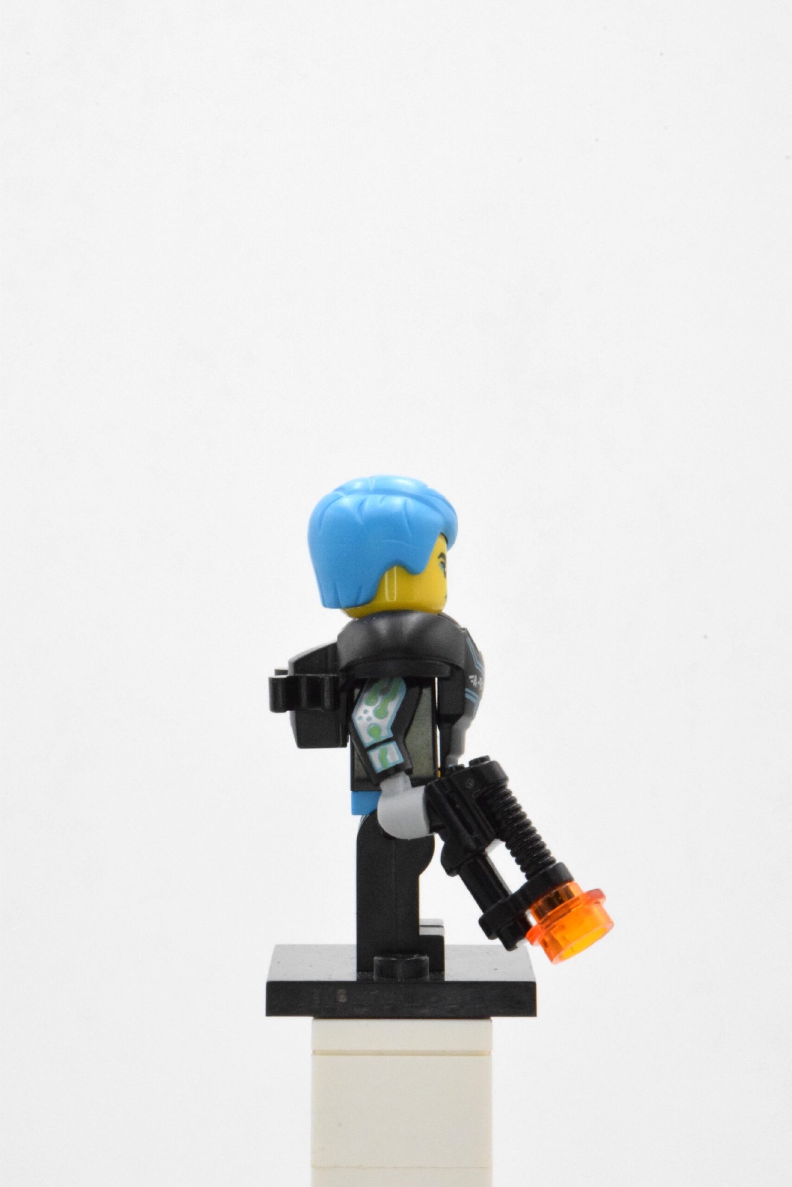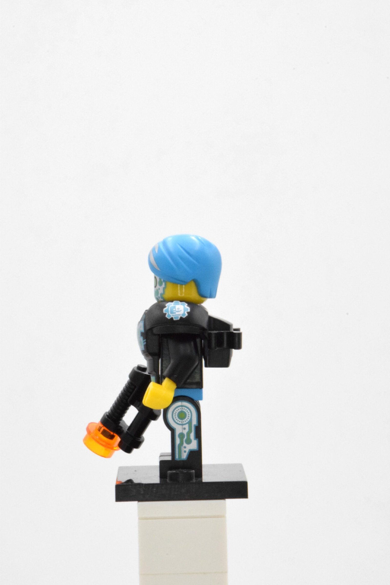 Le visage de Cyborg est l’un de ses atouts majeurs : moitié chair, moitié technologie, avec un œil bionique vert qui renforce son apparence augmentée. La chevelure stylisée bleu clair accompagne ce look moderne et apporte une touche visuelle forte. La minifigurine est fournie avec un blaster noir, une arme futuriste idéale pour enrichir vos mises en scène de combats high-tech ou de missions intergalactiques.