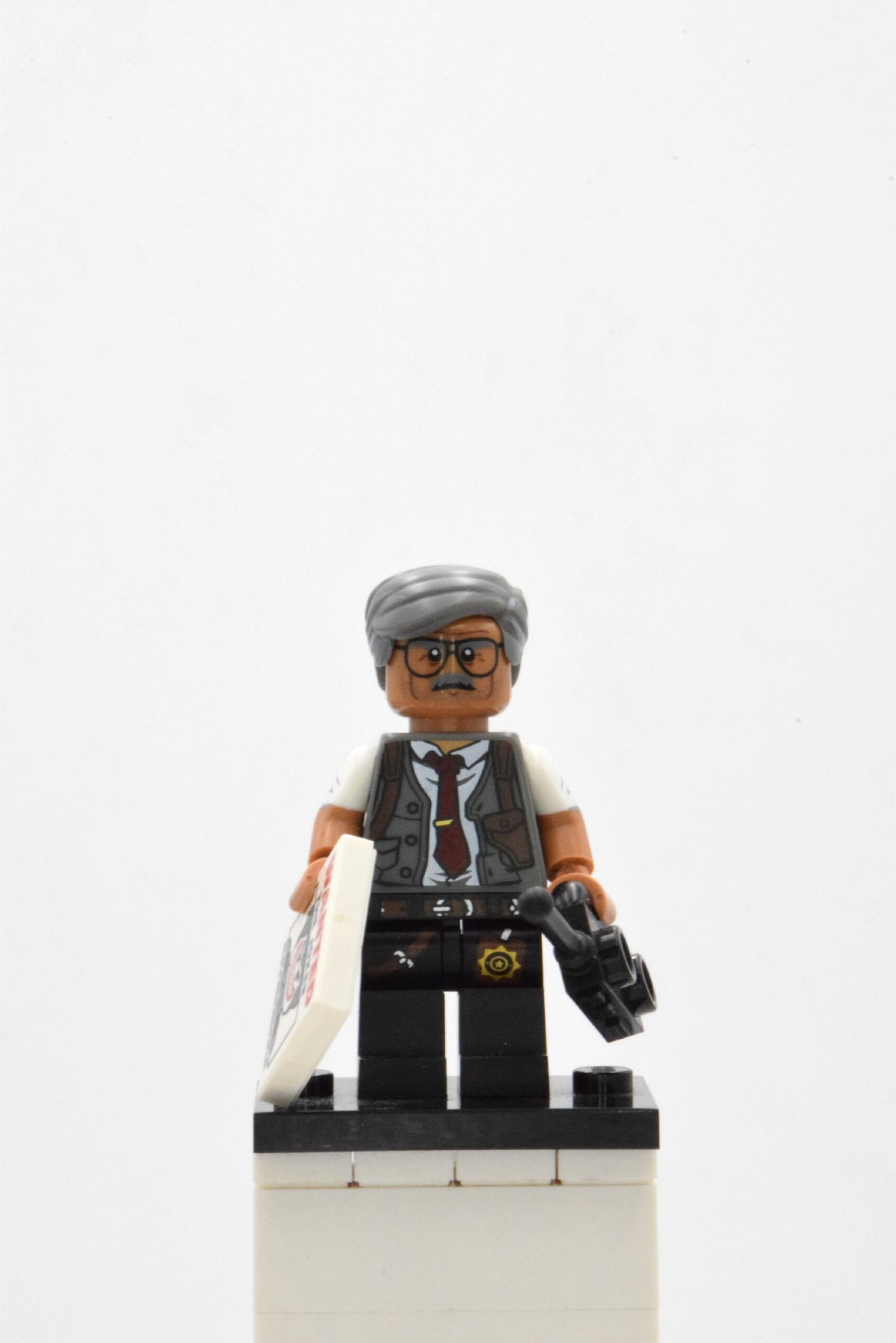 La minifigurine présente une tenue de policier haut gradé, composée d’une veste bleu marine richement imprimée avec insignes, écussons et pochettes. Les détails des boutons dorés, du badge et de la radio intégrée témoignent d’un soin particulier apporté au design. Le commissaire porte également des lunettes rectangulaires imprimées, soulignant son air sérieux mais bienveillant, parfaitement adapté à son rôle de pilier de la force publique.