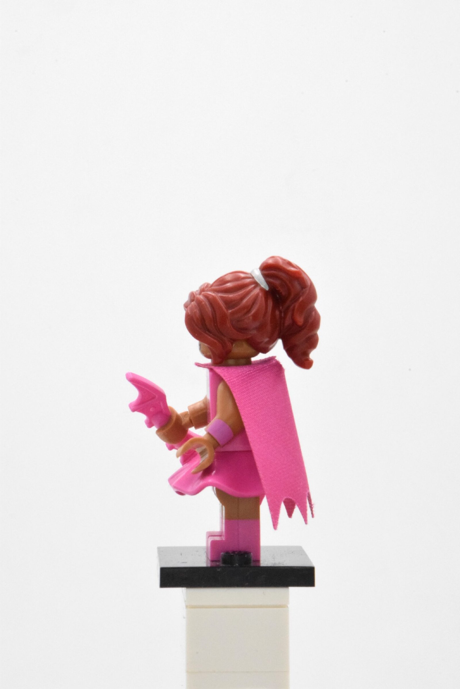La minifigurine inclut une cape rose brillante, effet pailleté, qui donne à Batgirl un aspect encore plus théâtral et festif. Son masque caractéristique, également teinté de rose, conserve la forme classique des oreilles pointues, tandis que son visage affiche un sourire déterminé et confiant.