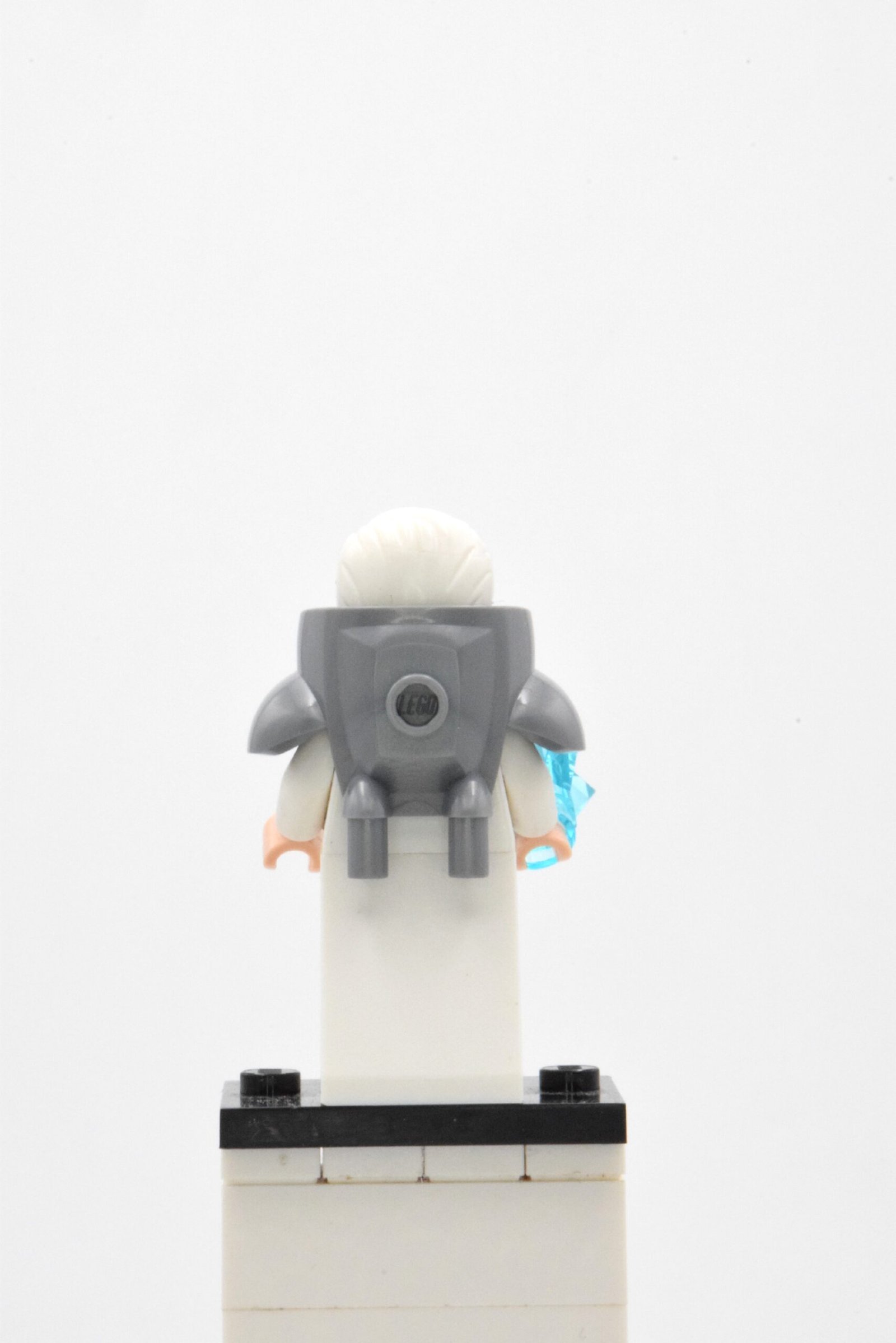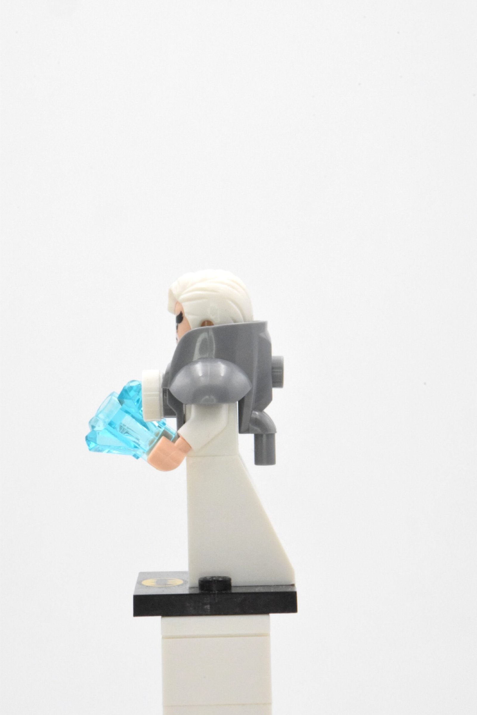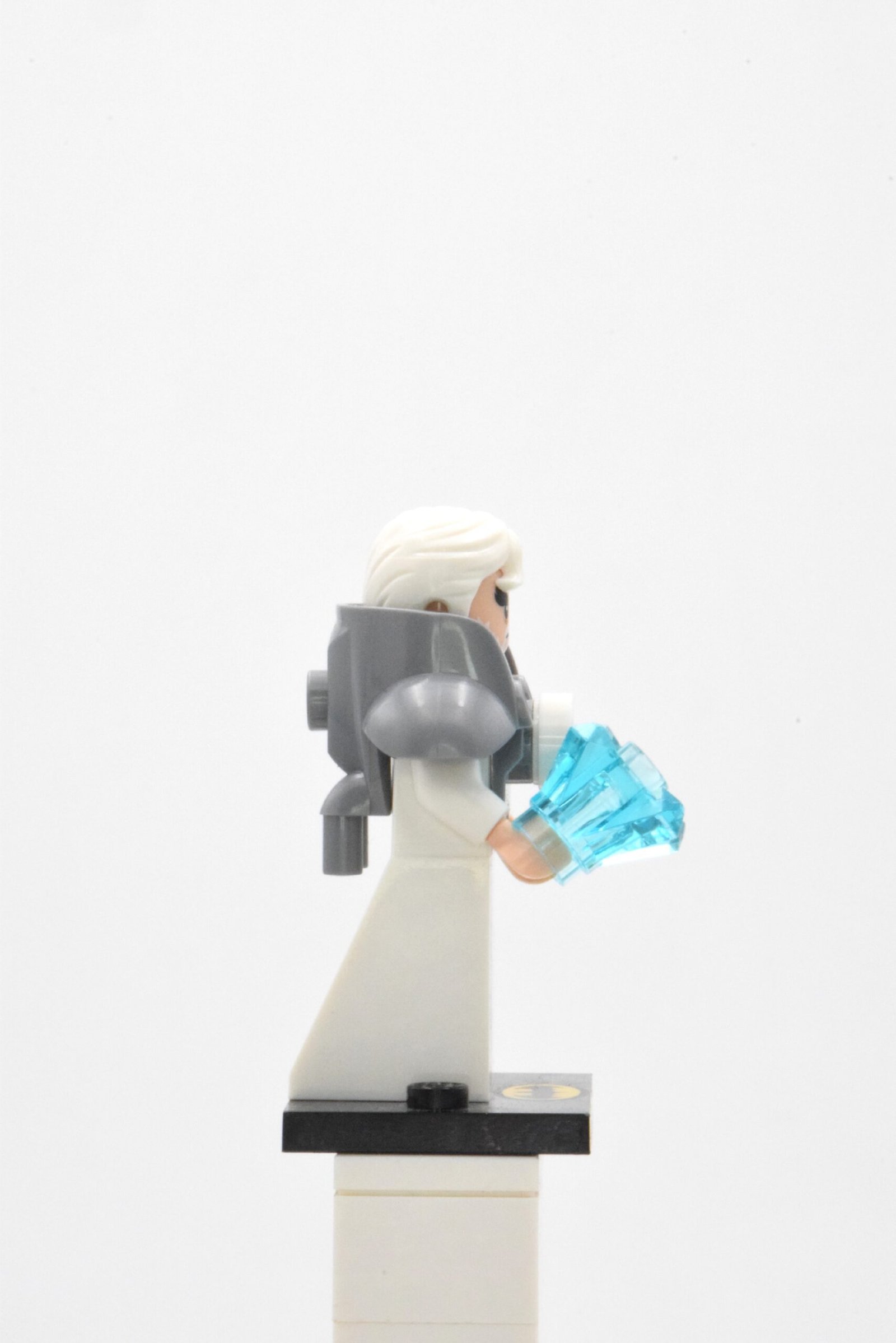 La minifig est également dotée d’une cape blanche translucide, une pièce unique qui lui confère un look presque spectral, tout en soulignant sa stature héroïque et son aura de sagesse. Cet accessoire iconique renforce l’aspect solennel du personnage, comme une apparition venue du passé.