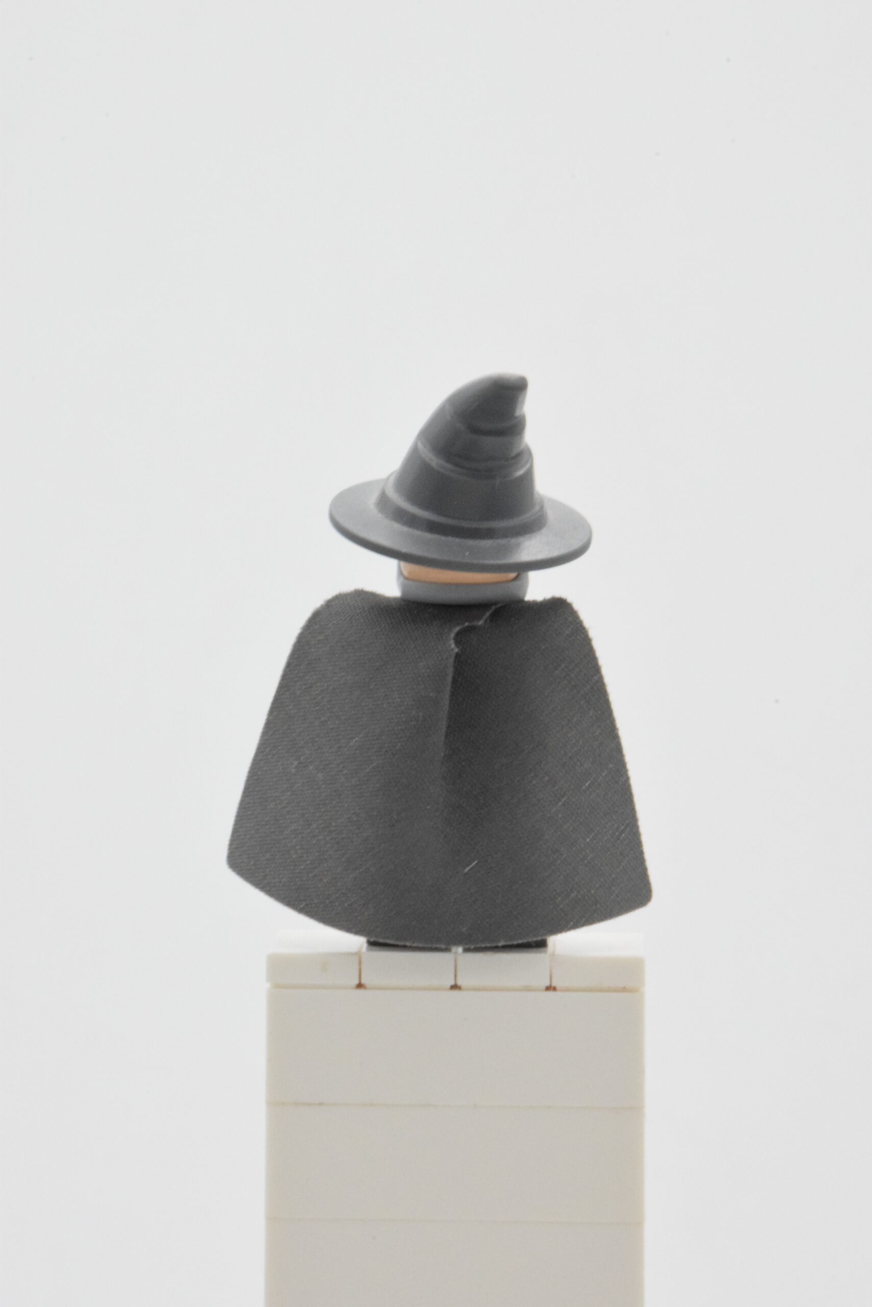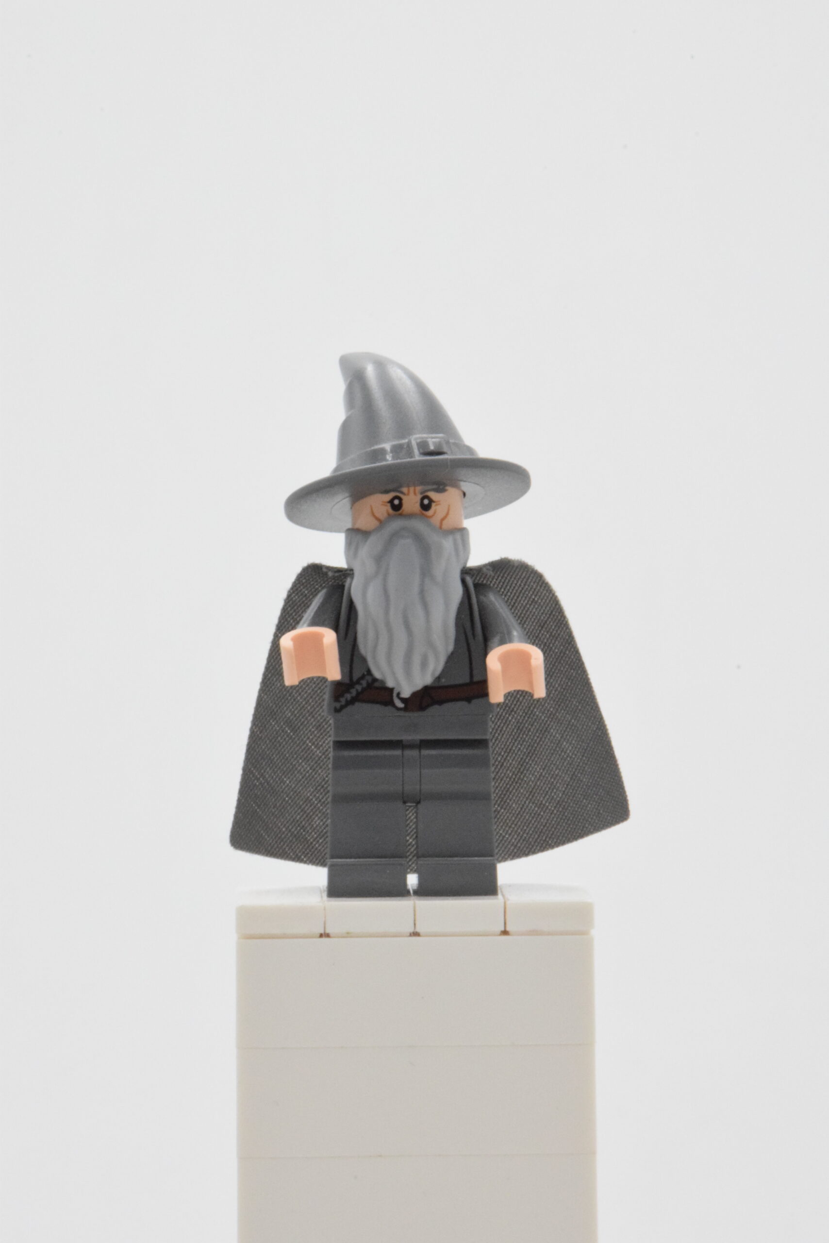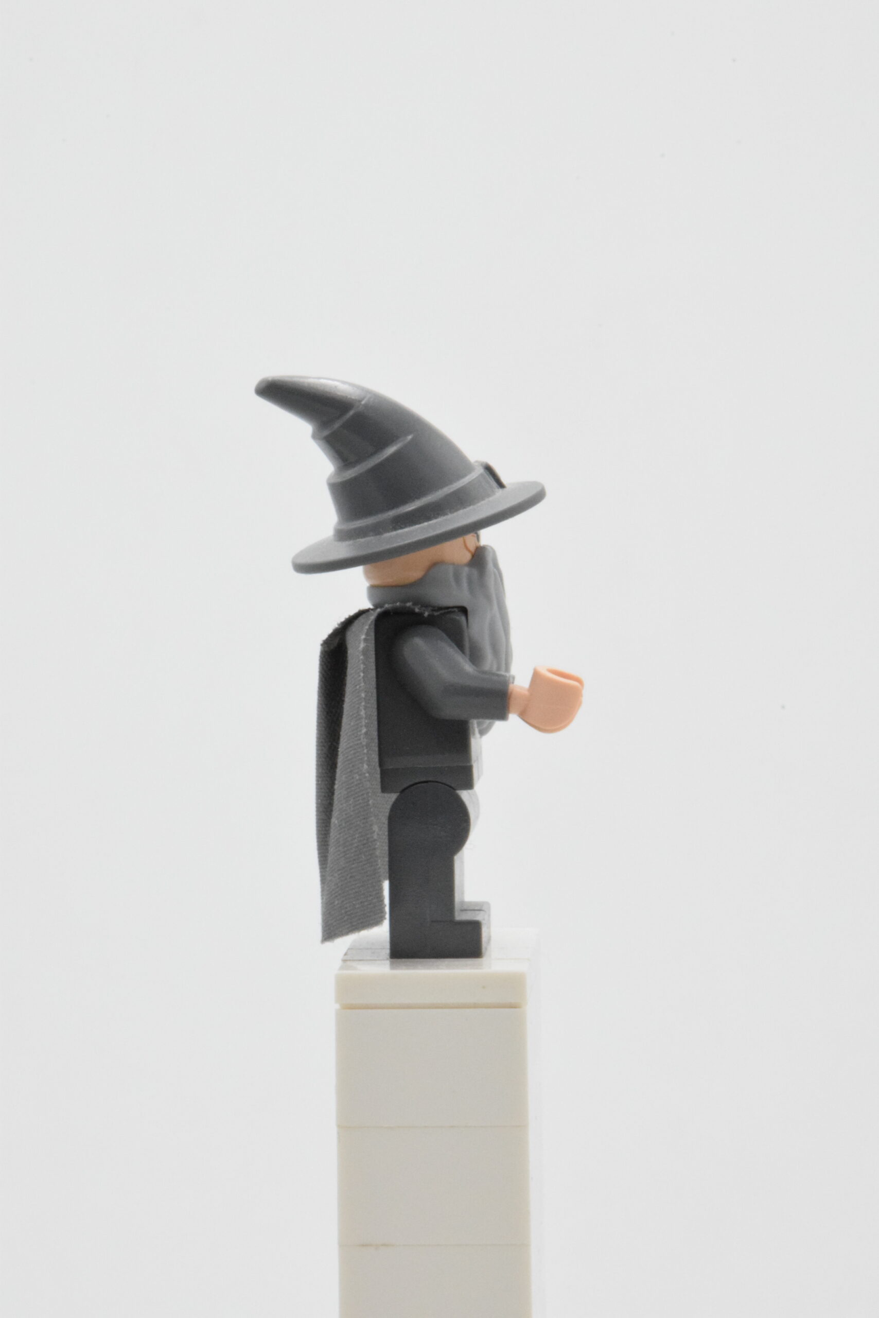 Ce Gandalf est conçu avec un visage affichant des rides et une barbe longue blanche, témoignant de sa sagesse et de ses nombreuses aventures à travers la Terre du Milieu. Son torse est orné de motifs de robe grise usée, fidèles aux films, soulignant une apparence qui a bravé le temps et les épreuves. Les jambes reprennent les nuances grises et les détails de texture de la cape qui semble repliée ou usée à certains endroits.