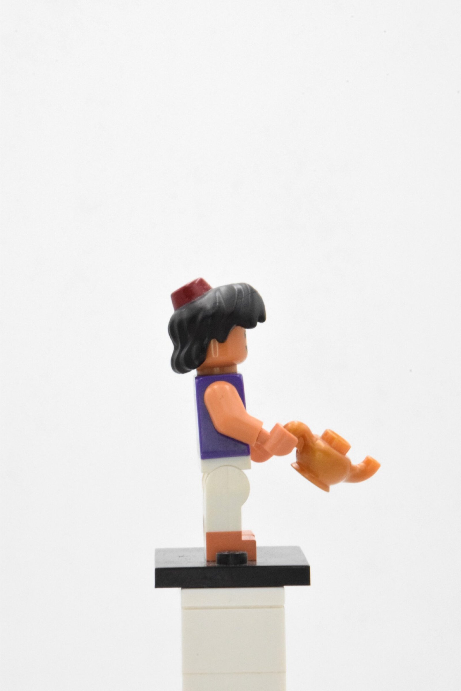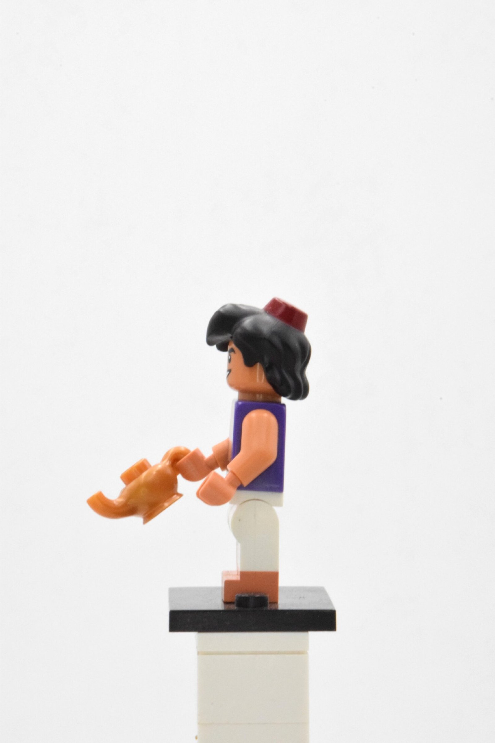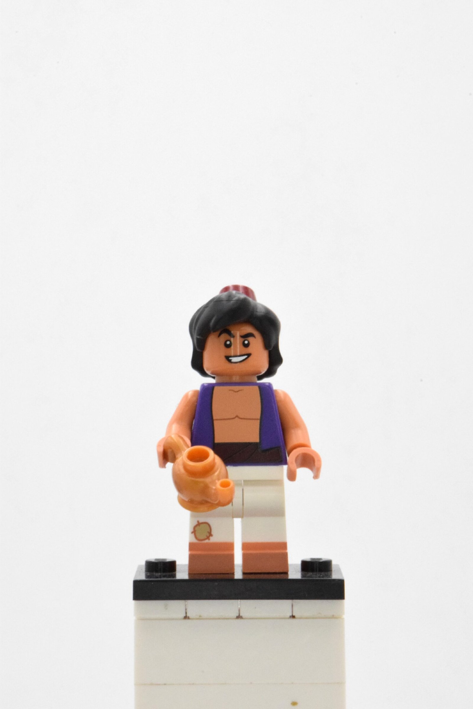 La minifigurine est accompagnée d’un accessoire incontournable : la lampe magique, élément central de l’histoire et symbole de sa rencontre avec le Génie. Cet accessoire doré lui permet de s’intégrer facilement dans des dioramas inspirés du palais du Sultan, du marché d’Agrabah ou de la Caverne aux Merveilles.