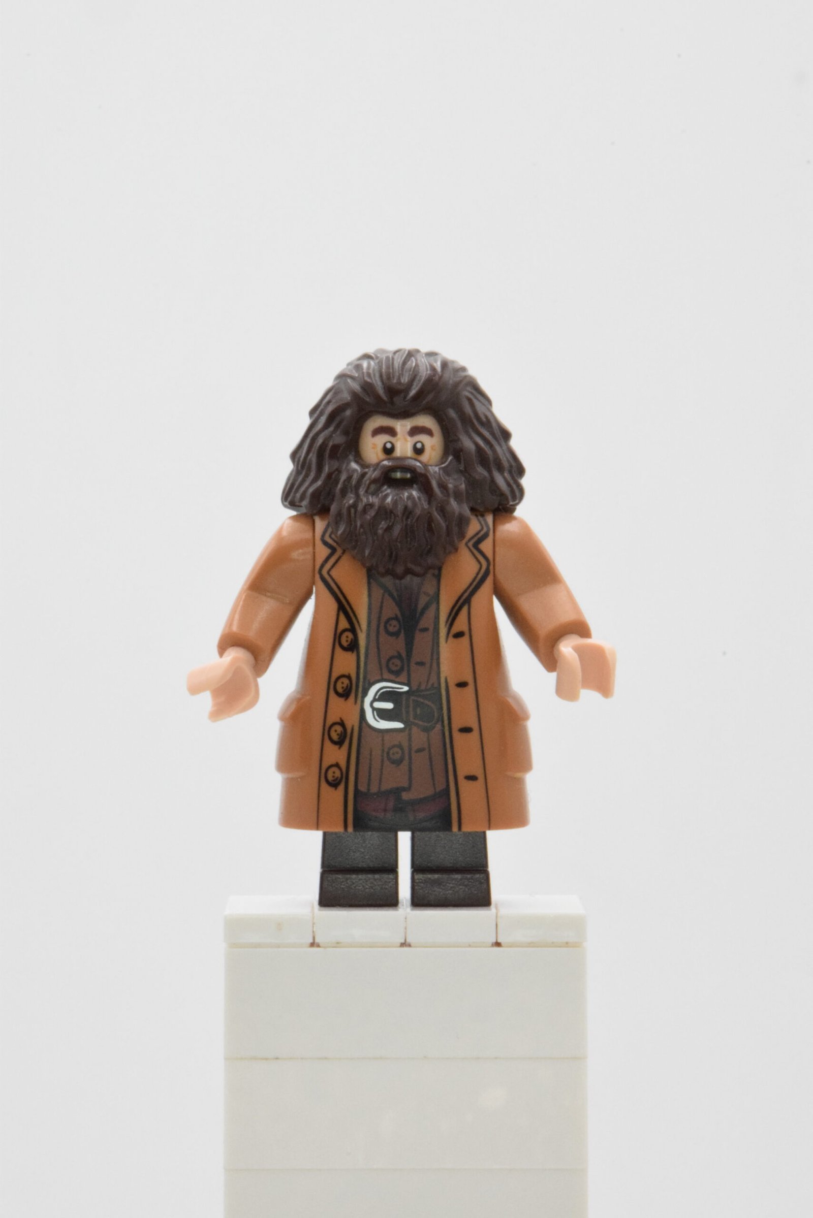 La figurine se distingue par sa stature imposante au format minifigure, avec un torse large, une barbe abondante et une chevelure épaisse soigneusement moulées. Son long manteau brun, richement imprimé, laisse apparaître une tenue détaillée qui renforce le réalisme et la profondeur visuelle de l’ensemble. Les expressions faciales retranscrivent parfaitement le caractère chaleureux et protecteur de Hagrid, tout en restant cohérentes avec le style LEGO.