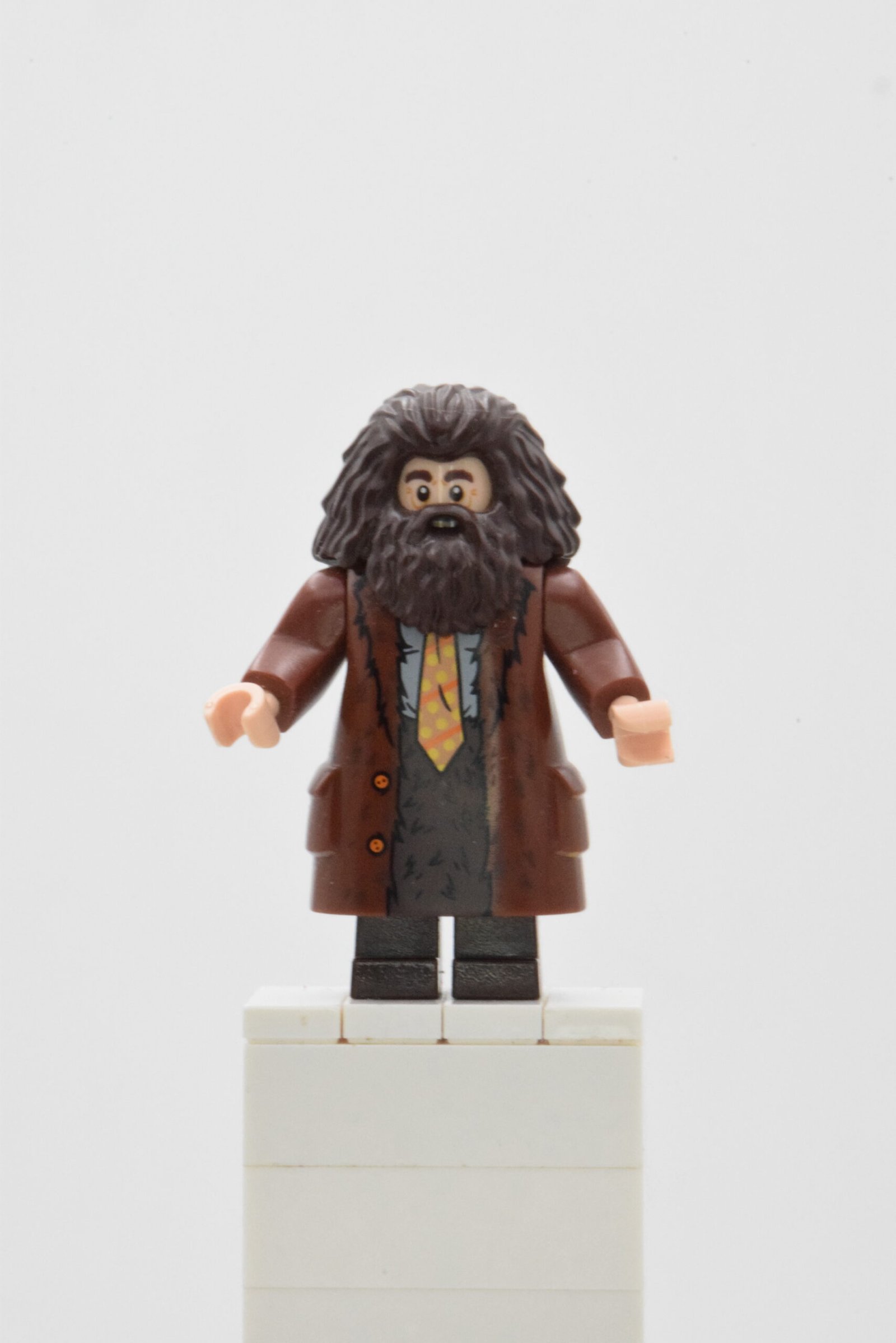 La figurine se distingue par un moulage spécifique de la barbe et des cheveux, apportant un fort relief et une excellente lisibilité visuelle. Son long manteau brun est richement décoré avec une impression détaillée, laissant apparaître une veste sombre et une cravate jaune à motifs, élément distinctif de cette version. Le visage exprime à la fois la bienveillance et la détermination de Hagrid, renforçant son identité dans l’univers LEGO Harry Potter.