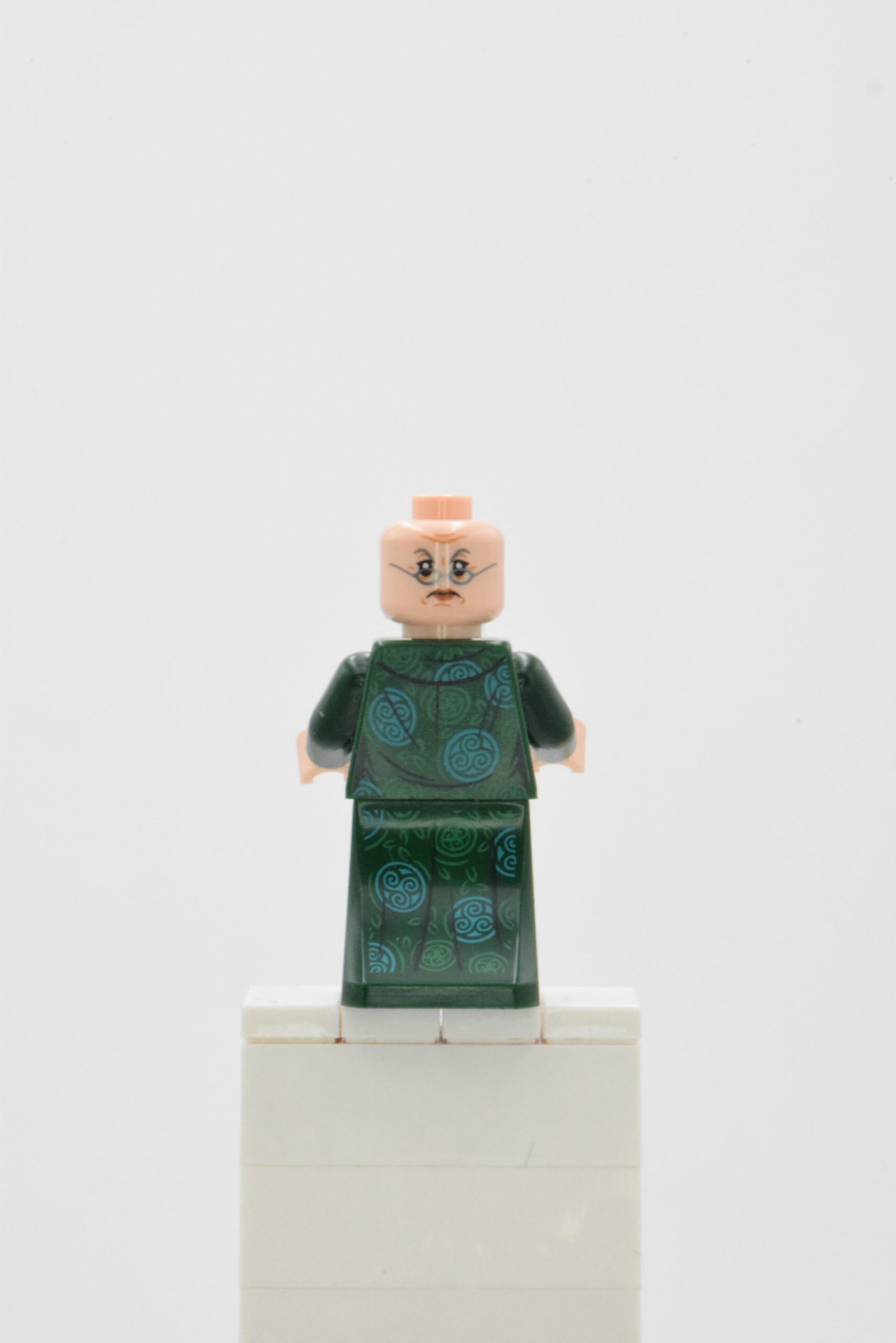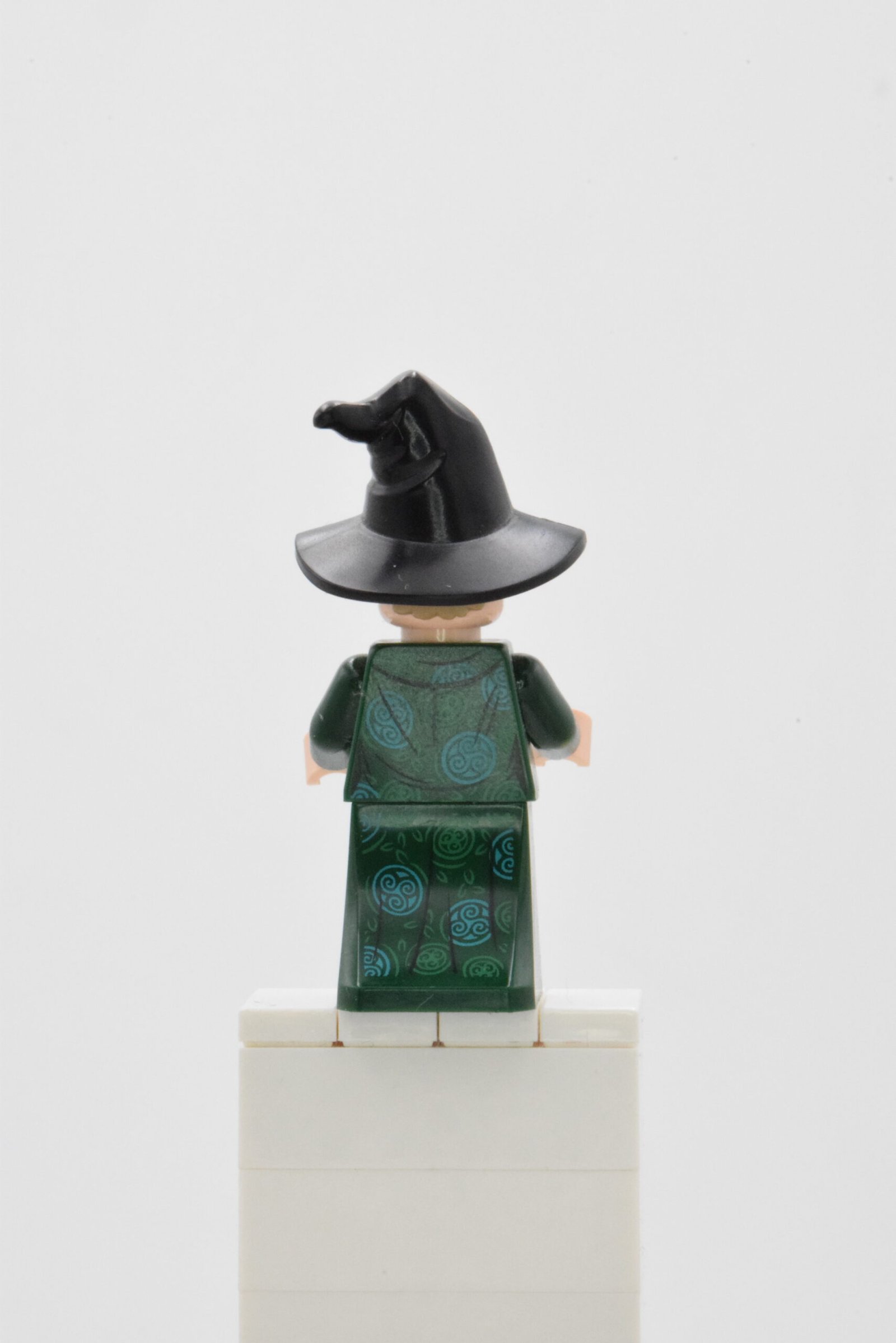 Cette version hp274 se distingue par un niveau de détail particulièrement soigné. Elle est équipée de son iconique chapeau de sorcière noir et d’un visage à double expression, permettant de varier les mises en scène entre sévérité professorale et bienveillance discrète. Sa tenue verte richement décorée de motifs élégants rappelle fidèlement les robes portées par le personnage dans les films. L’ensemble offre une silhouette immédiatement reconnaissable et parfaitement cohérente avec l’univers LEGO Harry Potter.