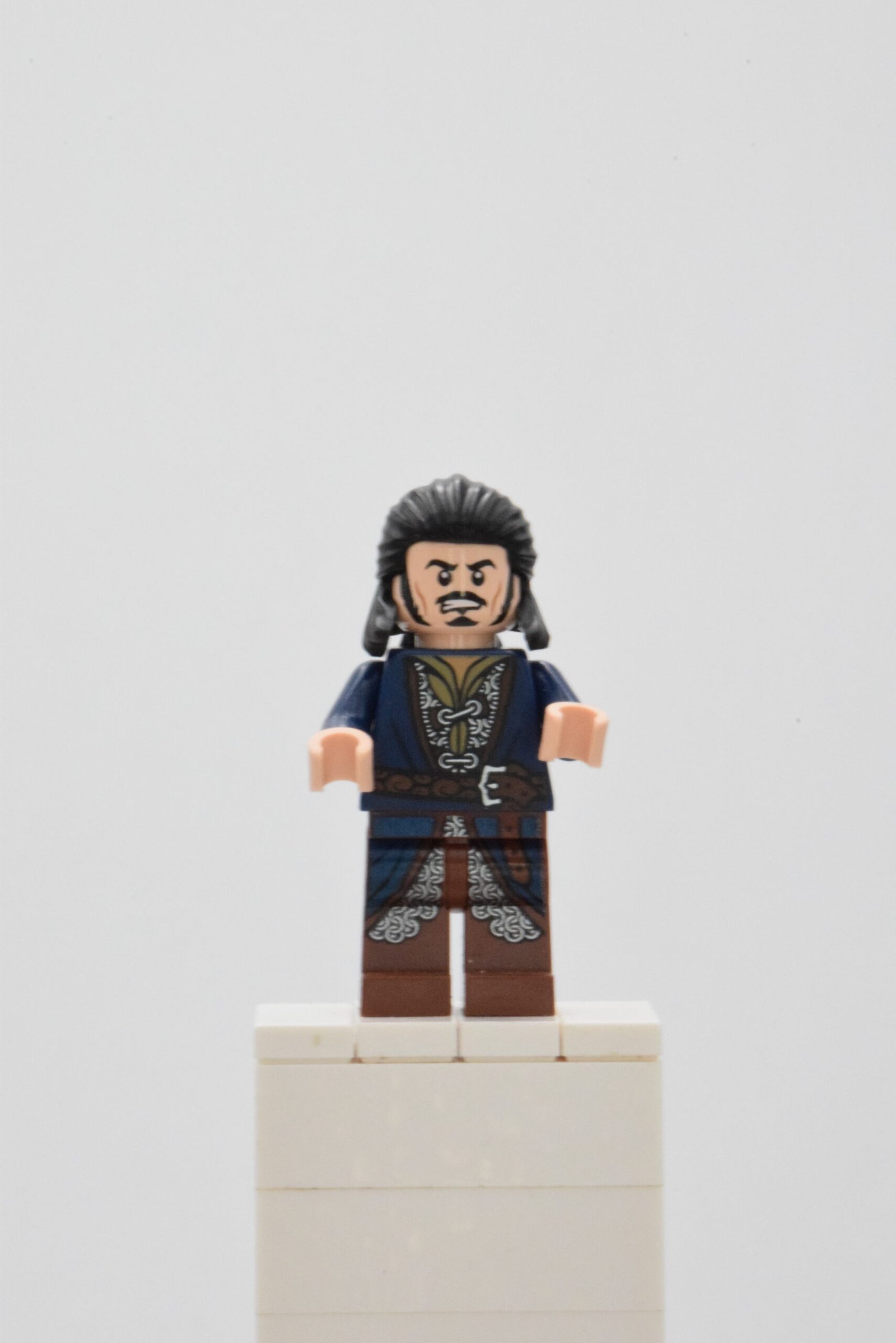 Sortie en 2013 dans le set LEGO 79013 – Lake-town Chase, cette figurine rare se distingue par son vêtement brun foncé et bleu orné de détails dorés et de ceintures imprimées. Son visage double expression — calme et concentré ou prêt au combat — illustre parfaitement la dualité du personnage : un père attentionné et un guerrier né.