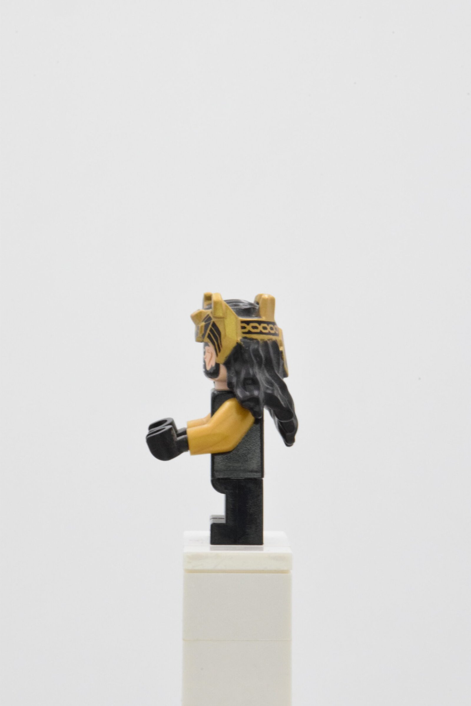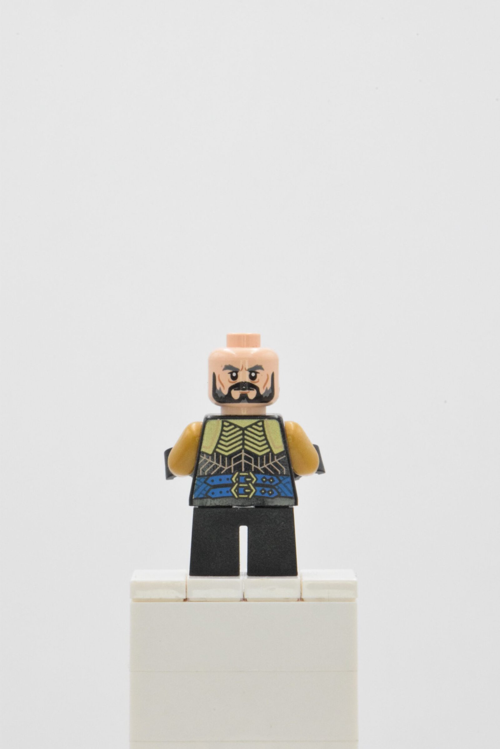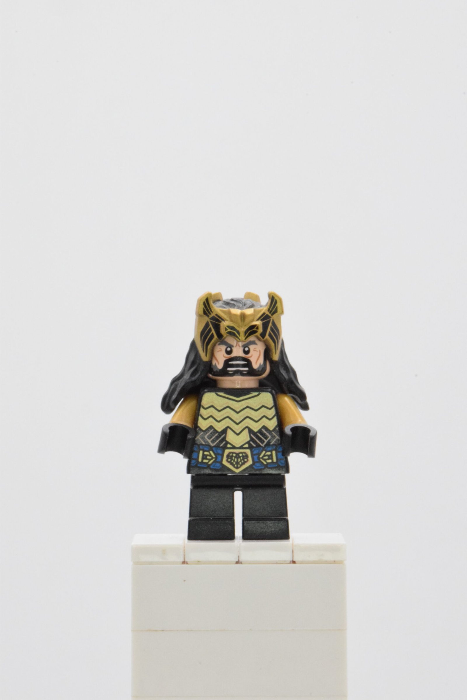 Le design de la figurine se distingue par un niveau de détail soigné. Le casque orné, aux motifs finement imprimés, évoque immédiatement la noblesse naine et le statut de roi en exil. Le visage expressif, encadré par une barbe caractéristique, apporte du réalisme et renforce l’identité du personnage. Les impressions du torse et des jambes reprennent les codes de l’armure et de la tenue de Thorin, avec des motifs géométriques et des teintes sombres qui soulignent son rôle de chef et de guerrier. L’ensemble offre une figurine équilibrée, visuellement forte et cohérente avec l’univers LEGO Le Seigneur des Anneaux.