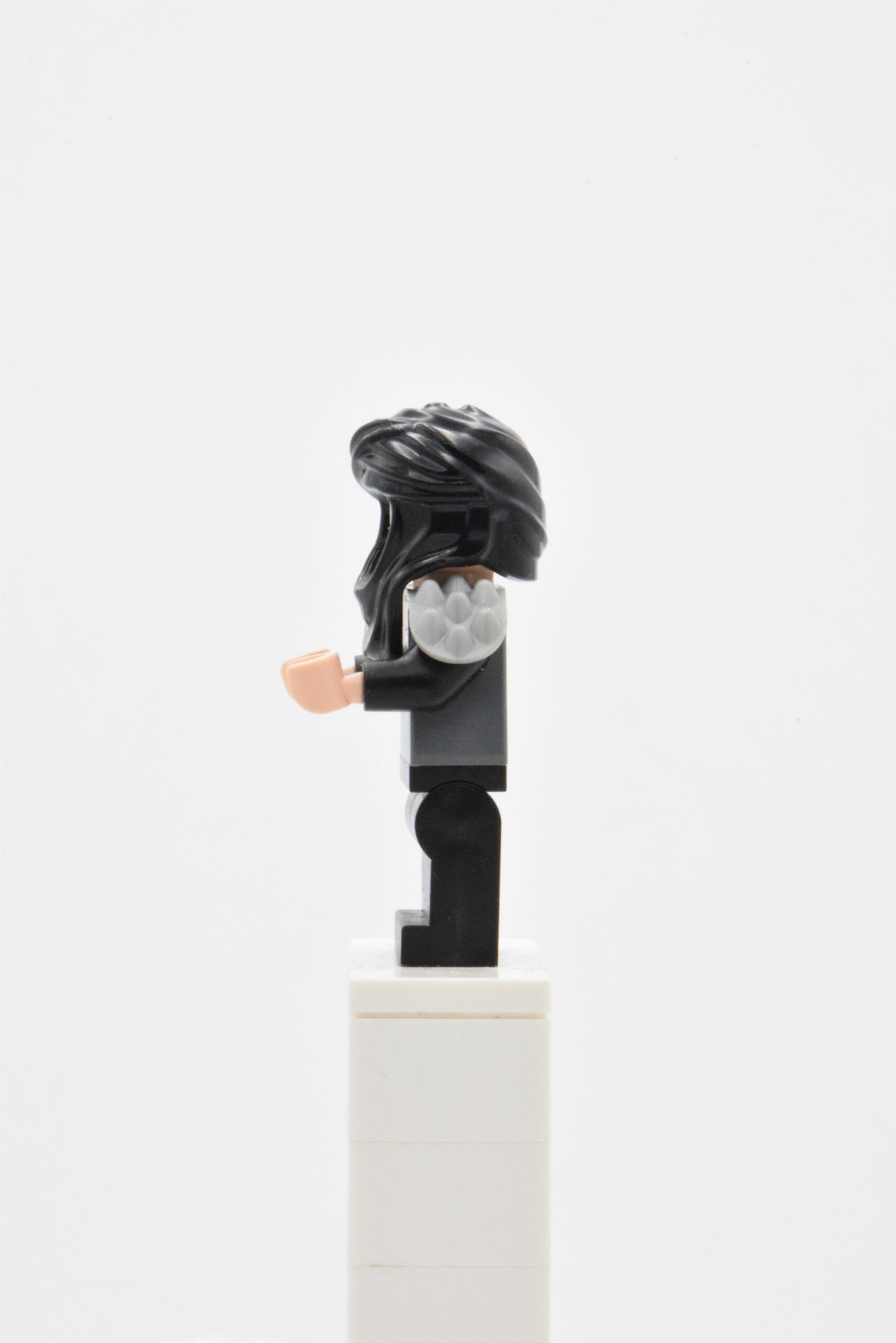 Il porte une tenue de guerrier noir et marron richement imprimée, avec un torse orné de sangles, de ceintures et de motifs évoquant l’équipement des combattants du désert. Ses jambes présentent des impressions complémentaires avec des protections et des tissus évoquant la tenue traditionnelle de la région. Sa tête affiche une expression déterminée et sérieuse avec une barbe épaisse, renforçant son allure robuste et expérimentée. Il est coiffé d’une chevelure moulée noire mi-longue légèrement ondulée. Setam est équipé d’une lame courbe LEGO, parfaite pour recréer des scènes de combat dynamiques et réalistes inspirées du film.