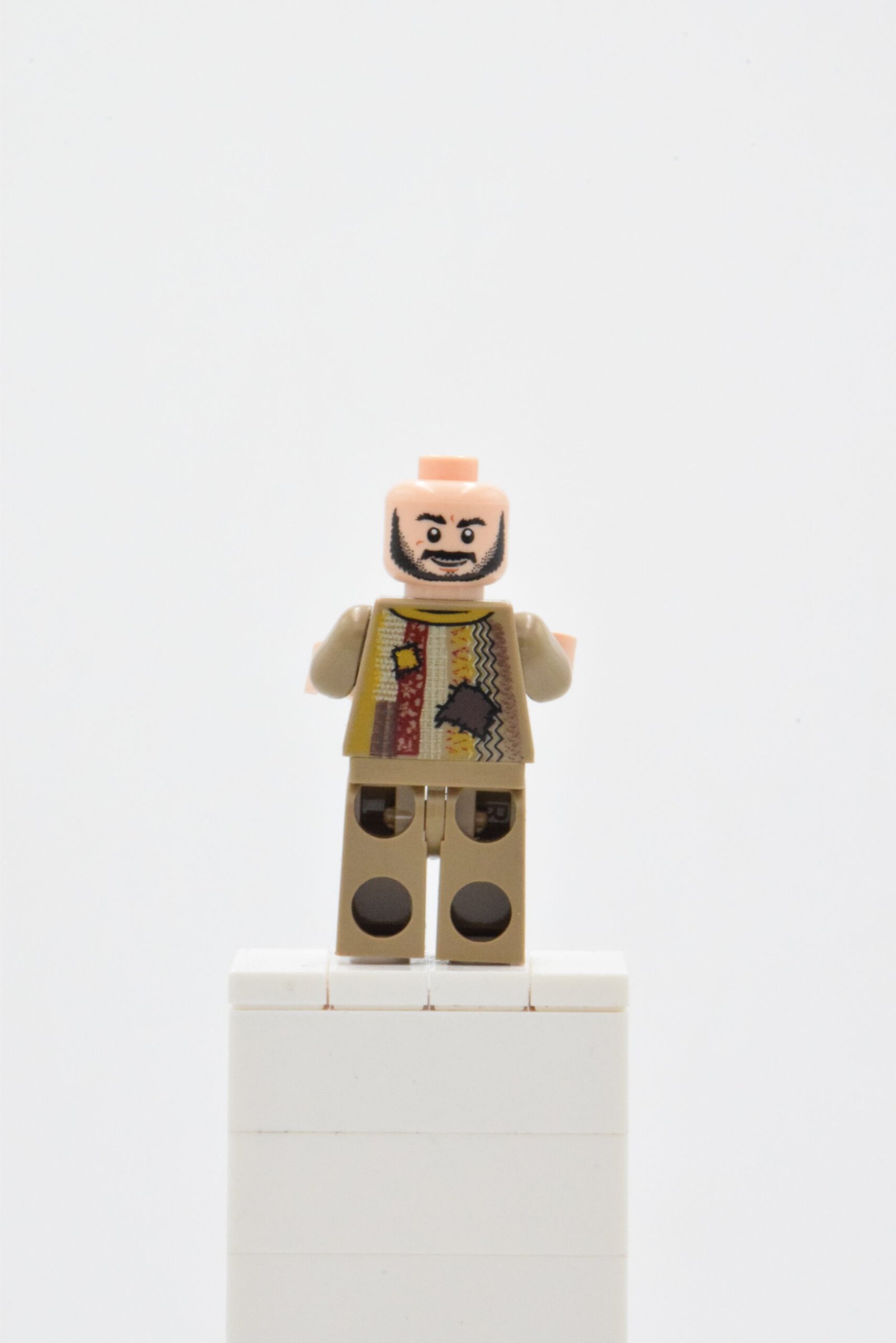 La figurine est dotée d’un torse richement imprimé avec une tunique beige et un gilet marron décoré de motifs orientaux. Ses jambes présentent des détails de tissus plissés, évoquant la mode des marchés et des dunes du désert. Sa tête affiche un visage souriant avec une moustache distinctive et un air malicieux, fidèle au personnage dans le film. Il porte une coiffe moulée unique, un turban noir et beige qui accentue son allure exotique et son rang de marchand astucieux. En accessoire, Sheik Amar est souvent associé à des animaux comme des chameaux ou des fouets dans les sets, renforçant son rôle de marchand au cœur de l’intrigue.