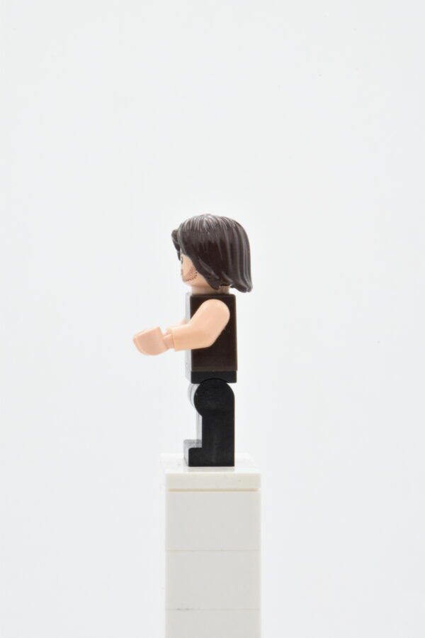 Il porte une tenue de guerrier détaillée avec un torse imprimé montrant son plastron en cuir marron, ses sangles et ceintures, ainsi que des protections évoquant son rôle d’aventurier du désert. Ses jambes présentent des motifs de tissus et d’armure pour un look authentique. Sa tête propose un visage déterminé avec un sourire confiant, et il est coiffé d’une chevelure noire moulée mi-longue, fidèle à son apparence dans le film. il est équipé d’une épée argentée LEGO, rappelant la Dague du Temps, son arme emblématique et élément central de l’histoire.