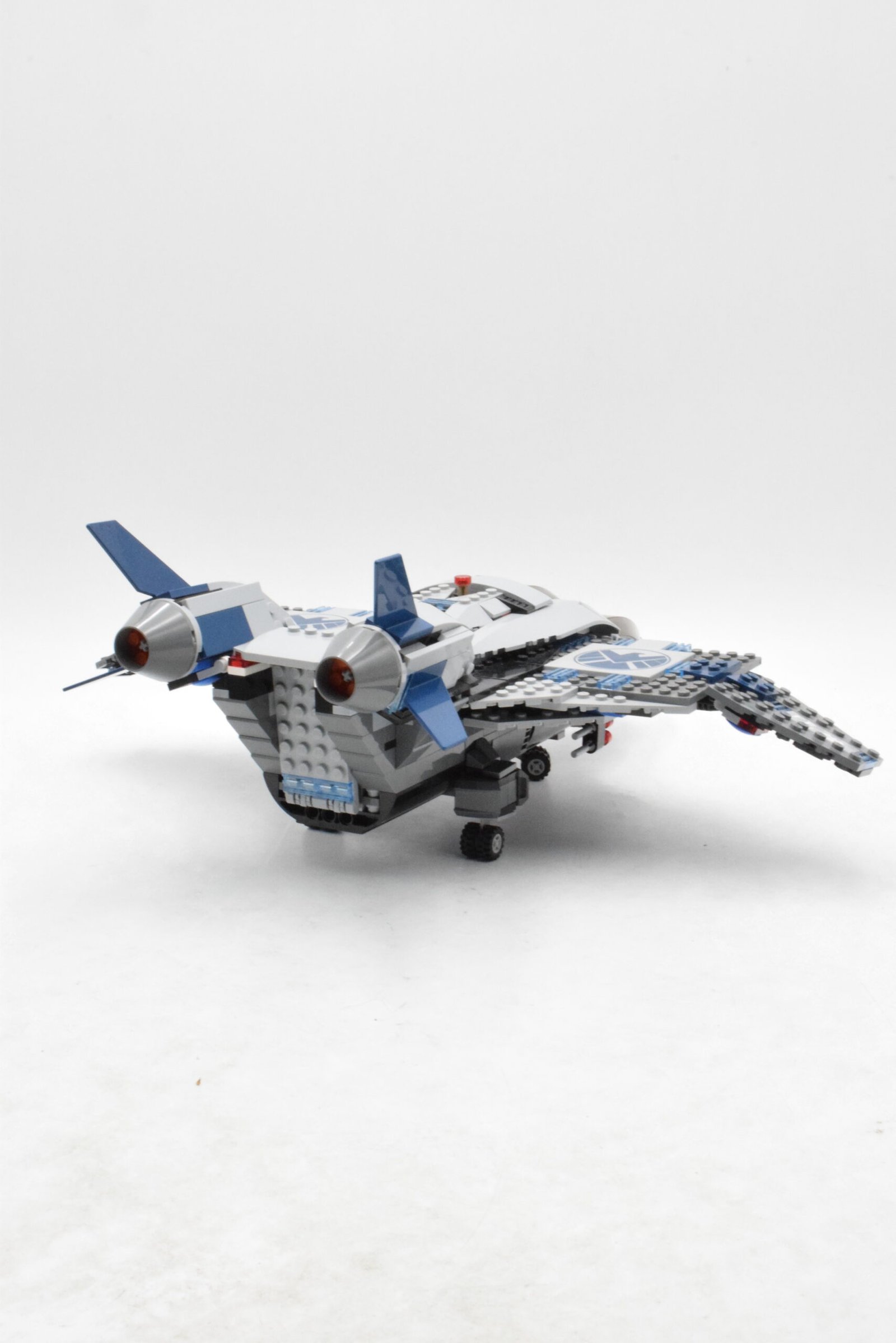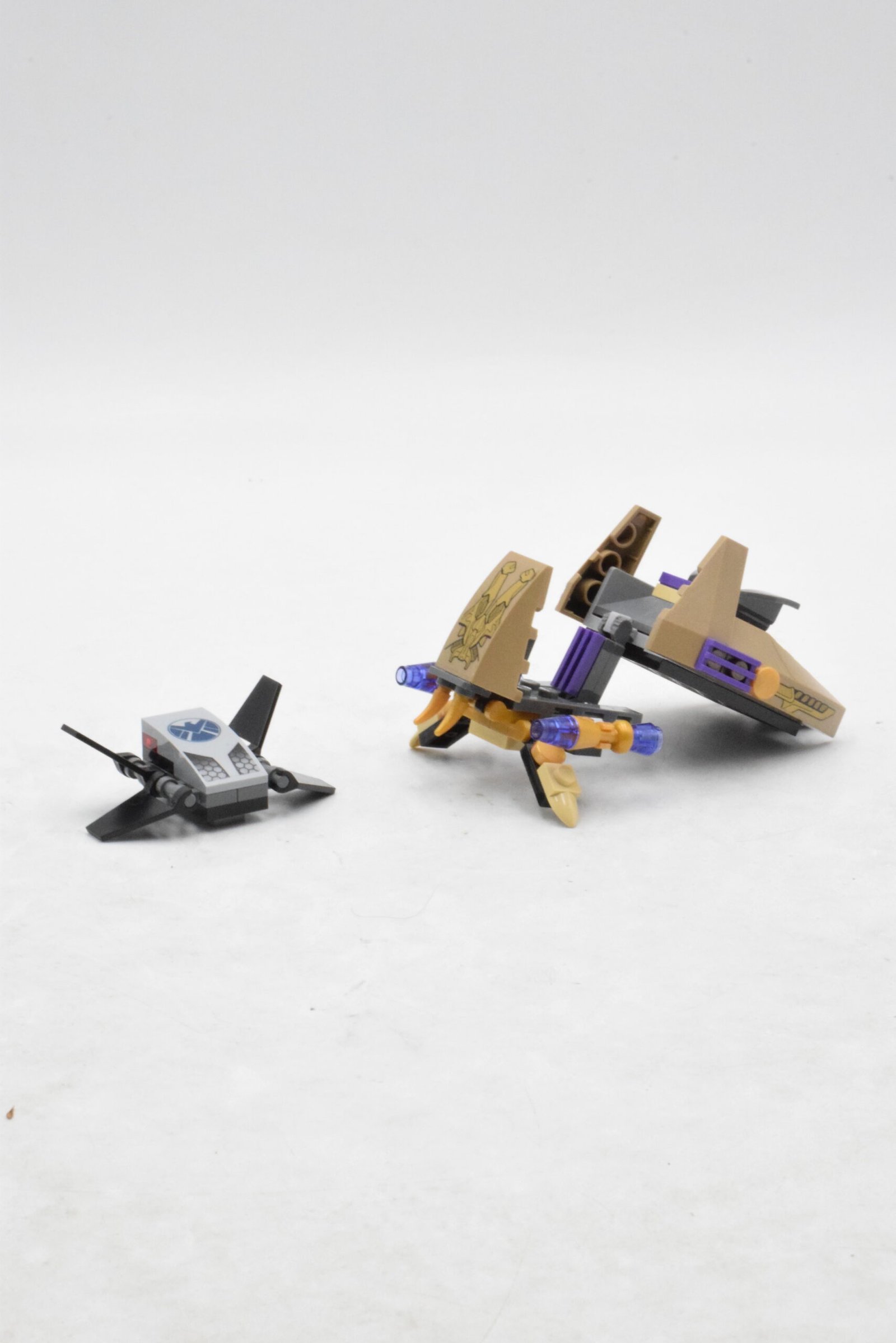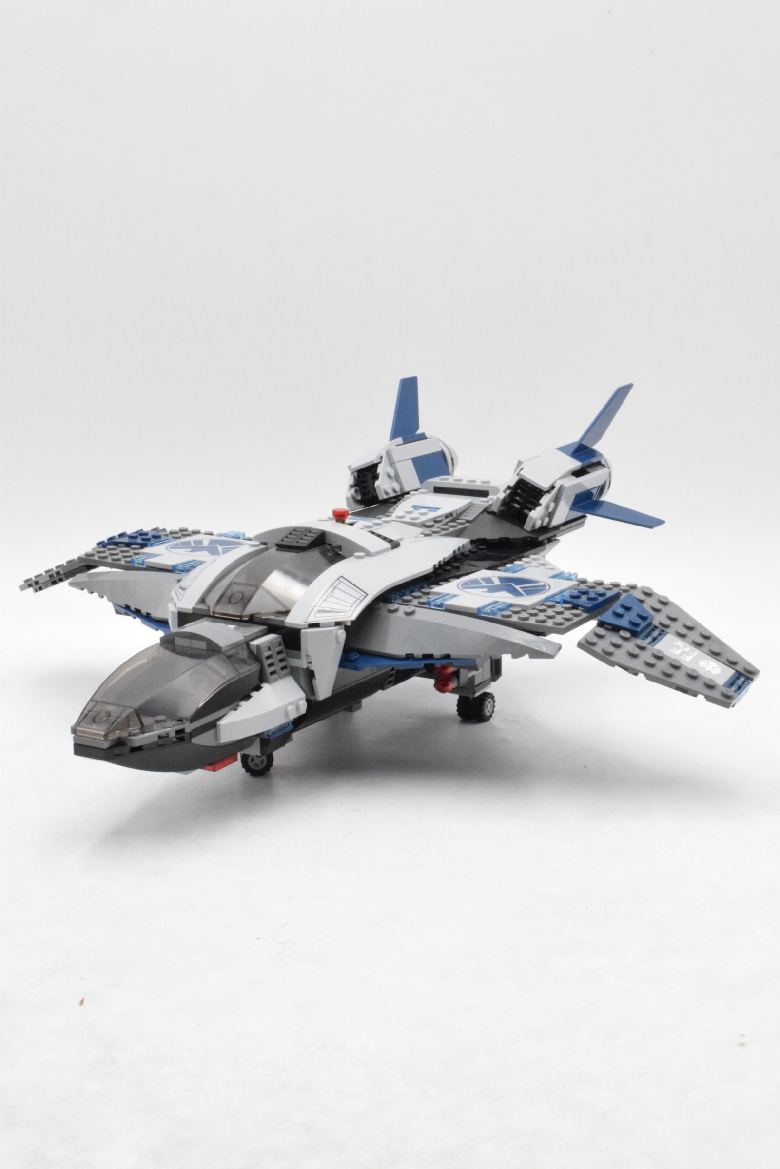 Le Quinjet adopte une silhouette aérodynamique fidèle au film, avec une verrière transparente ouvrante, des ailes profilées et des moteurs latéraux bien proportionnés. La construction privilégie la jouabilité grâce à des lance-missiles intégrés et un cockpit accessible permettant d’installer les figurines. Les couleurs gris, noir et transparent fumé renforcent l’aspect technologique du vaisseau des Avengers.