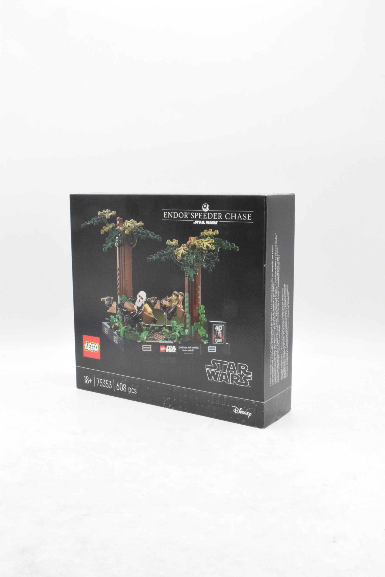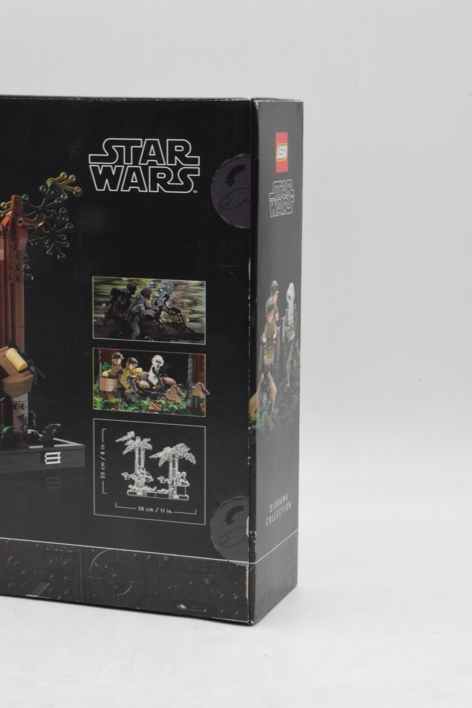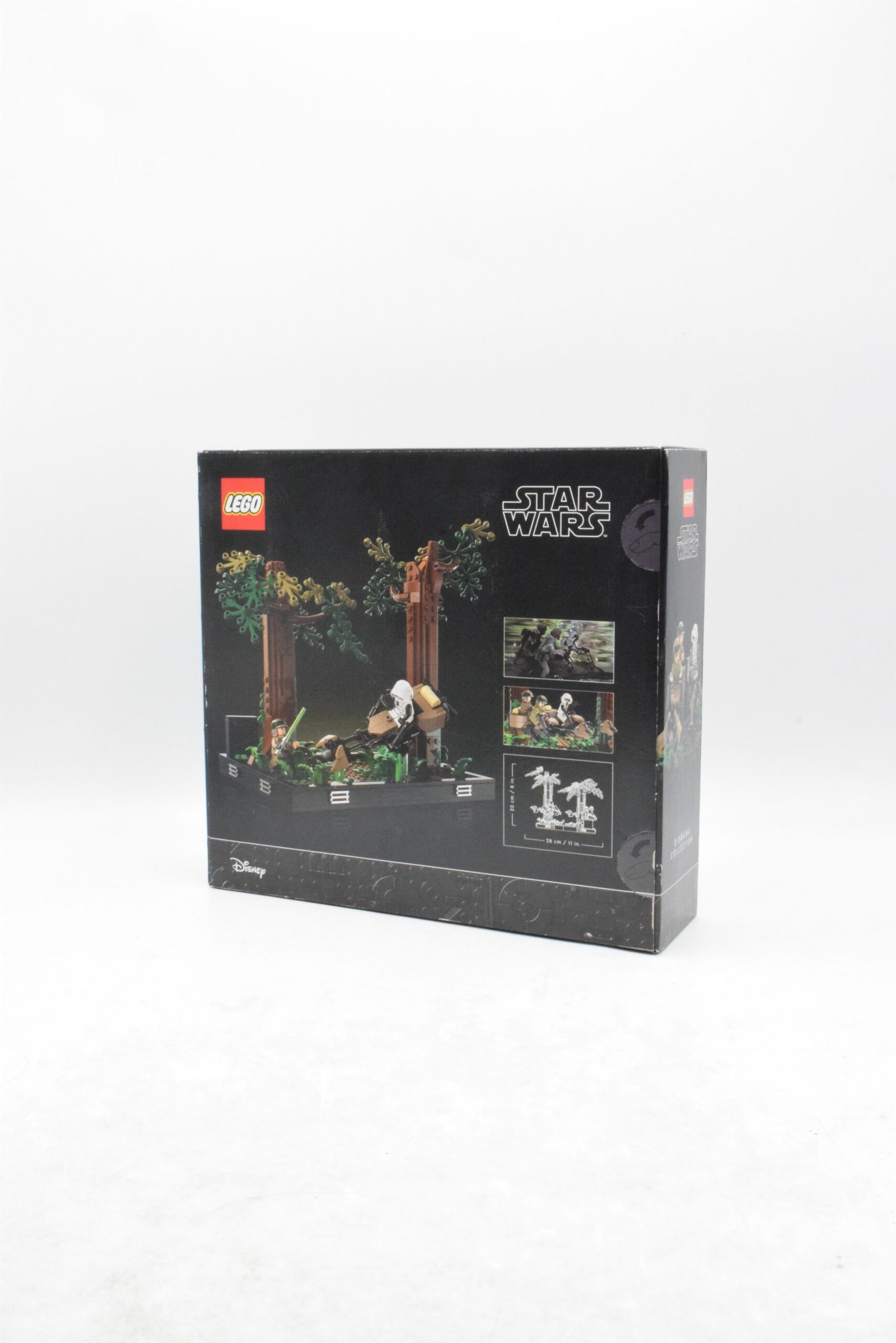 - Le Diorama de la course-poursuite en speeder sur Endor™ (75353) se pose facilement en vitrine grâce à une largeur annoncée au-delà de 28 cm.
