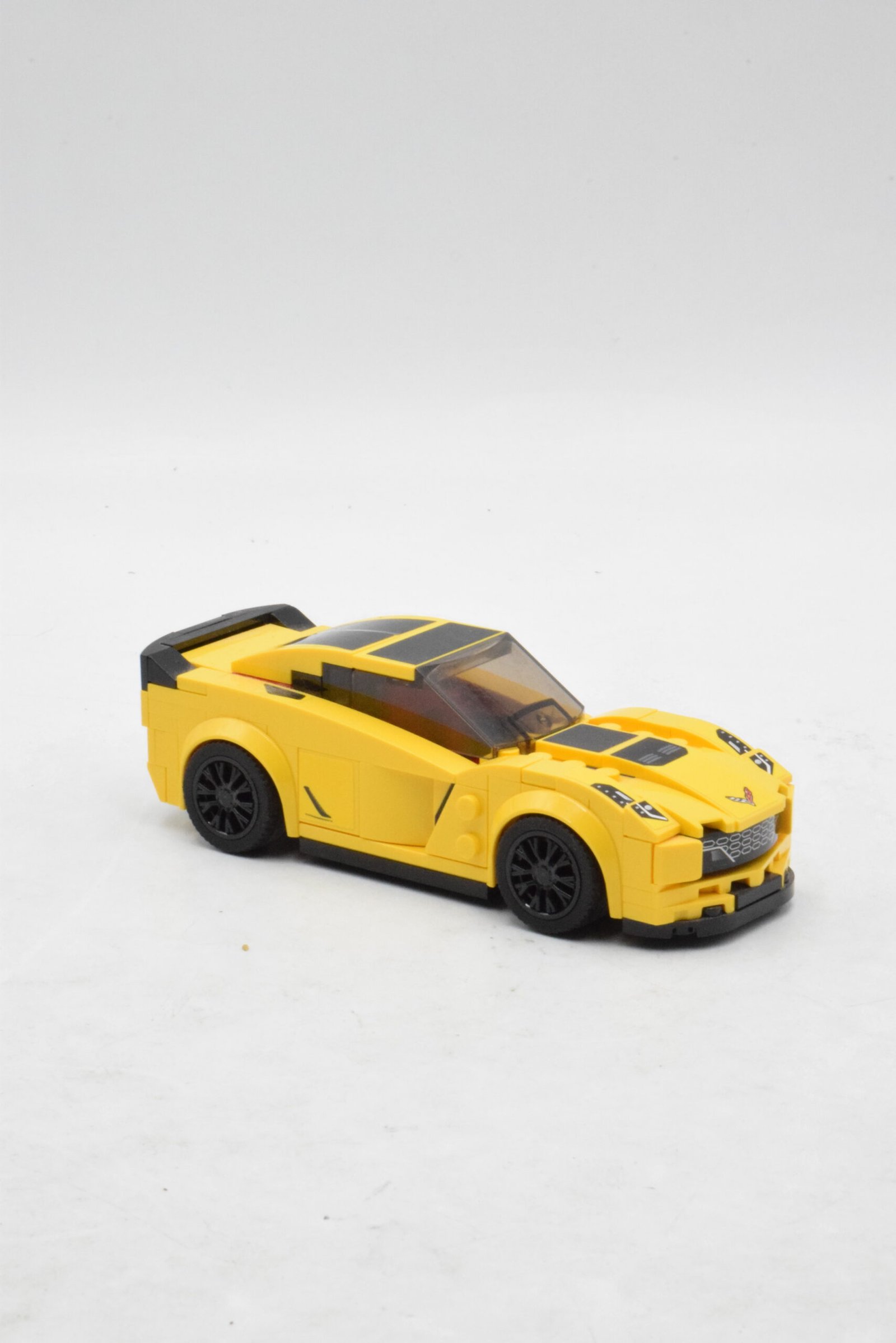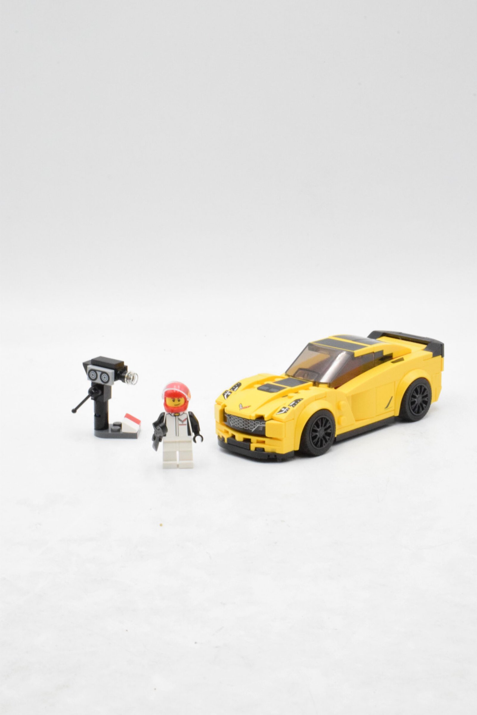 Le modèle numéro 75870, Chevrolet Corvette Z06, reprend très efficacement les grandes lignes de la sportive américaine dans un format mini très propre visuellement. La construction mise sur une carrosserie basse, un habitacle accessible, un pare-brise amovible et 2 jeux de jantes interchangeables, ce qui permet de varier un peu le style de la voiture sans compliquer inutilement l’ensemble. Le set inclut aussi quelques accessoires de mise en scène, dont un casque, une clé et une caméra TV, qui donnent tout de suite un contexte de paddock ou de tournage automobile.