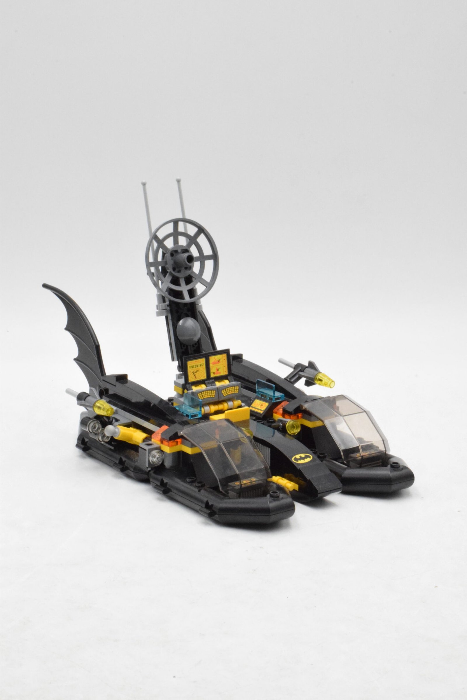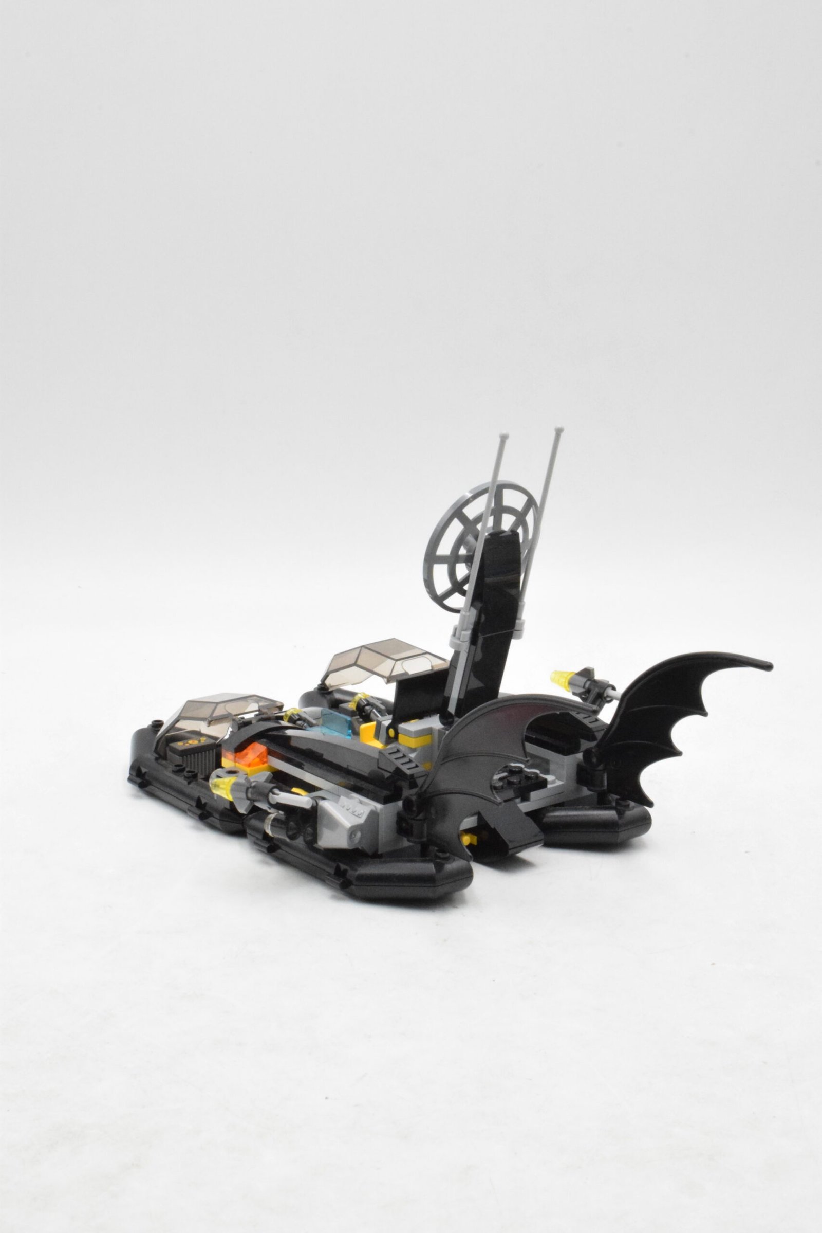 Le kit numéro 76034 met en scène une poursuite sur l’eau bien plus riche qu’un simple duo de véhicules. Le Batboat combine une silhouette “héros” très marquée (grandes ailes, logo, éléments transparents) et une vraie logique de jeu, avec cockpits ouvrants, lanceurs et une tour radar qui se déploie pour suivre la cible.
