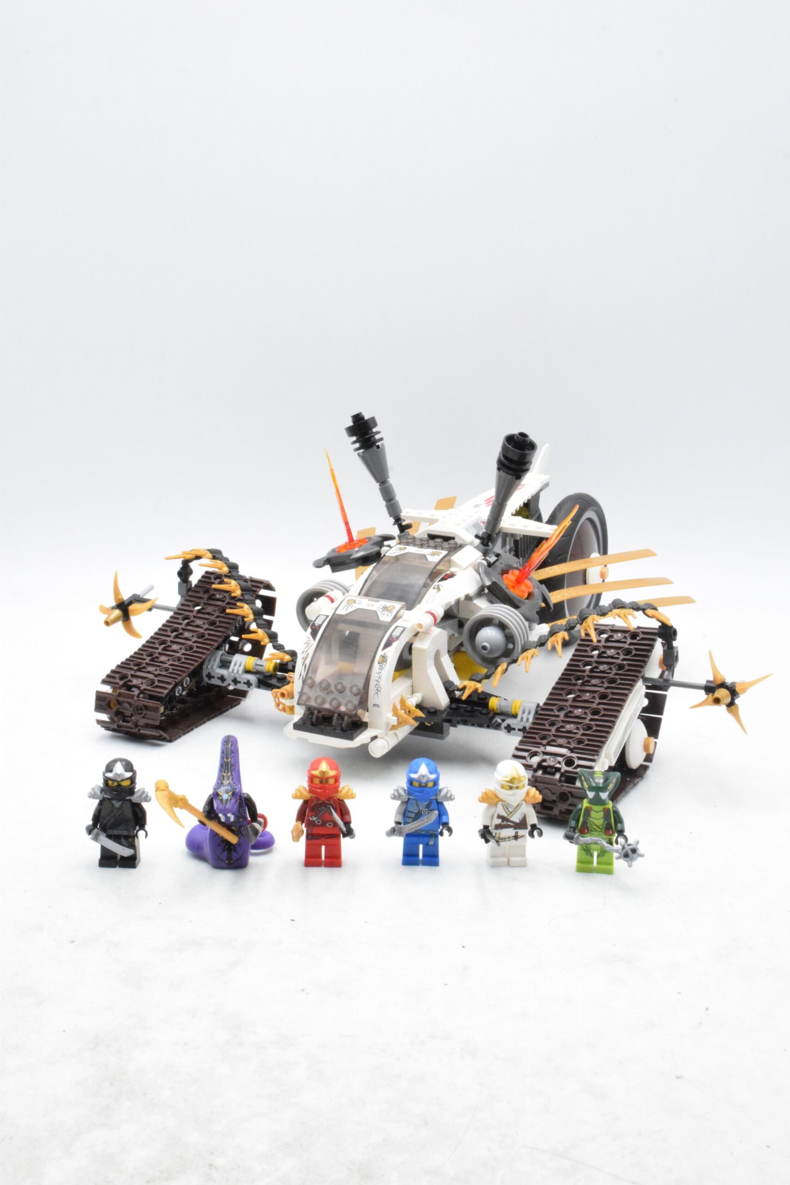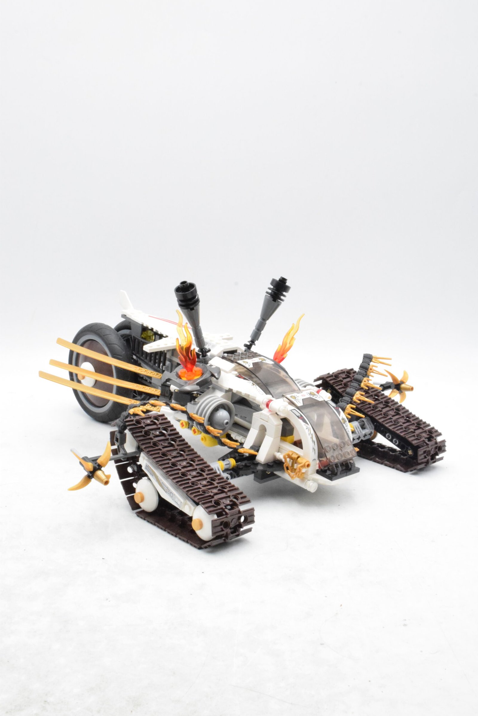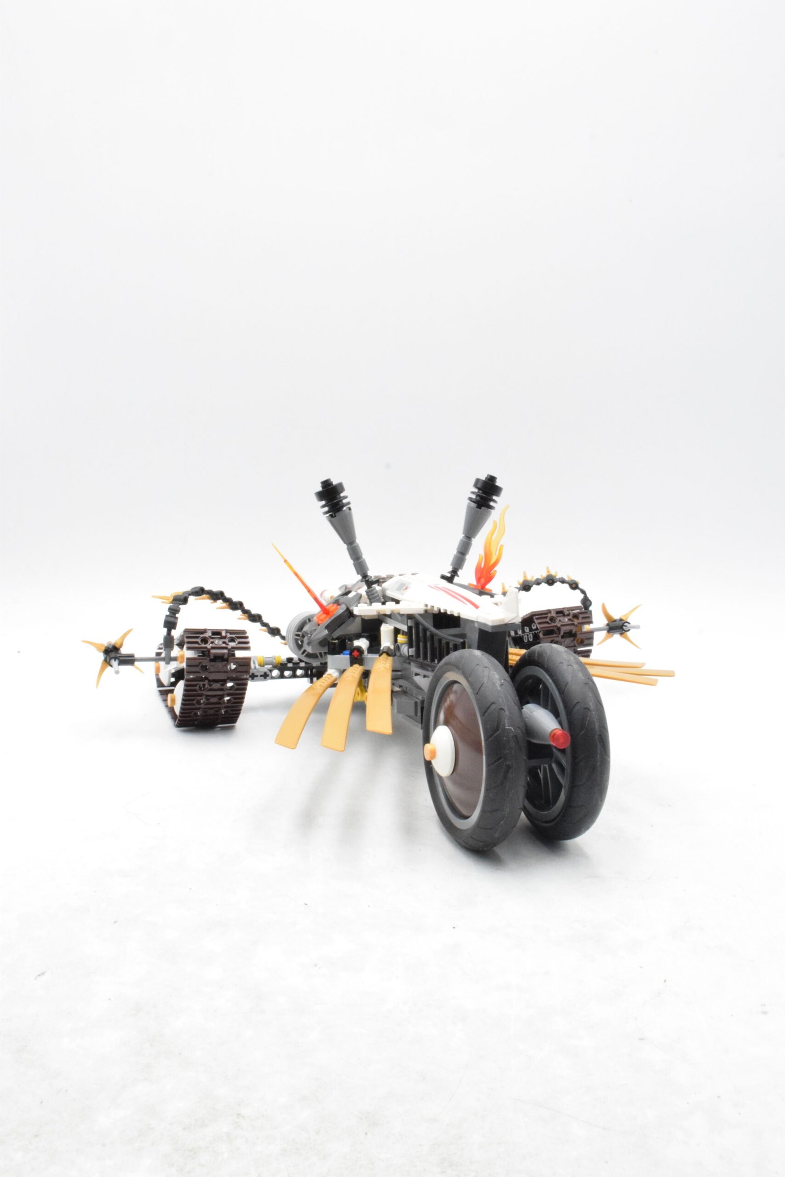 Le set numéro 9449 repose sur une idée de construction très efficace : rassembler en un seul ensemble un gros véhicule terrestre blindé et un appareil volant capable de se détacher en cours de jeu. Dans Le tout-terrain ultrasonique, les cockpits ouvrants, les chenilles, le volant fonctionnel, les ailes-lames extensibles, les missiles dorés et la prison mobile créent une machine visuellement dense, qui traduit bien l’esprit spectaculaire de la vague Ninjago de 2012.