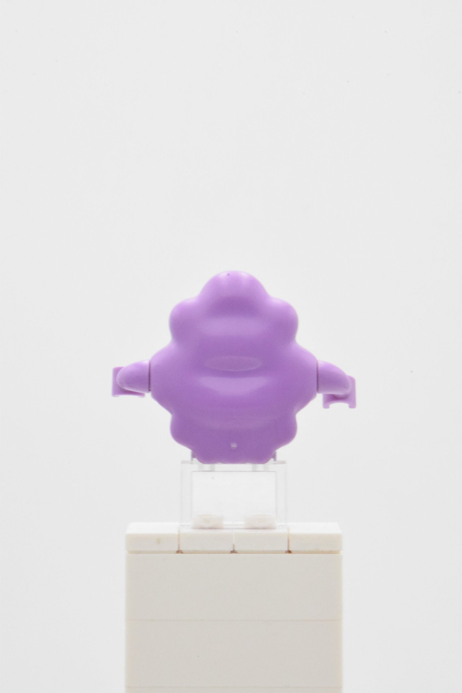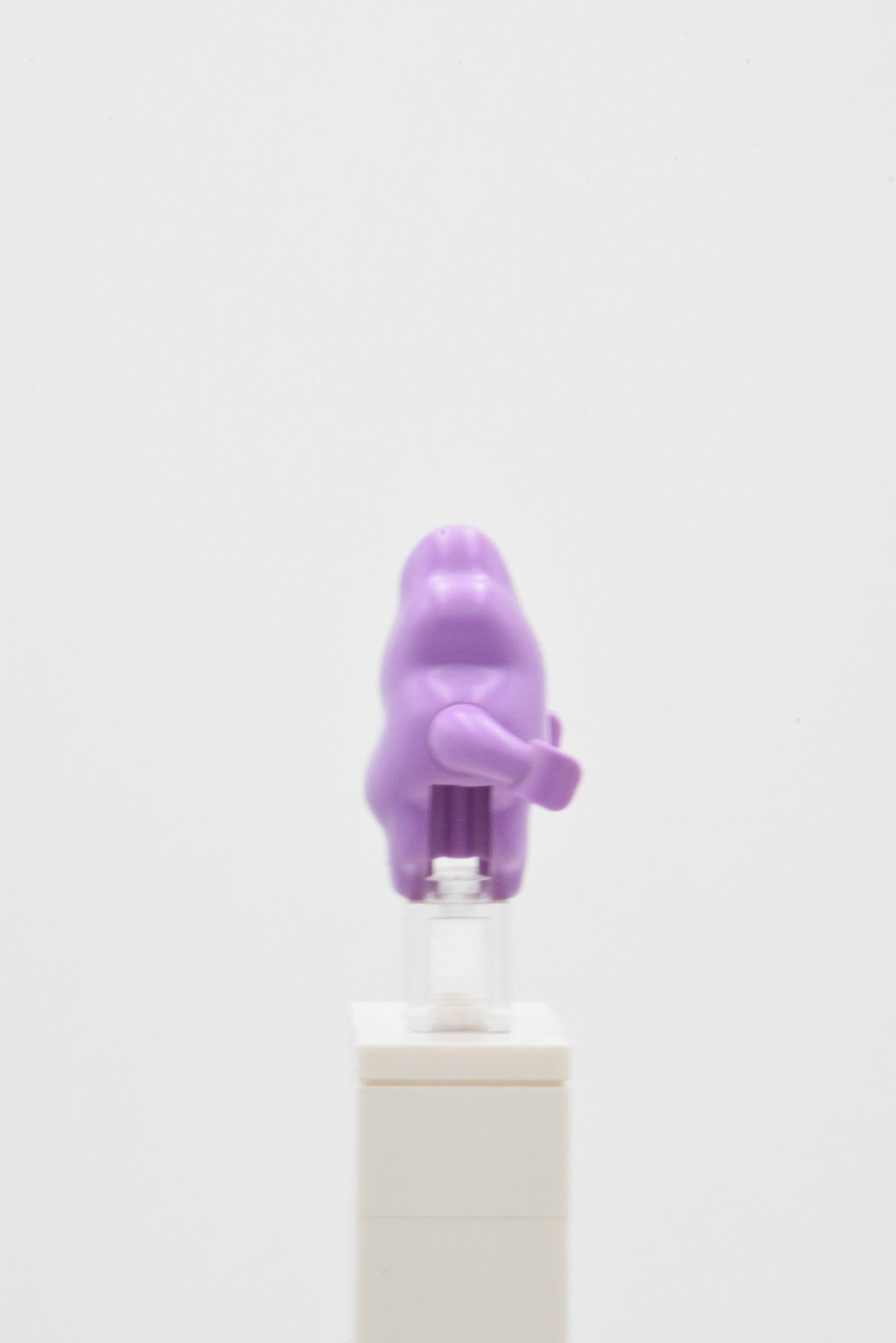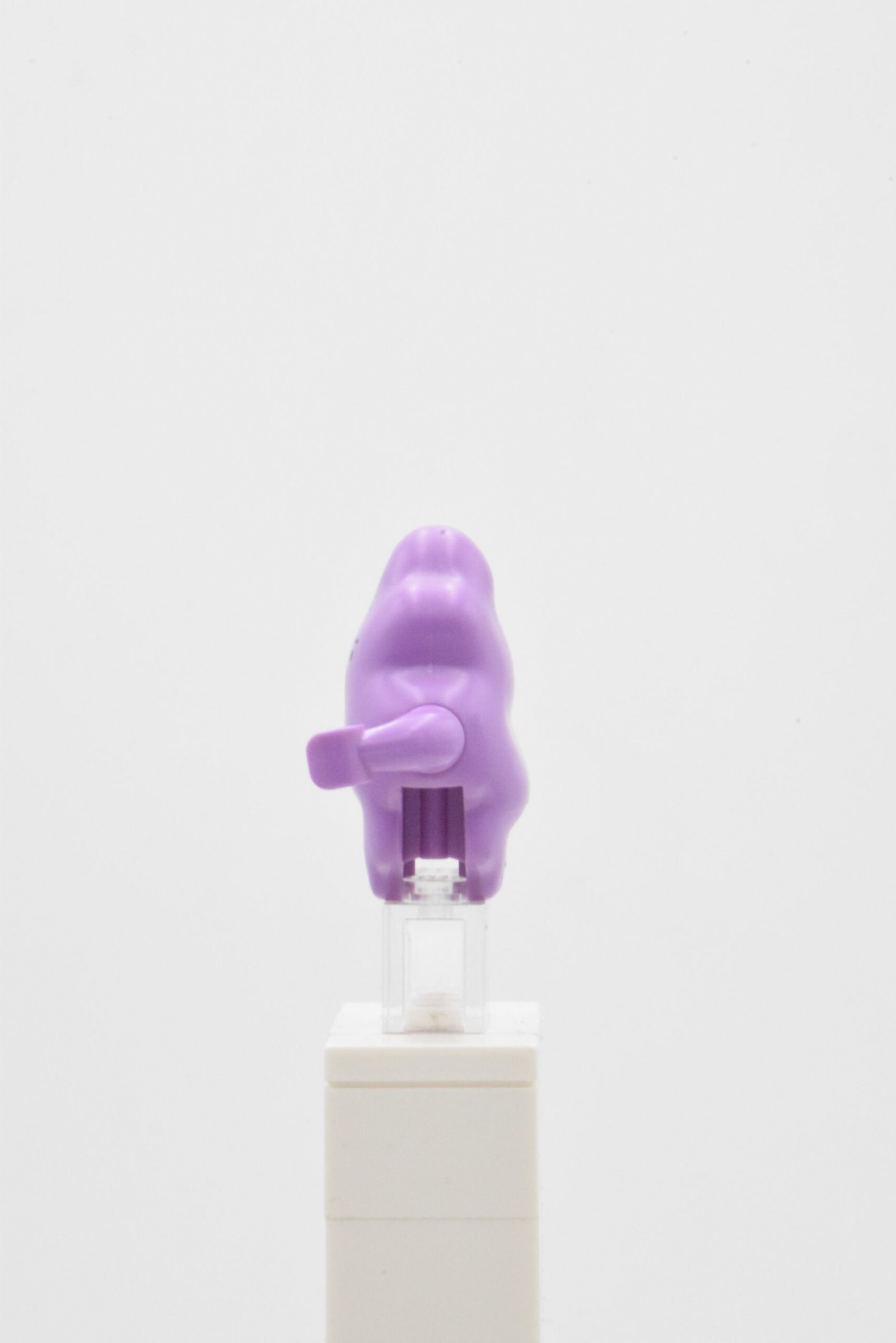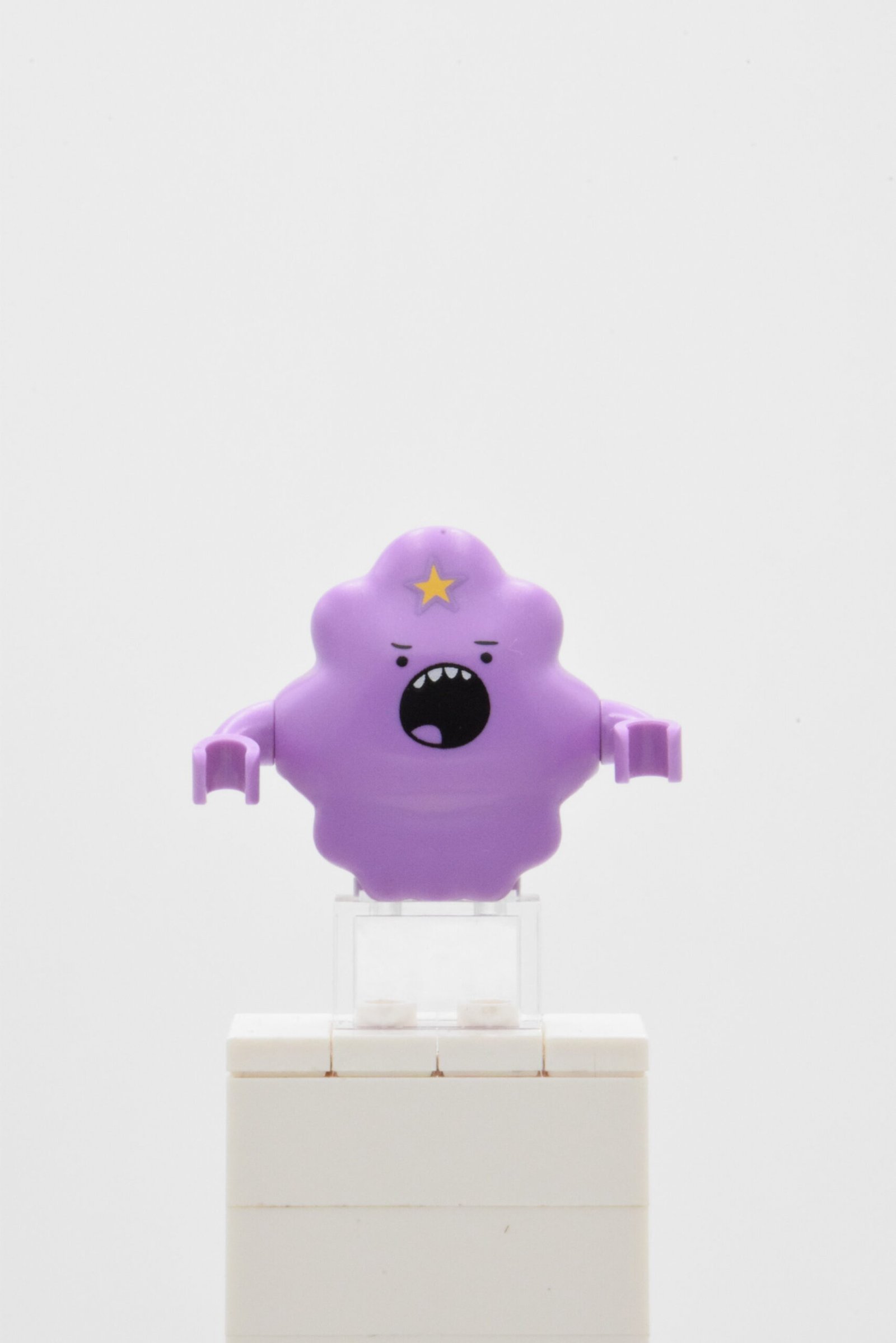 Lumpy Space Princess, référence dim027, se distingue par une construction très spécifique, avec un corps moulé medium lavender imprimé d’une étoile jaune et d’une bouche ouverte, ainsi que deux bras courts courbés qui renforcent immédiatement son identité visuelle. L’ensemble ne repose pas sur une structure classique avec tête et jambes séparées, ce qui donne à la figurine un rendu particulièrement atypique, compact et immédiatement lisible en exposition.