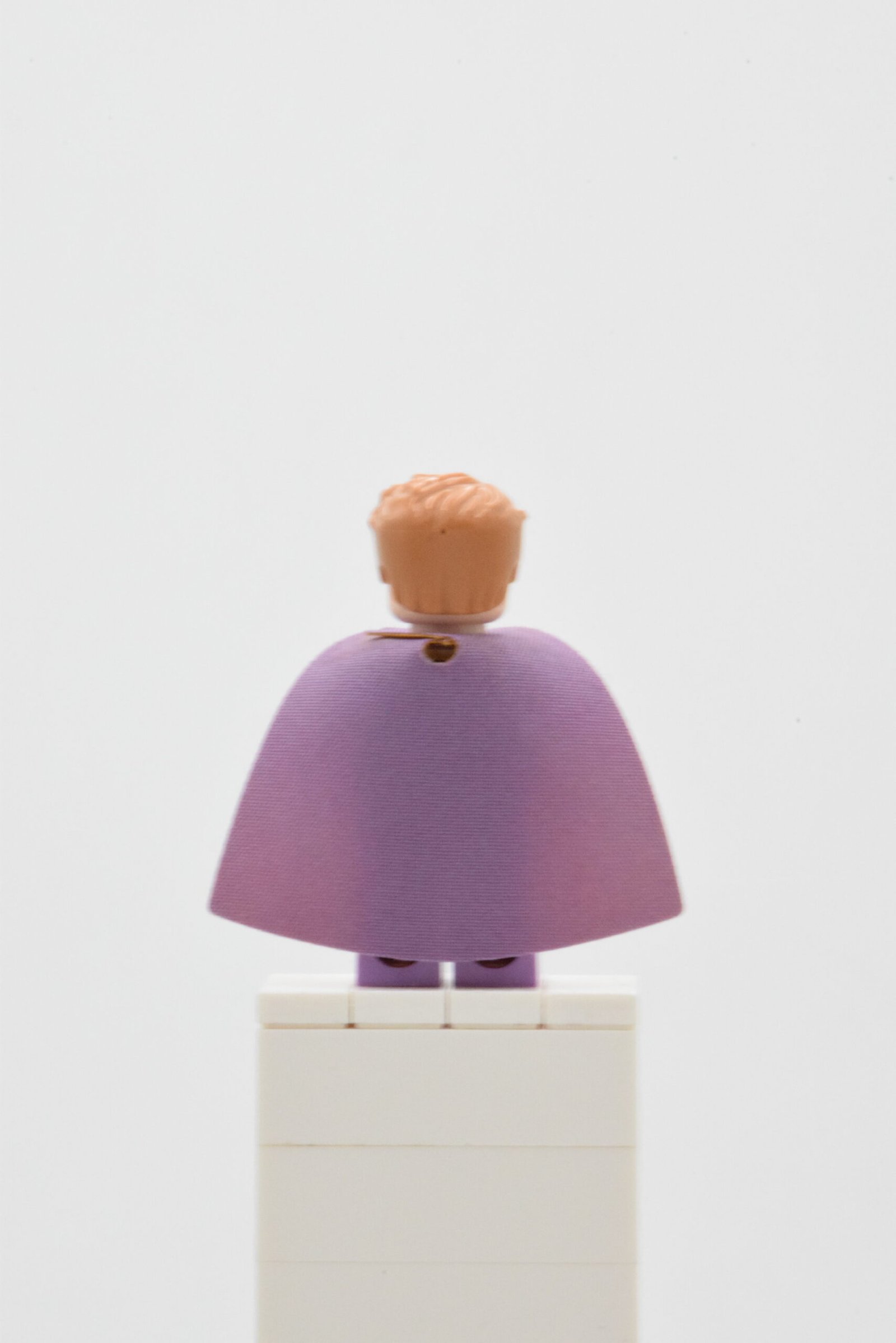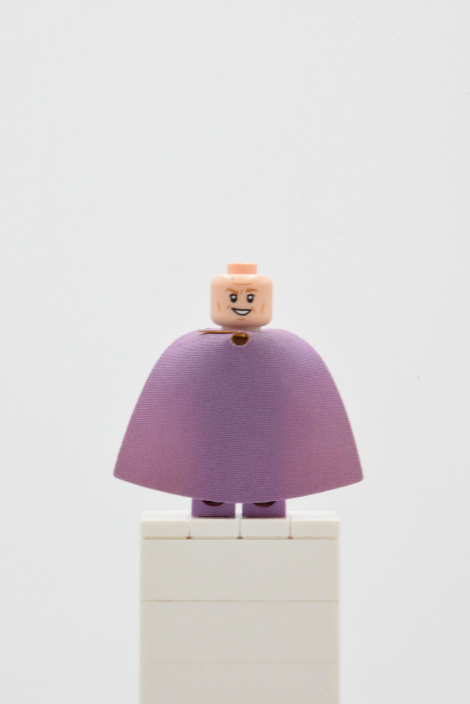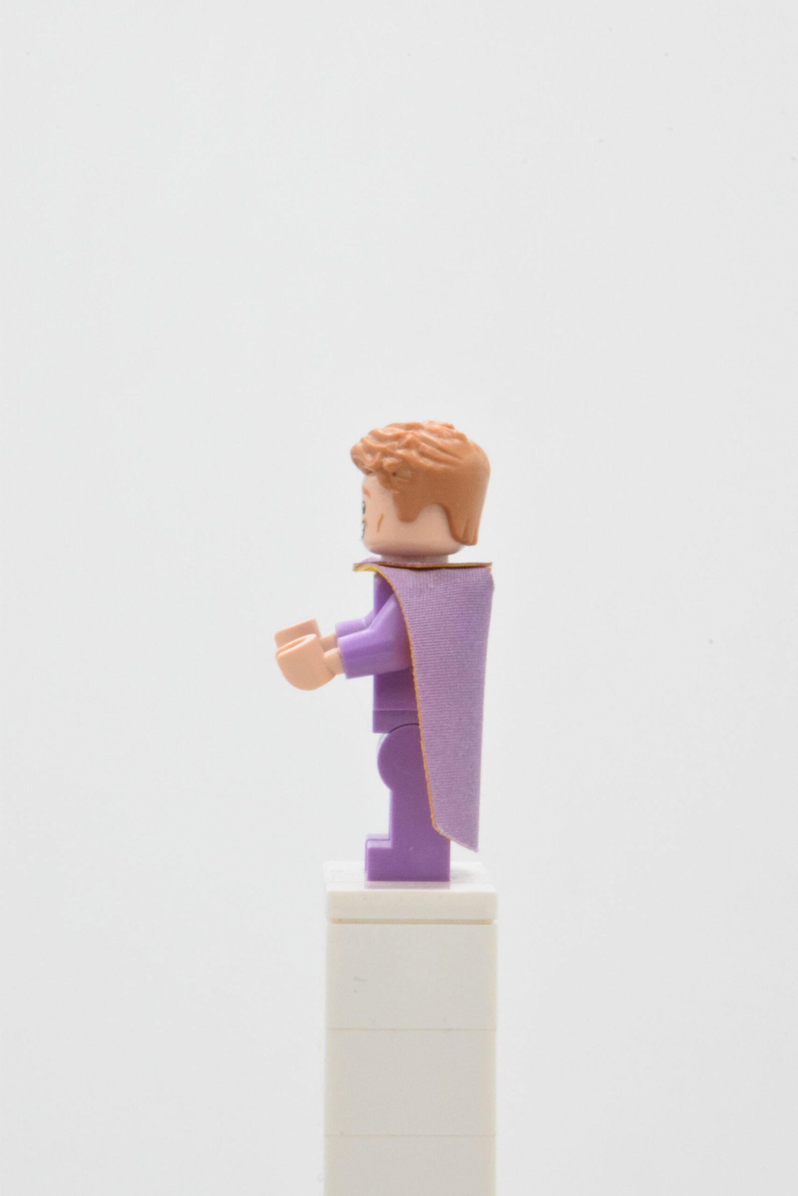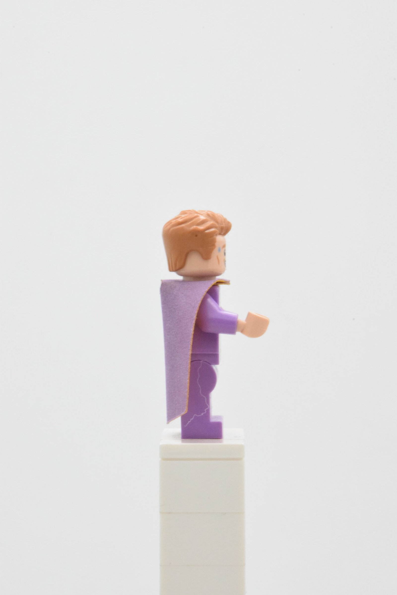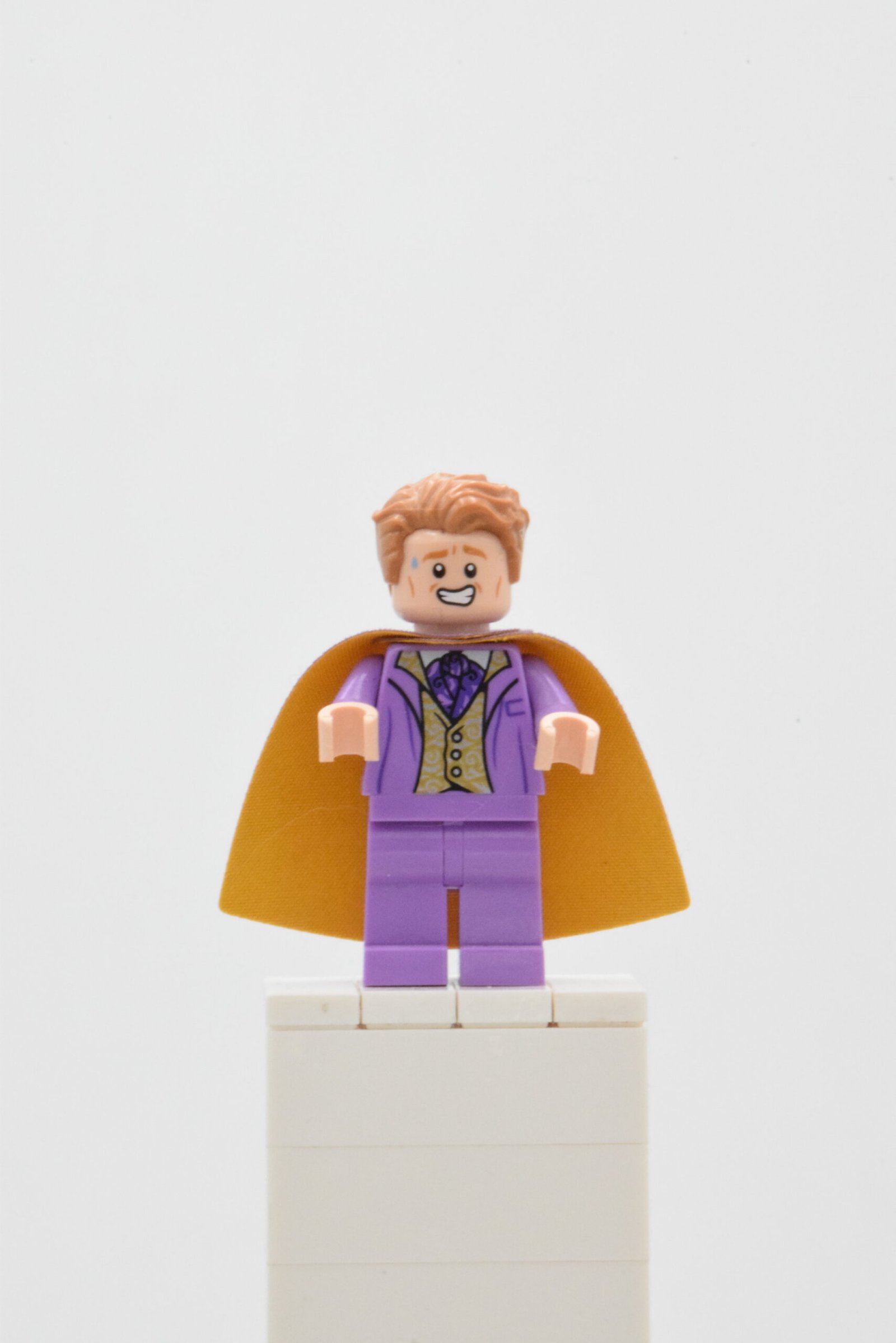 Cette version de Gilderoy Lockhart, référence hp243, se distingue par une présentation très travaillée avec un torse medium lavender imprimé d’une veste ouverte sur un gilet doré et argenté, des jambes unies assorties, une chevelure medium nougat soigneusement coiffée et une cape textile medium lavender et bright light orange qui renforcent immédiatement son allure de personnage vaniteux et élégant. La tête double face, avec une expression souriante d’un côté et une expression plus inquiète de l’autre, apporte un vrai plus visuel pour l’exposition comme pour la mise en scène.