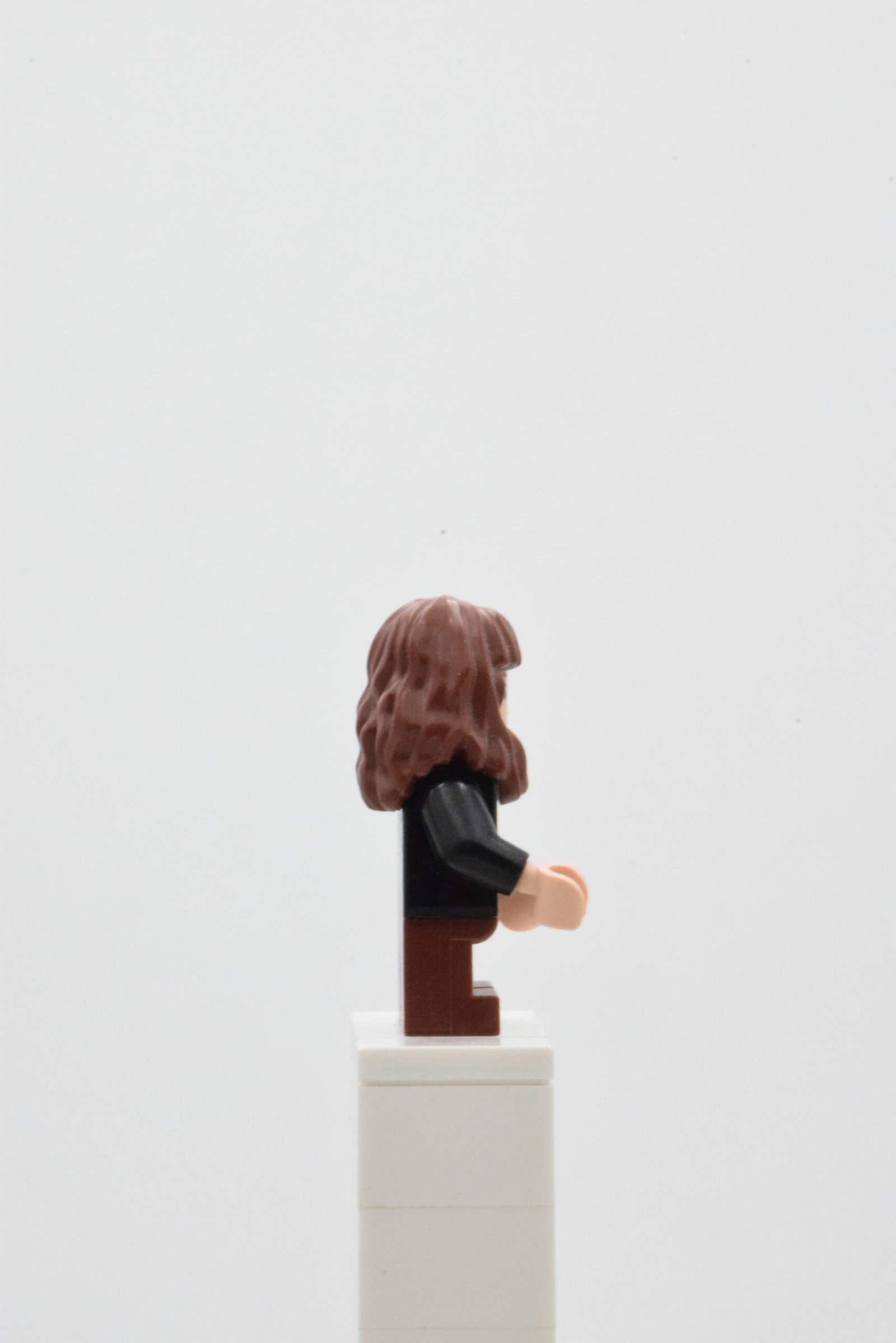 La figurine Hermione Granger, référence hp253, se distingue par un torse noir finement imprimé avec robe de Poudlard fermée et écusson de Gryffondor, des jambes courtes brun rouge qui renforcent le rendu jeune du personnage, ainsi qu’une tête double face avec une expression souriante et une expression plus inquiète. Sa chevelure brun rouge mi-longue et ondulée complète une silhouette immédiatement identifiable, avec un rendu visuel propre, fidèle et très facile à intégrer en vitrine comme en diorama.
