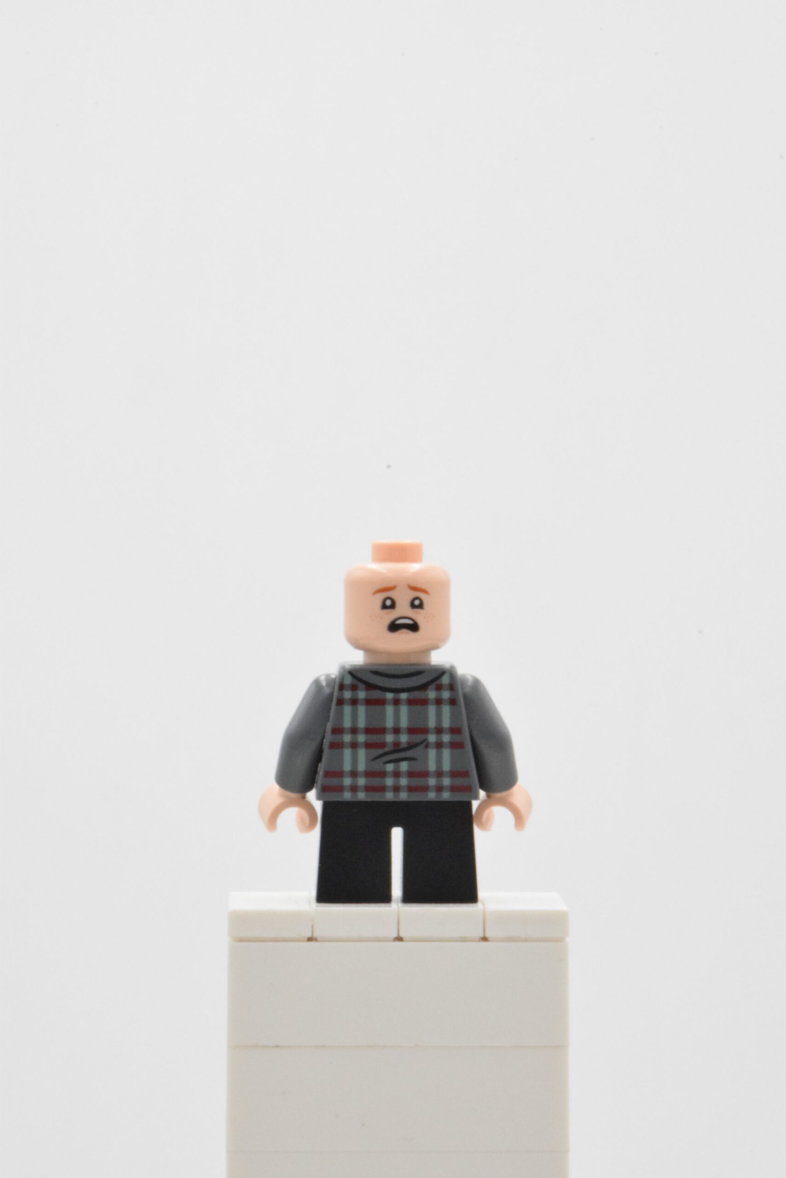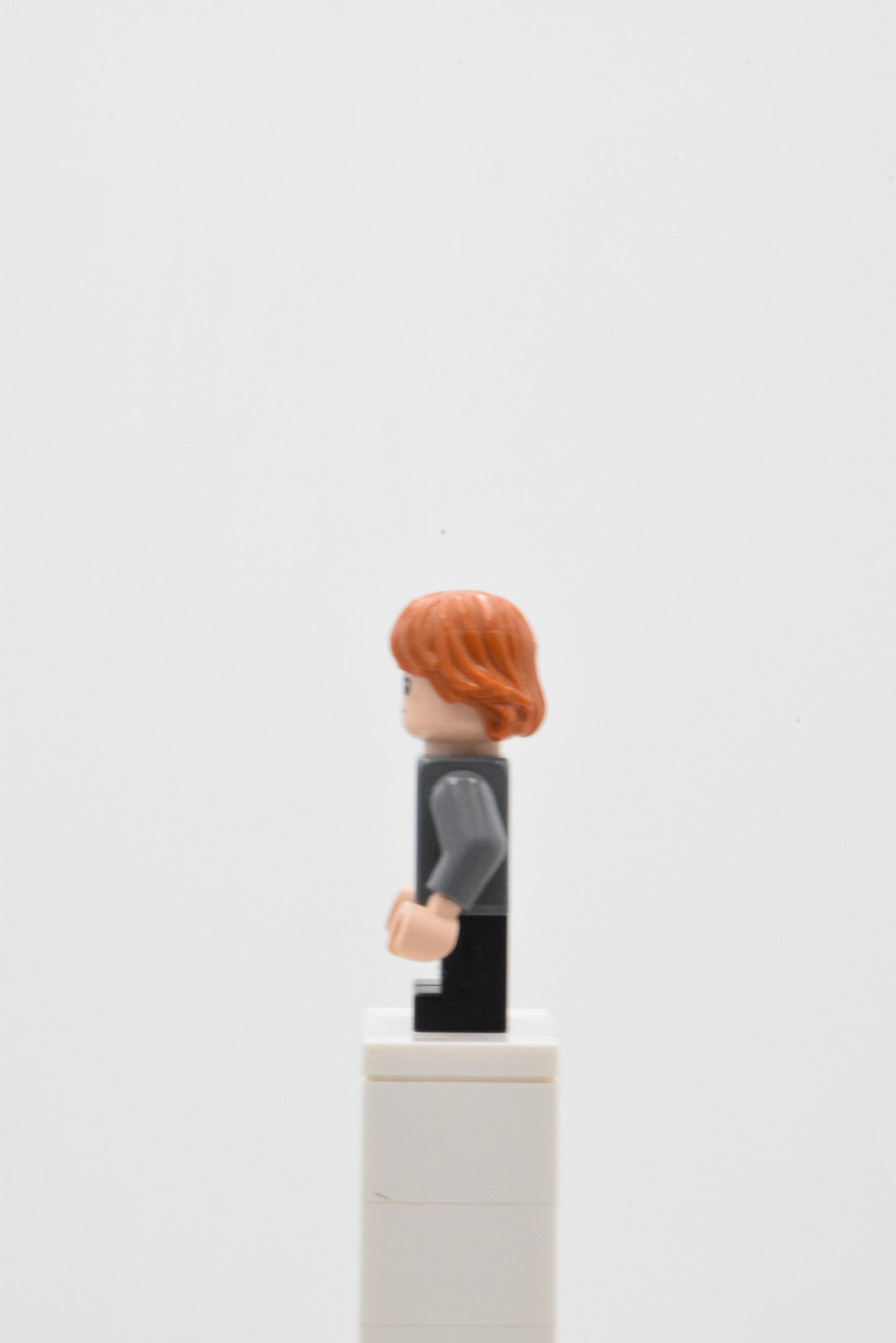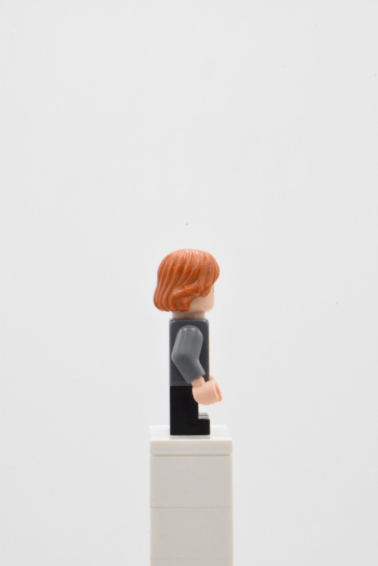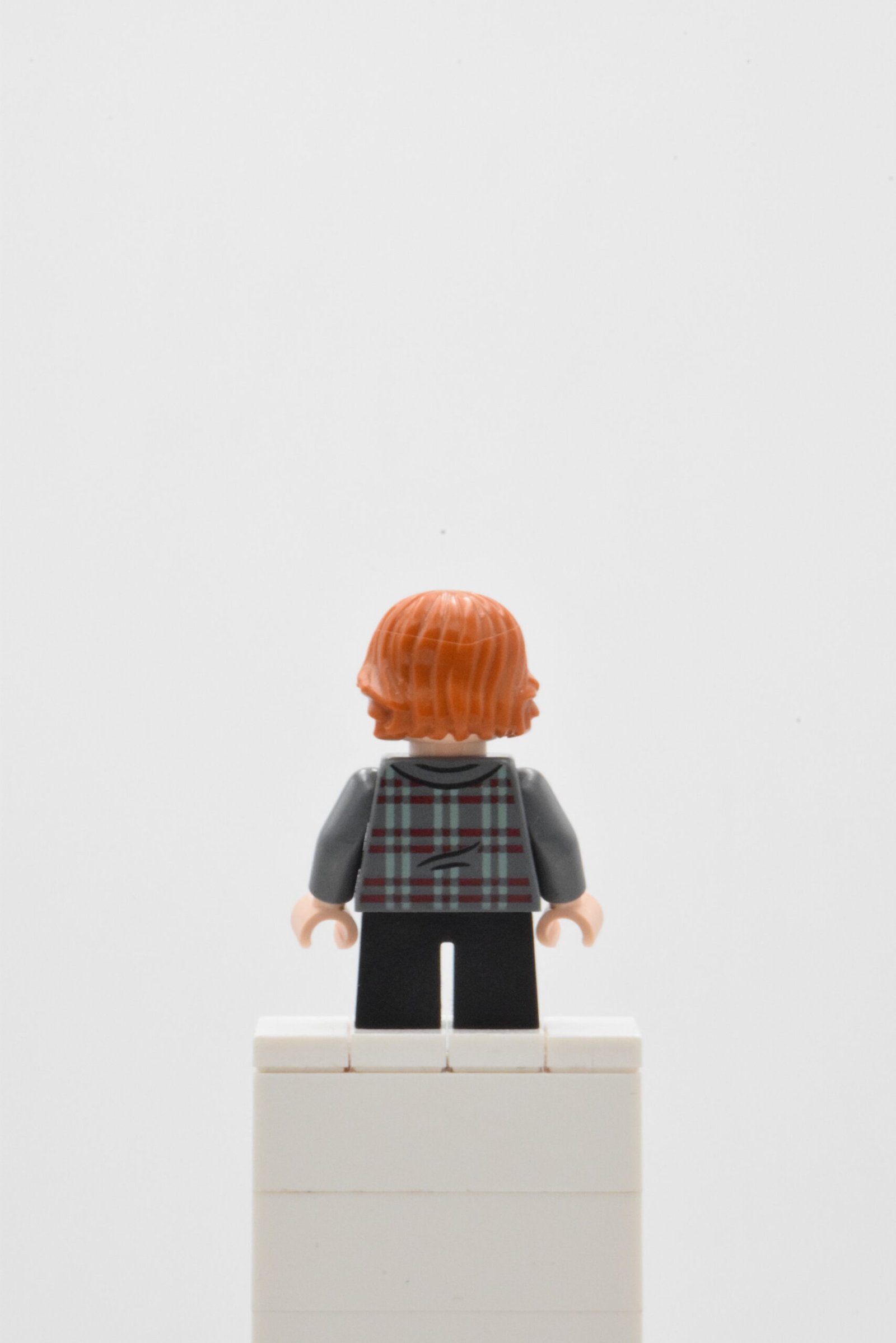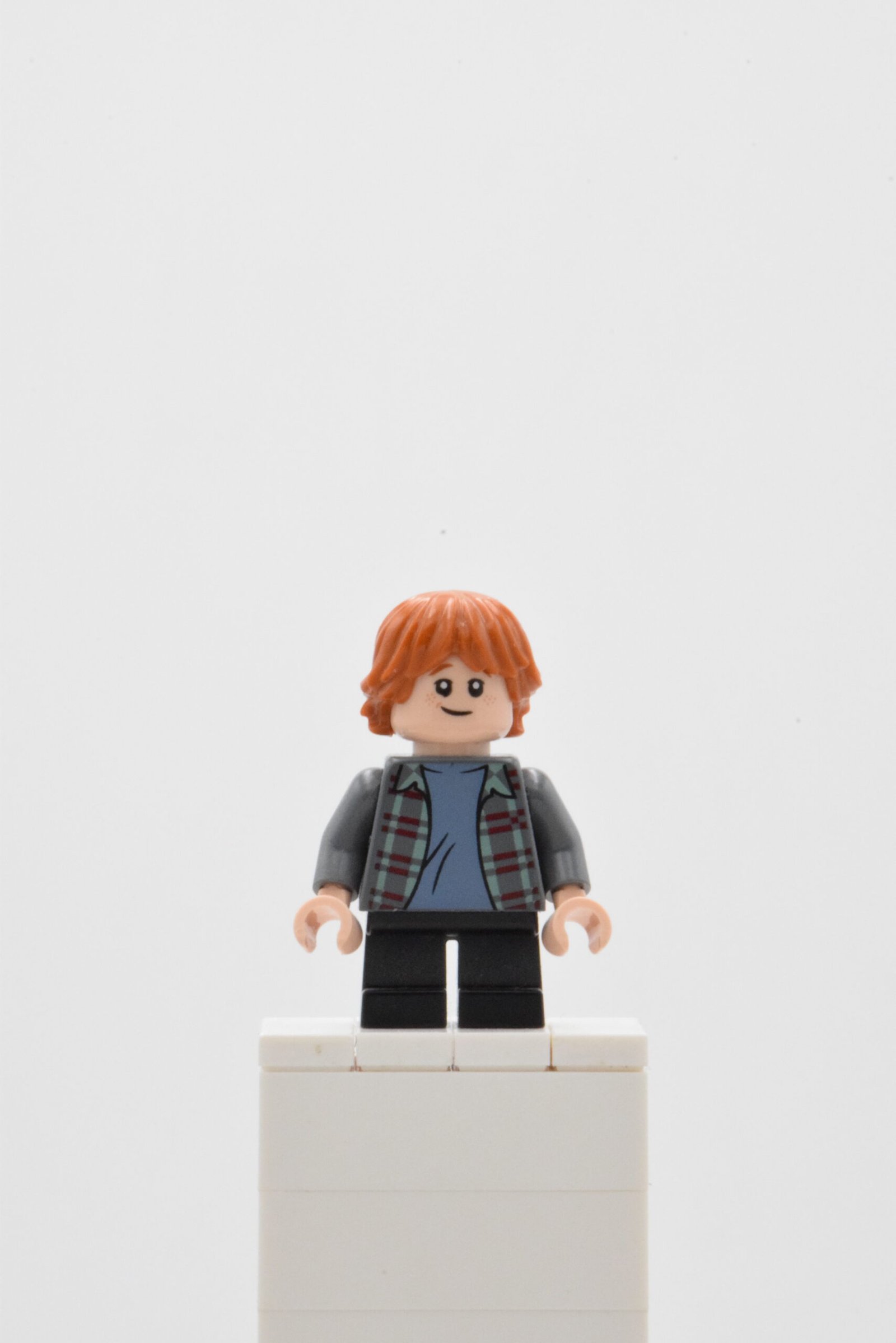 Ron Weasley, hp280 propose un design simple mais très lisible, avec un torse imprimé de chemise à carreaux rouge sombre et vert sable portée sur un tee-shirt bleu sable, des jambes courtes noires cohérentes avec son apparence d’élève, ainsi qu’un visage double face qui permet de varier l’expression entre un sourire en coin et une réaction plus inquiète. Sa chevelure dark orange ébouriffée renforce immédiatement son identité visuelle, pour un rendu naturel, crédible et efficace aussi bien en exposition qu’en diorama.
