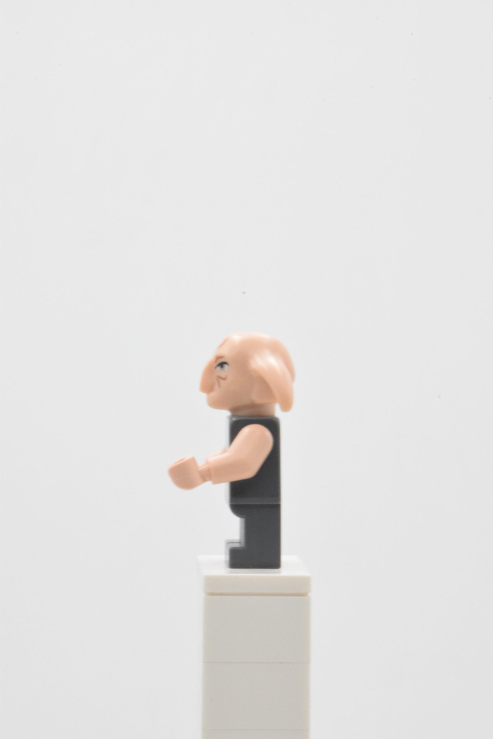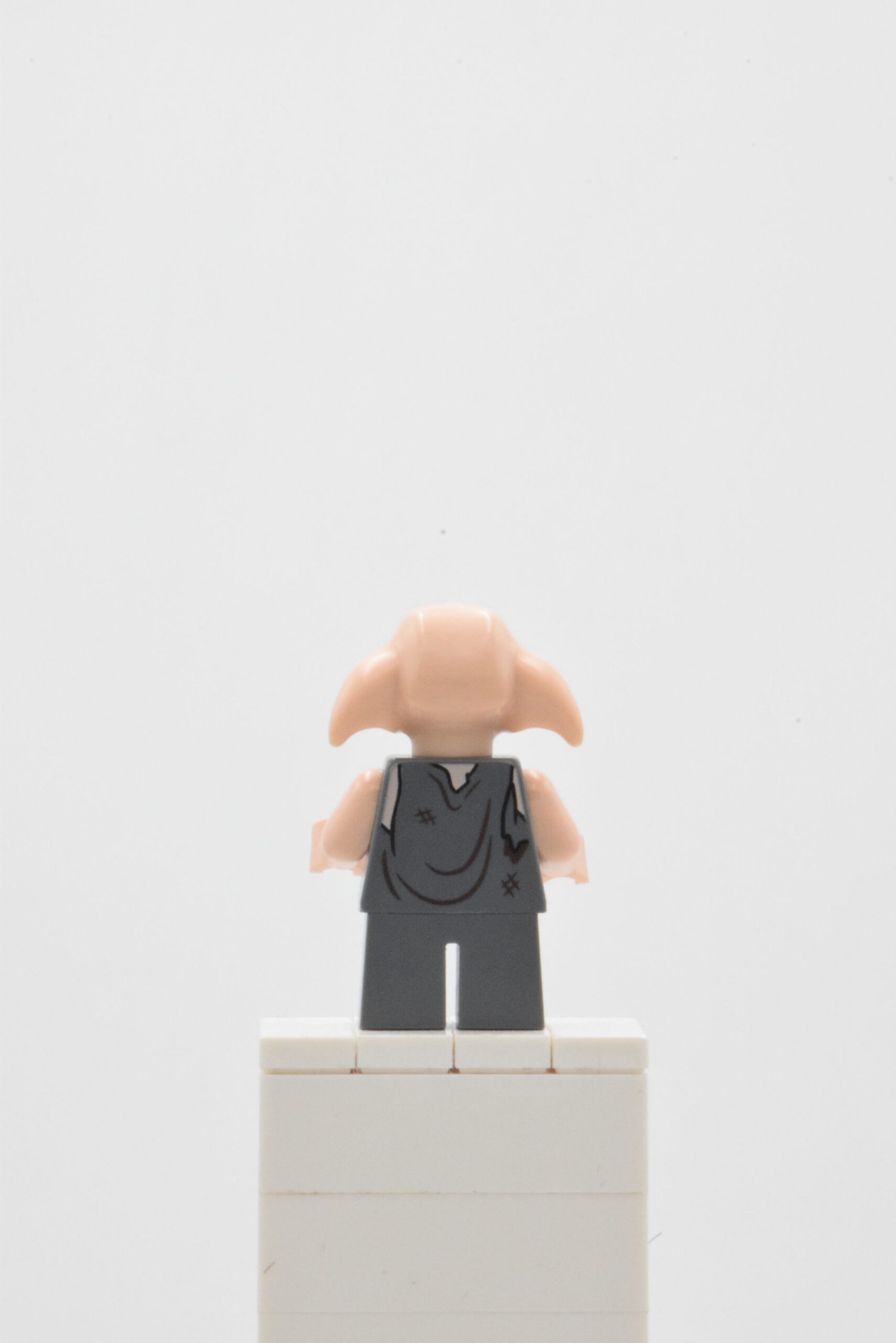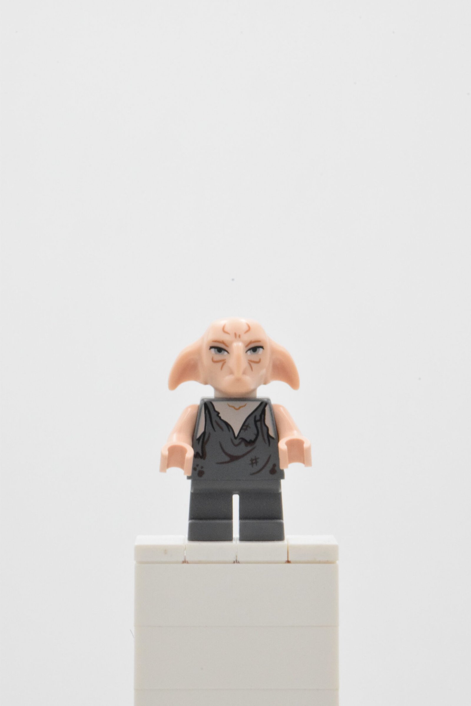 Kreacher (Elf), hp341 propose un design immédiatement lisible avec une pièce de tête moulée spécifique qui restitue bien ses traits d’elfe de maison, notamment ses grands yeux clairs, son expression fatiguée et son visage marqué. Le torse imprimé en dark bluish gray évoque une tenue usée et déchirée cohérente avec le personnage, tandis que les jambes courtes assorties renforcent sa silhouette compacte. L’ensemble offre un rendu visuel fidèle, crédible et très efficace en exposition comme en diorama.