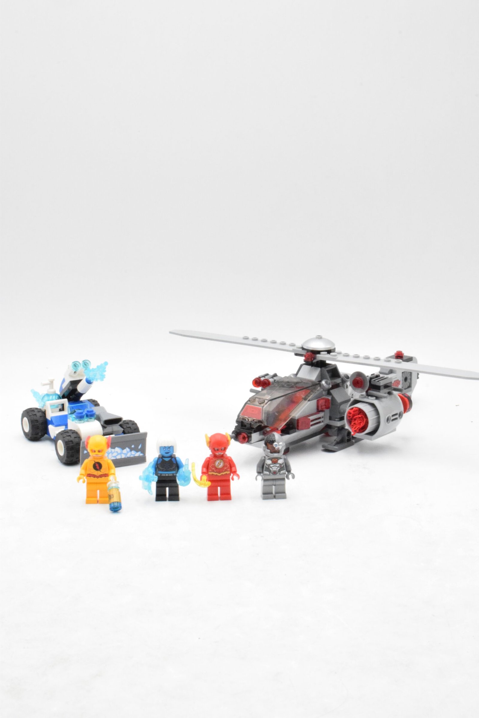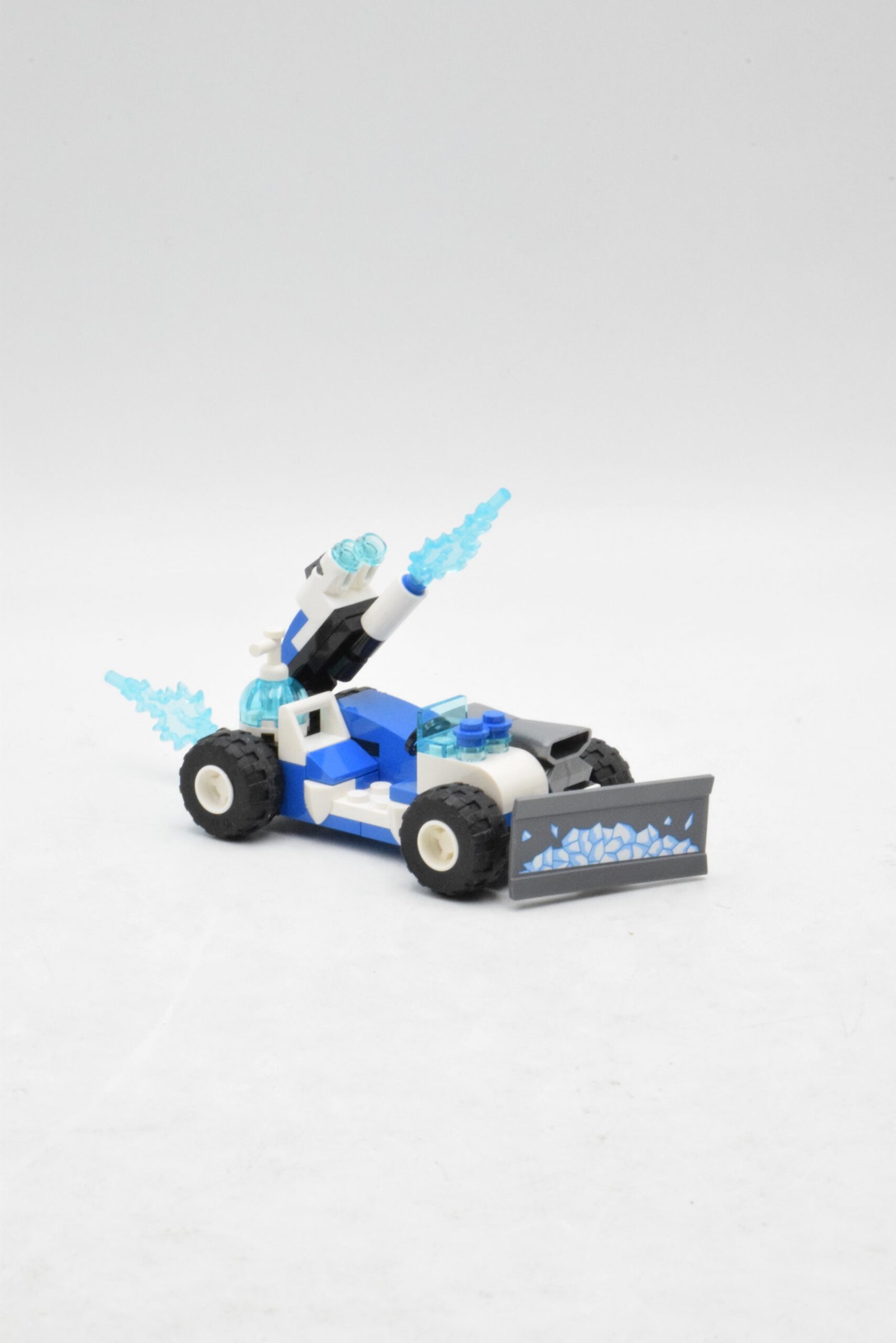 Le combat de glace s’articule autour d’une poursuite à haute intensité : le CyborgCopter combine un cockpit qui s’ouvre, une grande pale de rotor et un lanceur de filet, tandis que la voiture de Killer Frost mise sur une lame de bulldozer réglable et des tireurs à tenons. L’infuseur à énergie bleue sert de point d’enjeu, parfait pour structurer une mission “capture / défense”.