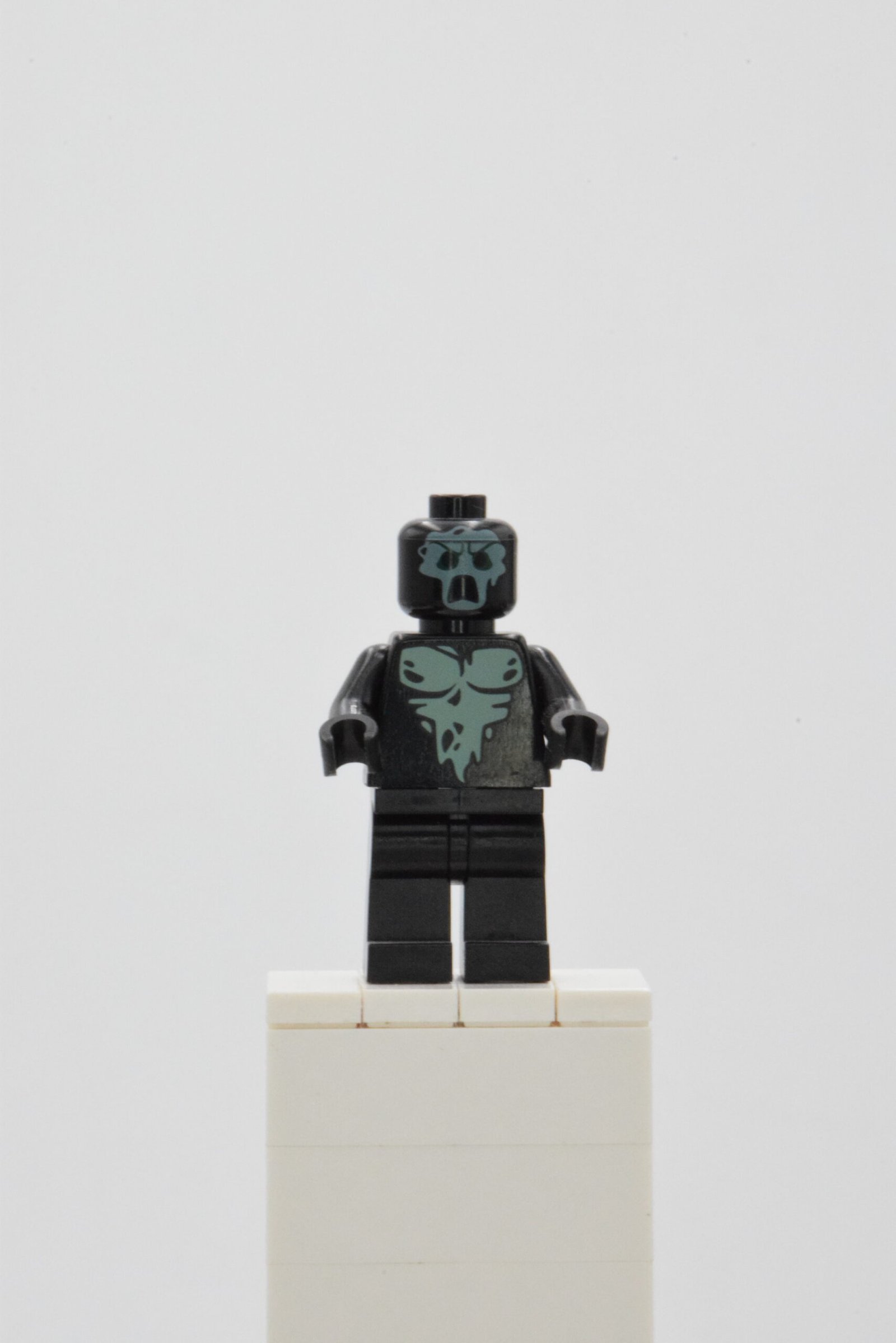 La figurine Necromancer of Dol Guldur, lor081, mise sur une interprétation très lisible du personnage avec un torse noir imprimé de motifs osseux blancs, des jambes noires volontairement sobres et une tête noire ornée d’un visage spectral très expressif. L’absence de casque, de coiffe ou d’élément moulé supplémentaire renforce son apparence désincarnée, tandis que l’ensemble conserve une présence visuelle forte et cohérente aussi bien en vitrine qu’en mise en scène.