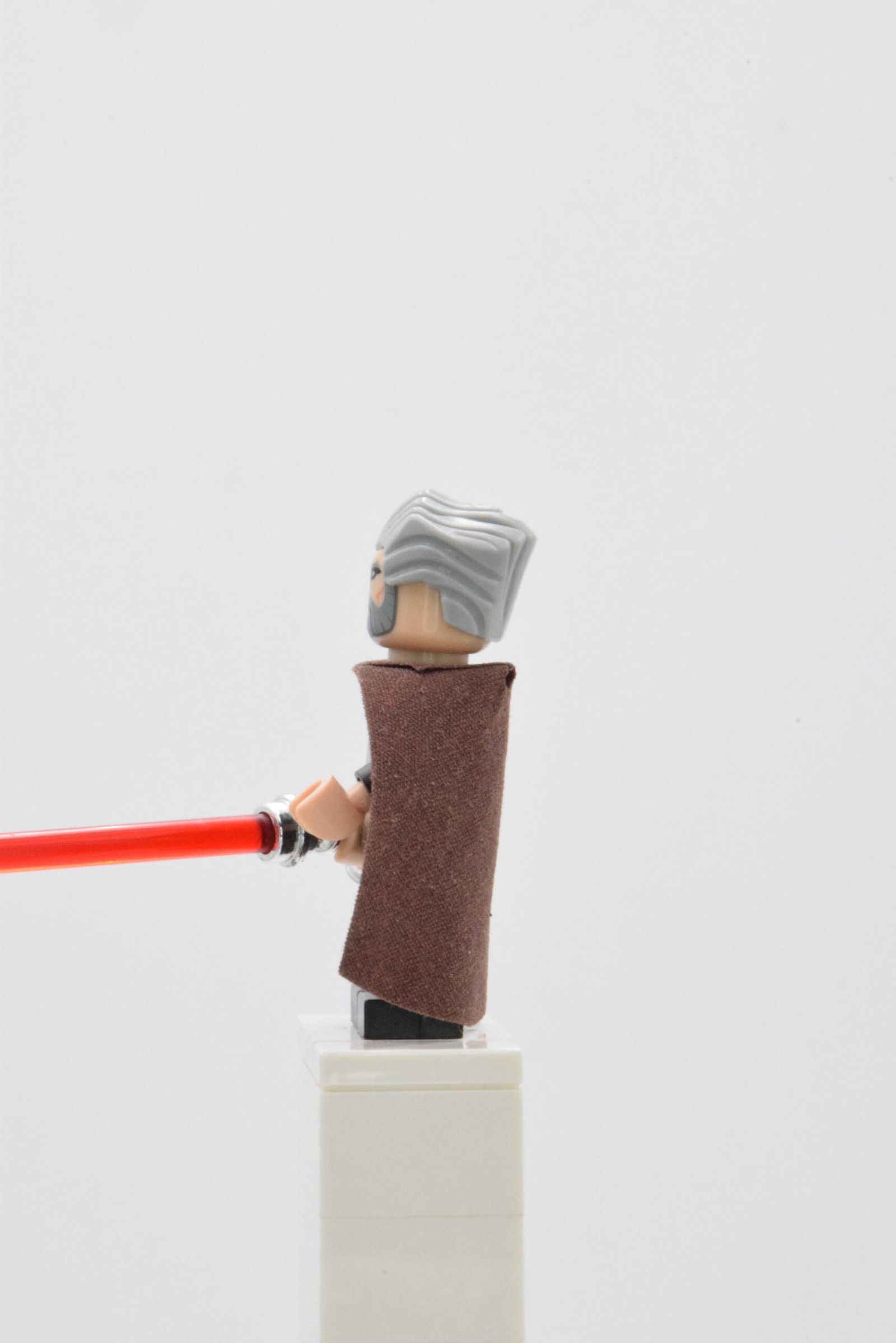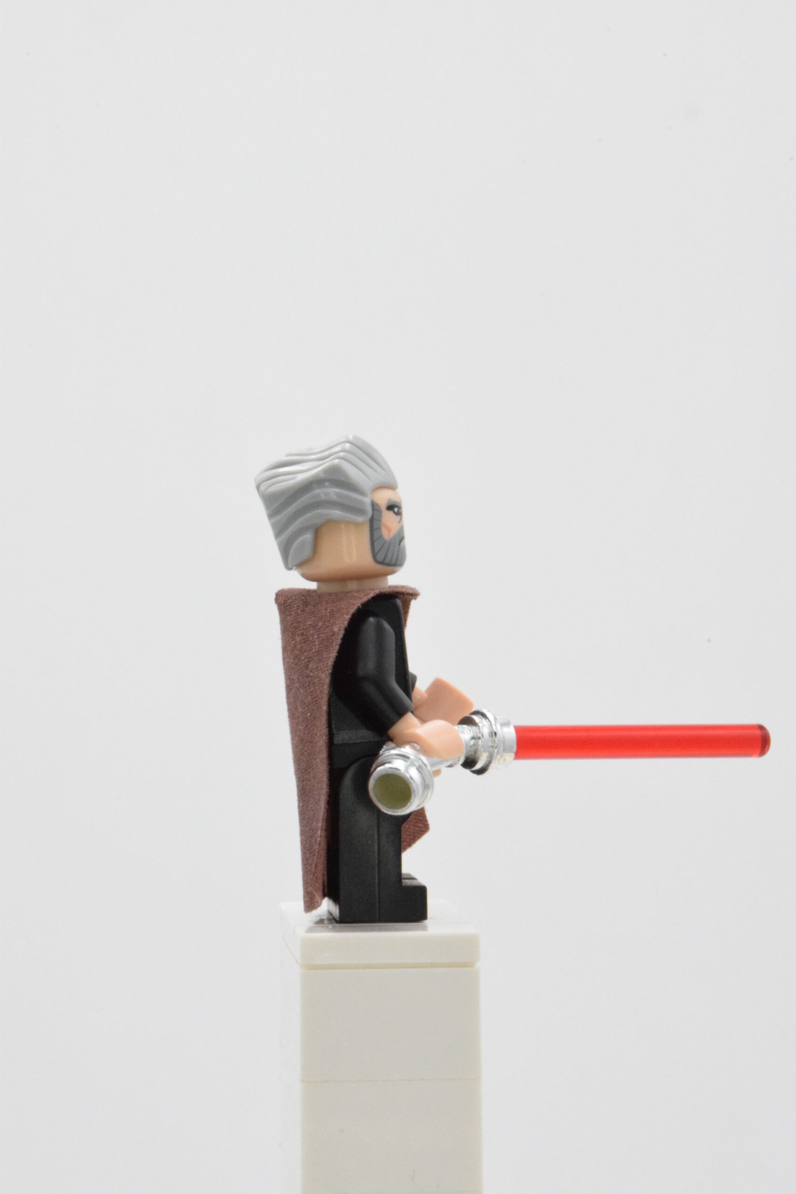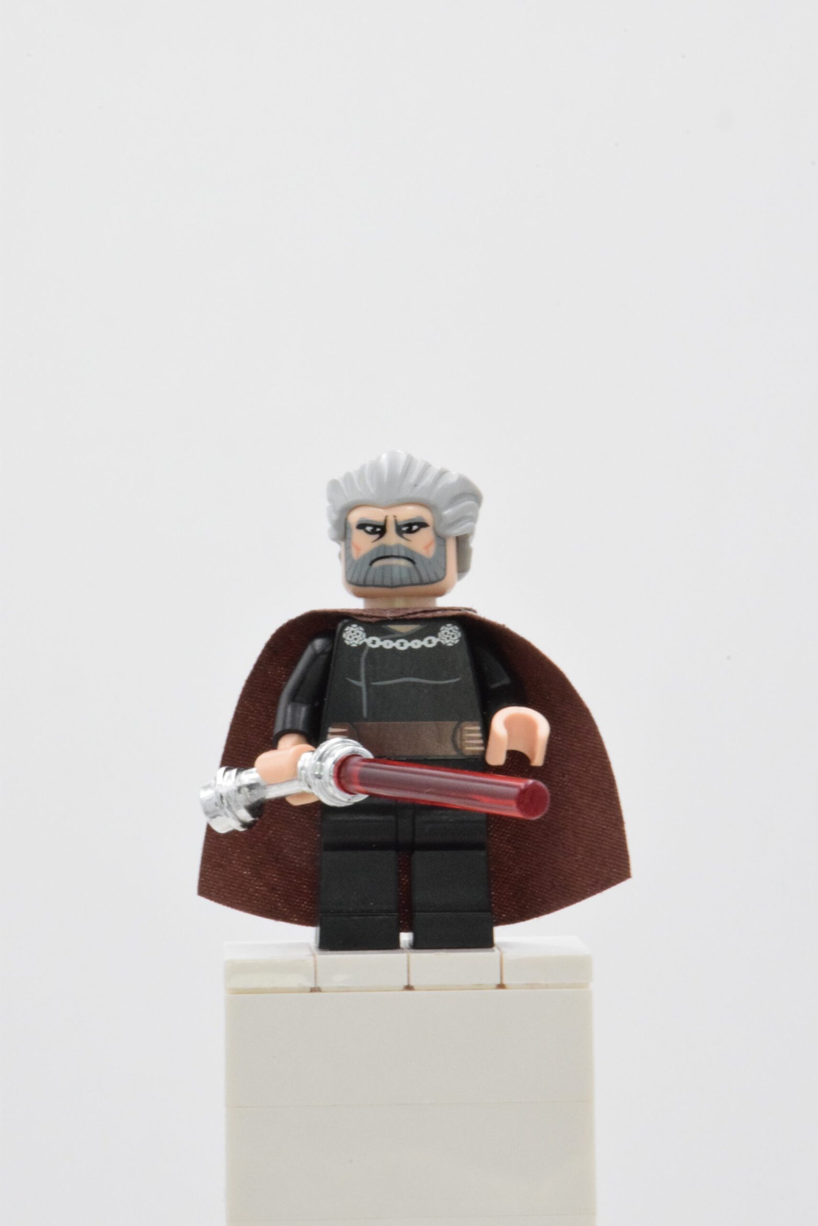 - Nom de la figurine : Count Dooku – Light Bluish Gray Swept Back Hair, Reddish Brown Cape, Large Eyes