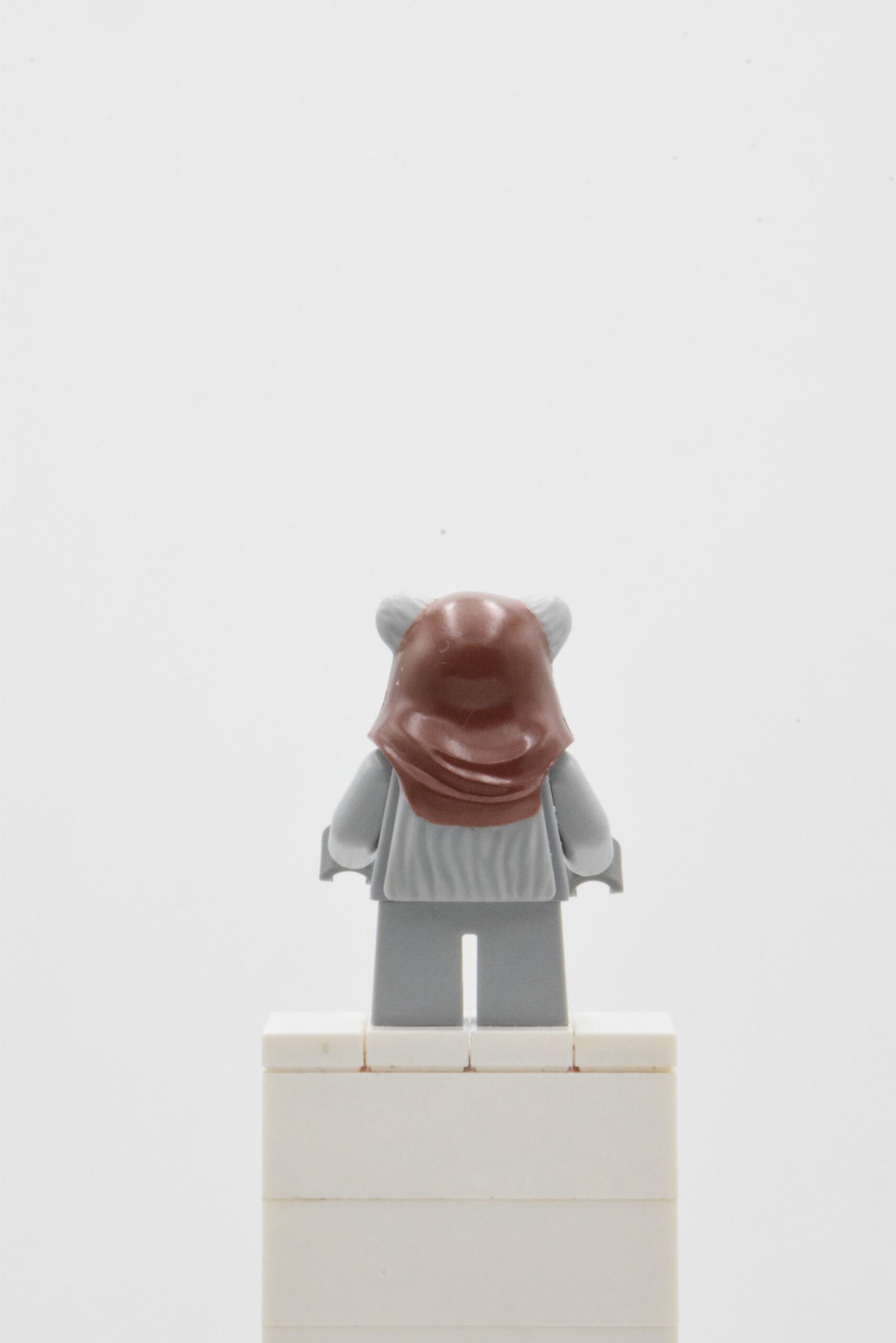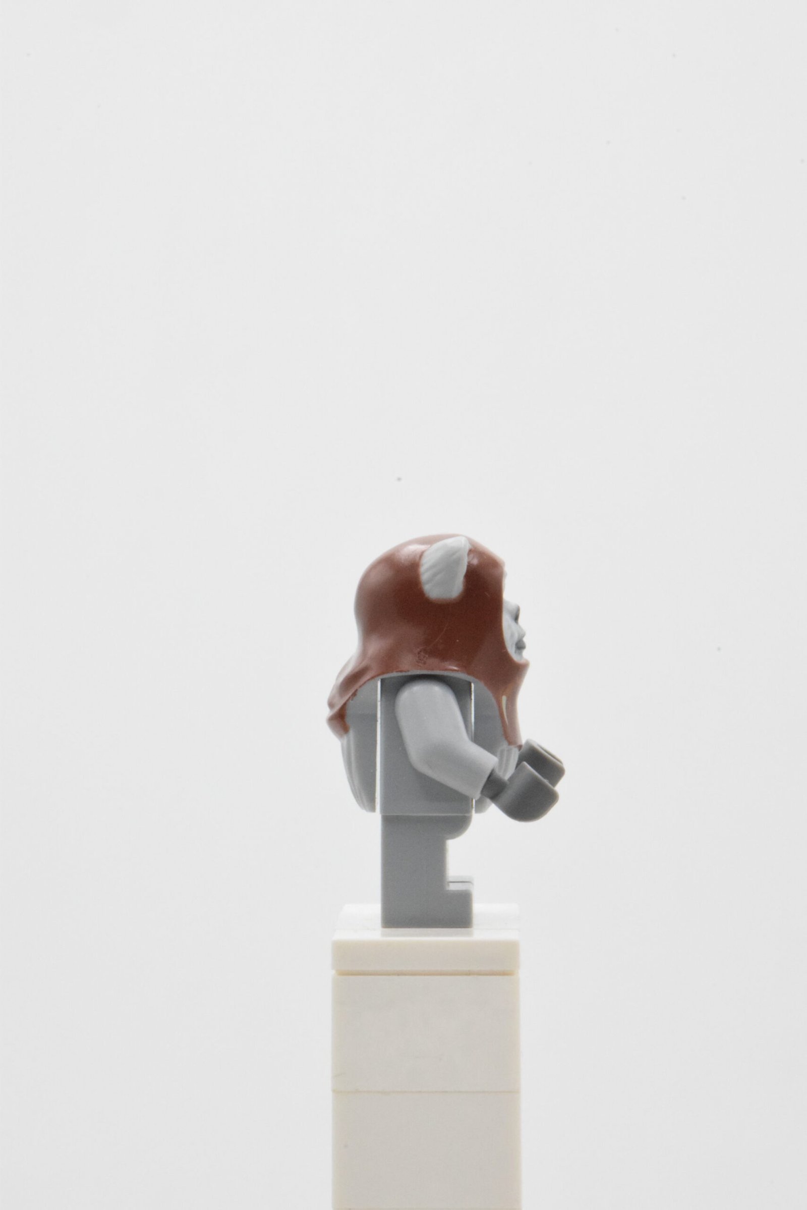 Chief Chirpa SW0236 repose sur une construction volontairement simple mais très efficace visuellement. Le point central, c’est sa tête Ewok modifiée : une grande pièce moulée qui donne immédiatement l’identité “Ewok”, avec une finition orientée chef de tribu (capuche intégrée et détails de bouche/dents). Cette seule pièce suffit à différencier clairement la figurine dans une vitrine Star Wars, même au second plan.