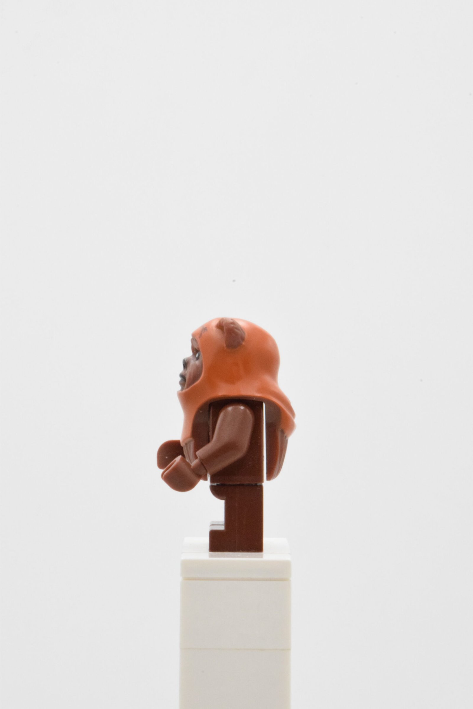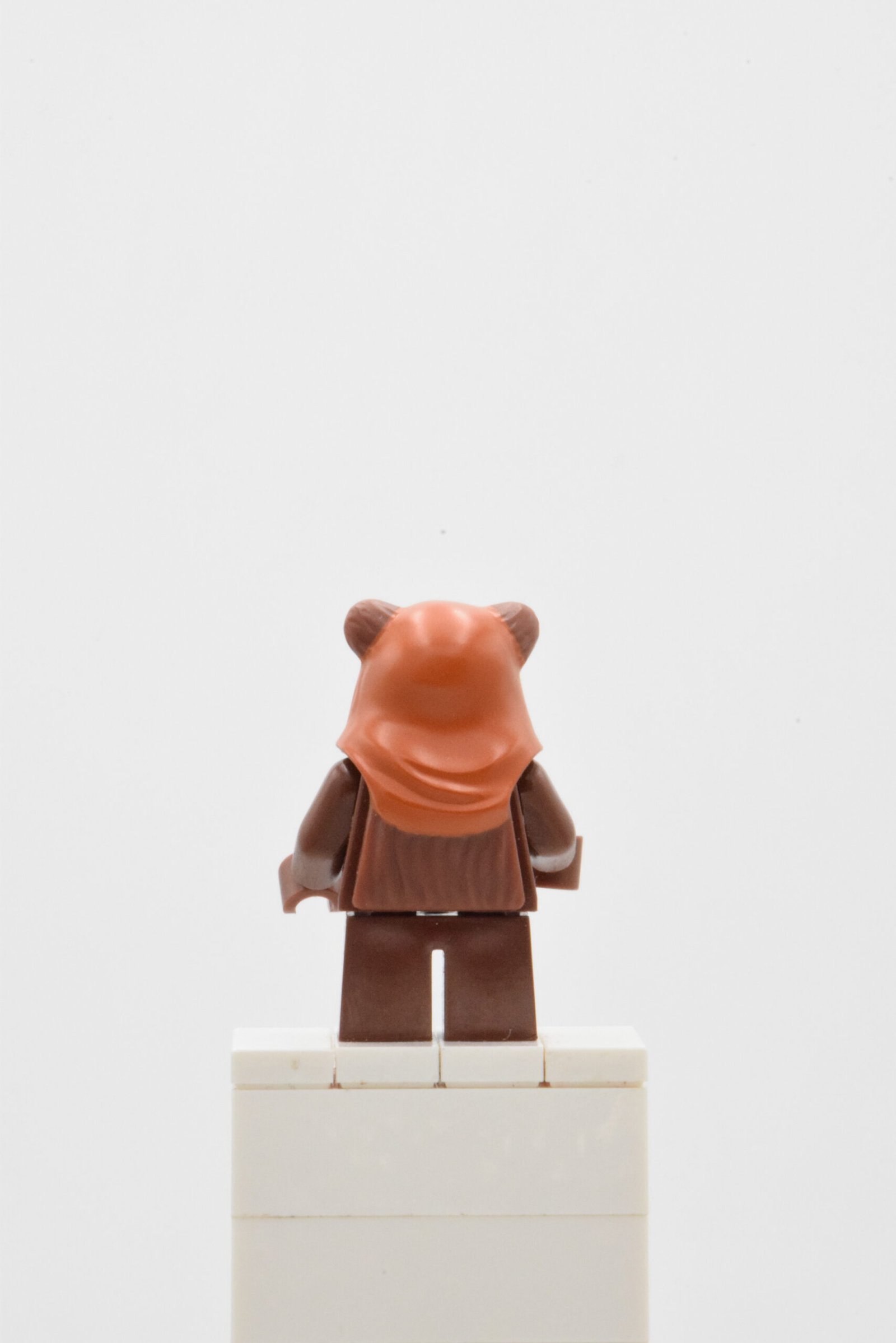 SW0237 est une minifigurine très “silhouette” : elle repose sur des jambes courtes reddish brown et une tête modifiée Ewok intégrant la capuche, avec une impression qui structure immédiatement le personnage (capuche dark orange avec détails de couture). Le torse est volontairement simple, ce qui met l’accent sur l’élément de tête et renforce l’aspect “petit guerrier de forêt” typique d’Endor.