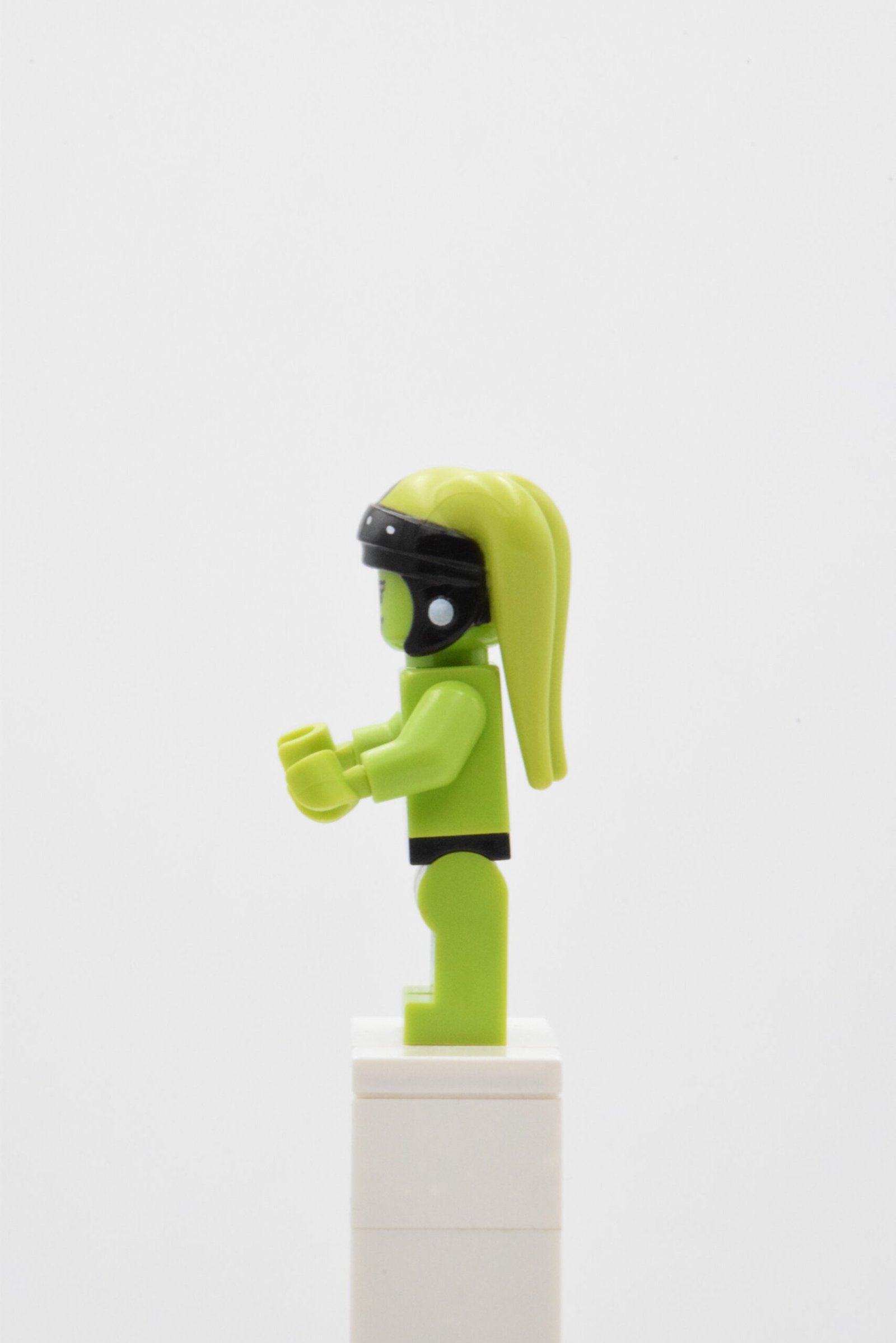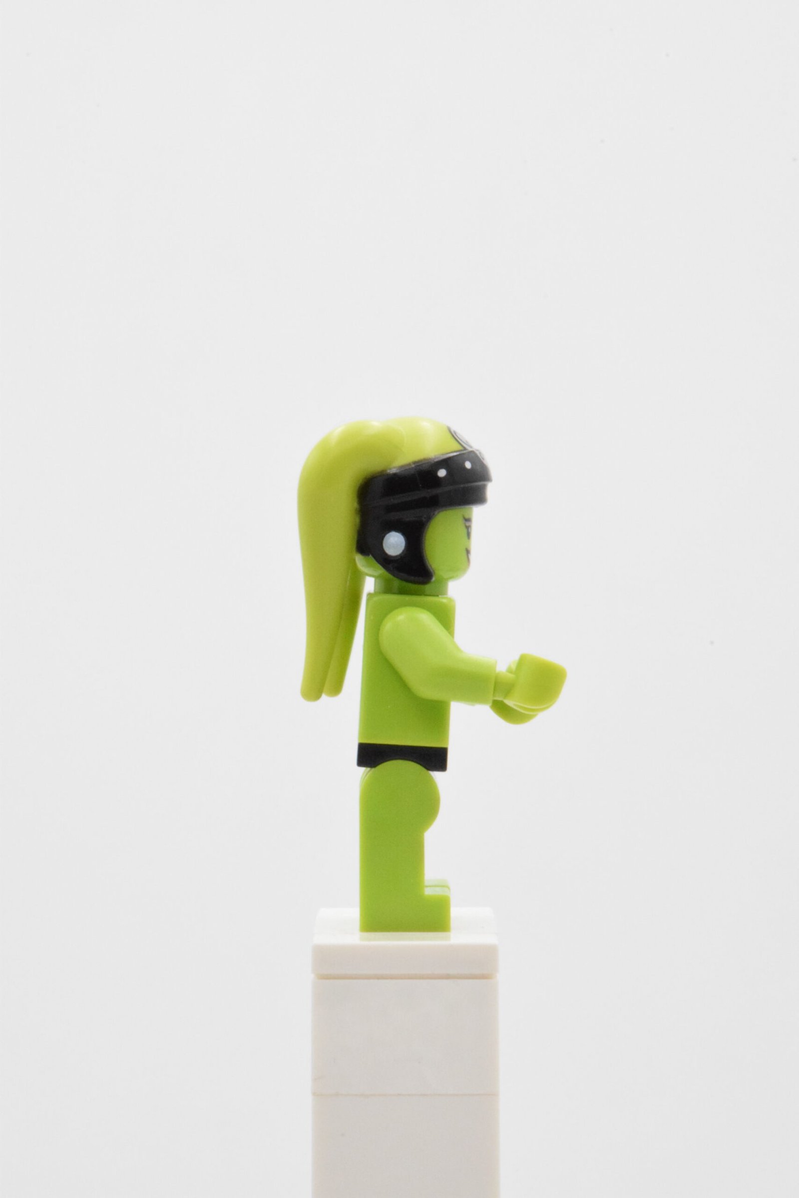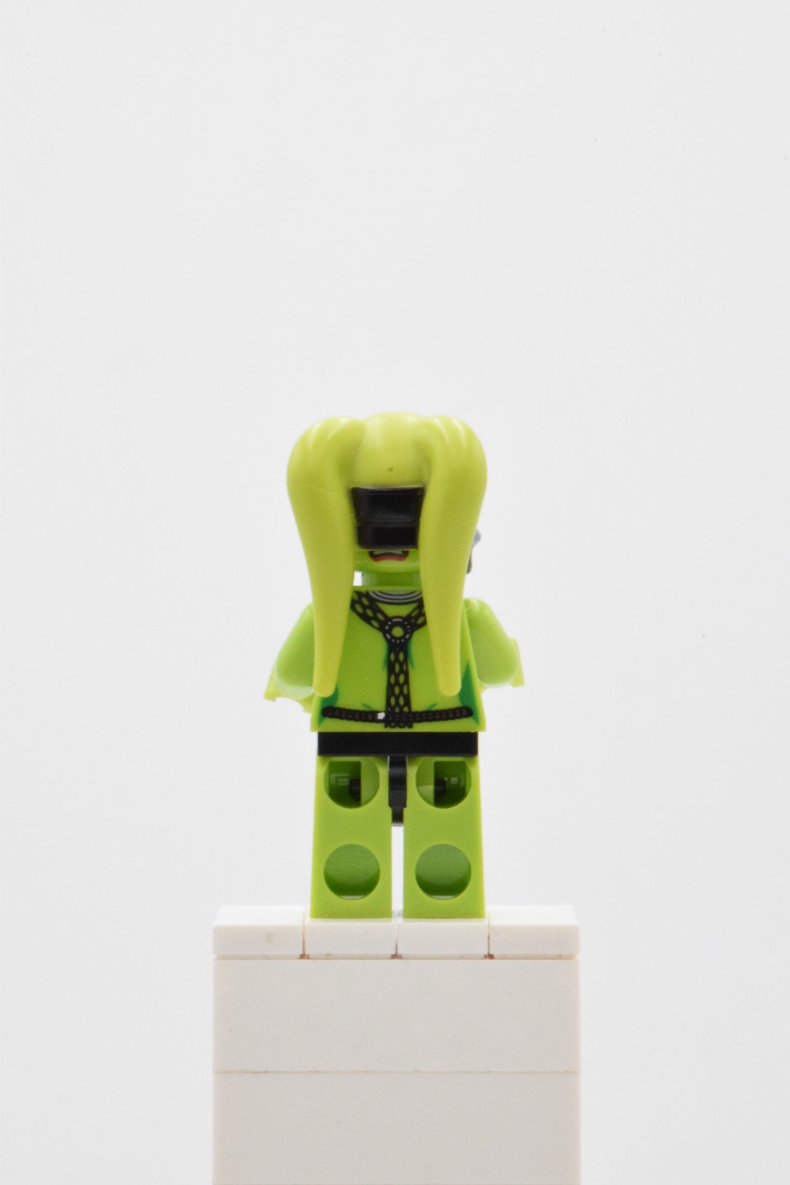 Oola SW0406 repose sur un design très “personnage”, avec une identité visuelle portée par trois éléments clés : une coiffe Twi’lek imprimée spécifique (motifs noirs et argent), une tête lime double face (expression “sourire” et expression “effrayée”), et des jambes lime décorées avec un motif de résille/noir qui donne tout de suite du relief en vitrine.