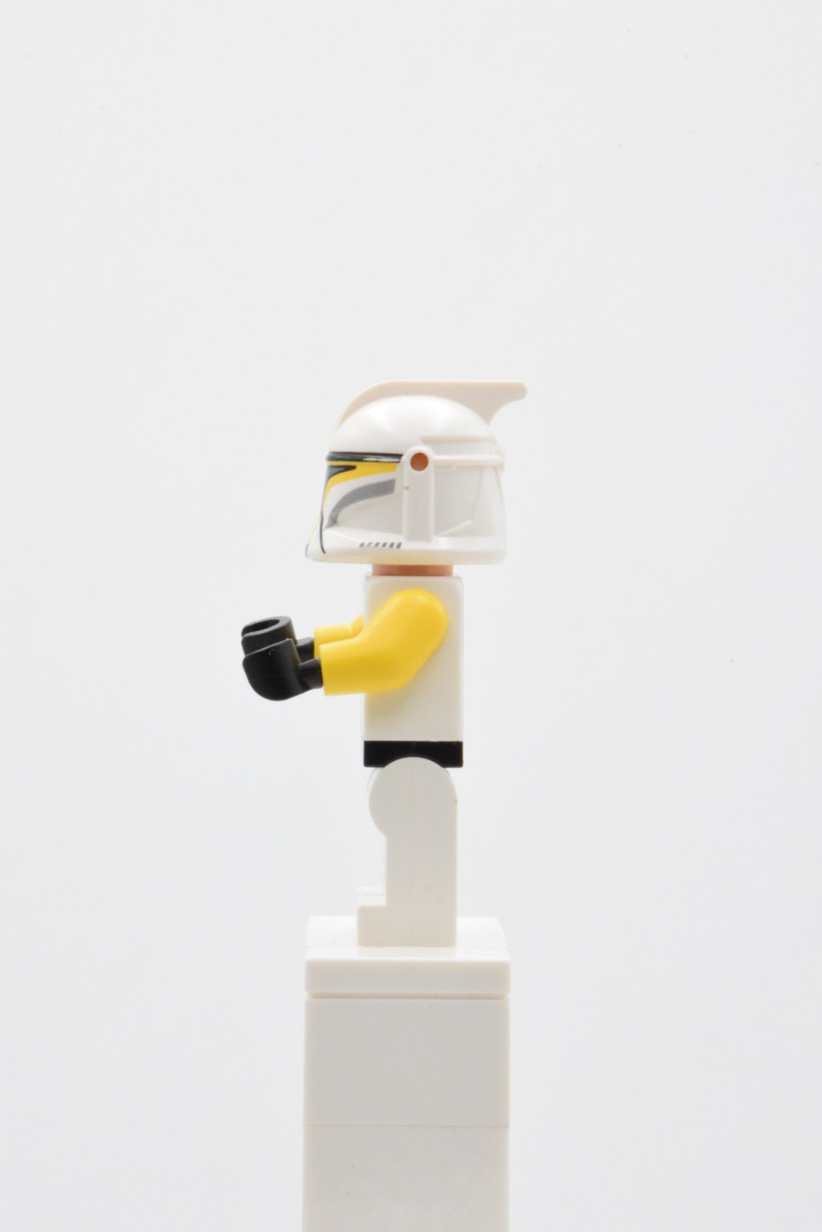 Le casque Phase 1, avec marquages jaunes et visière argentée imprimée, donne immédiatement l’identité “officier de terrain” sans ajouter d’éléments encombrants, ce qui aide beaucoup en diorama (cockpit, rampe, colonne de clones).