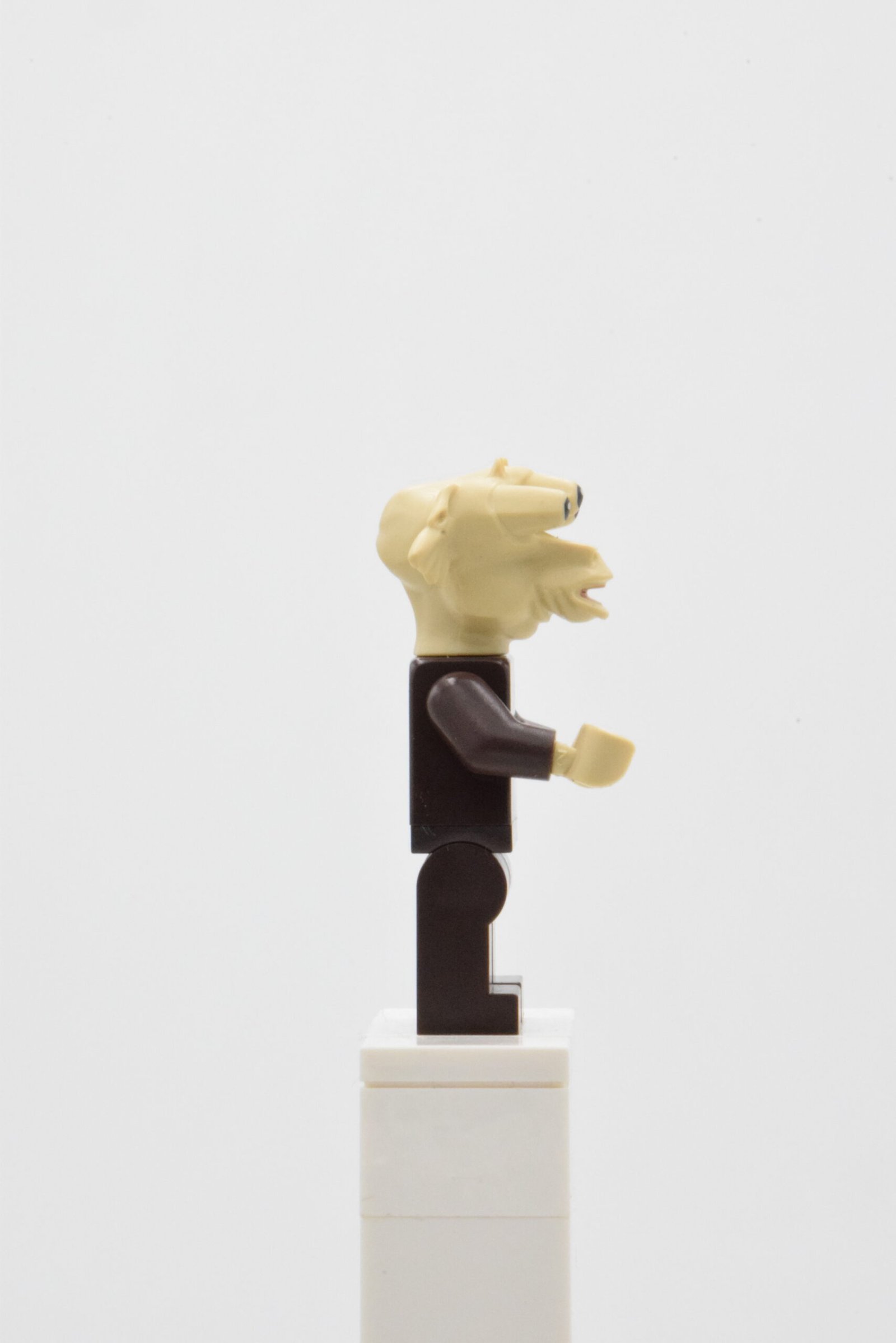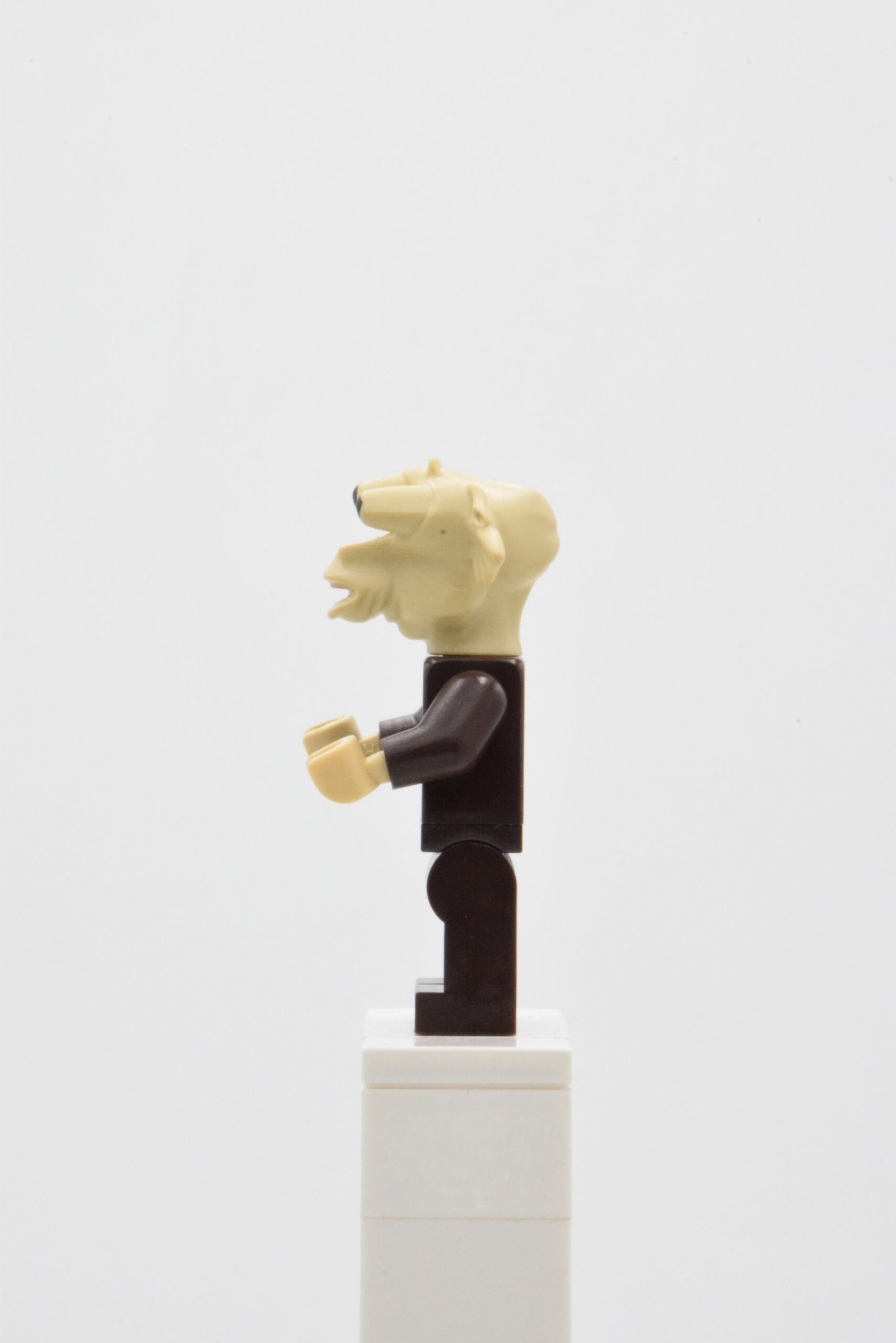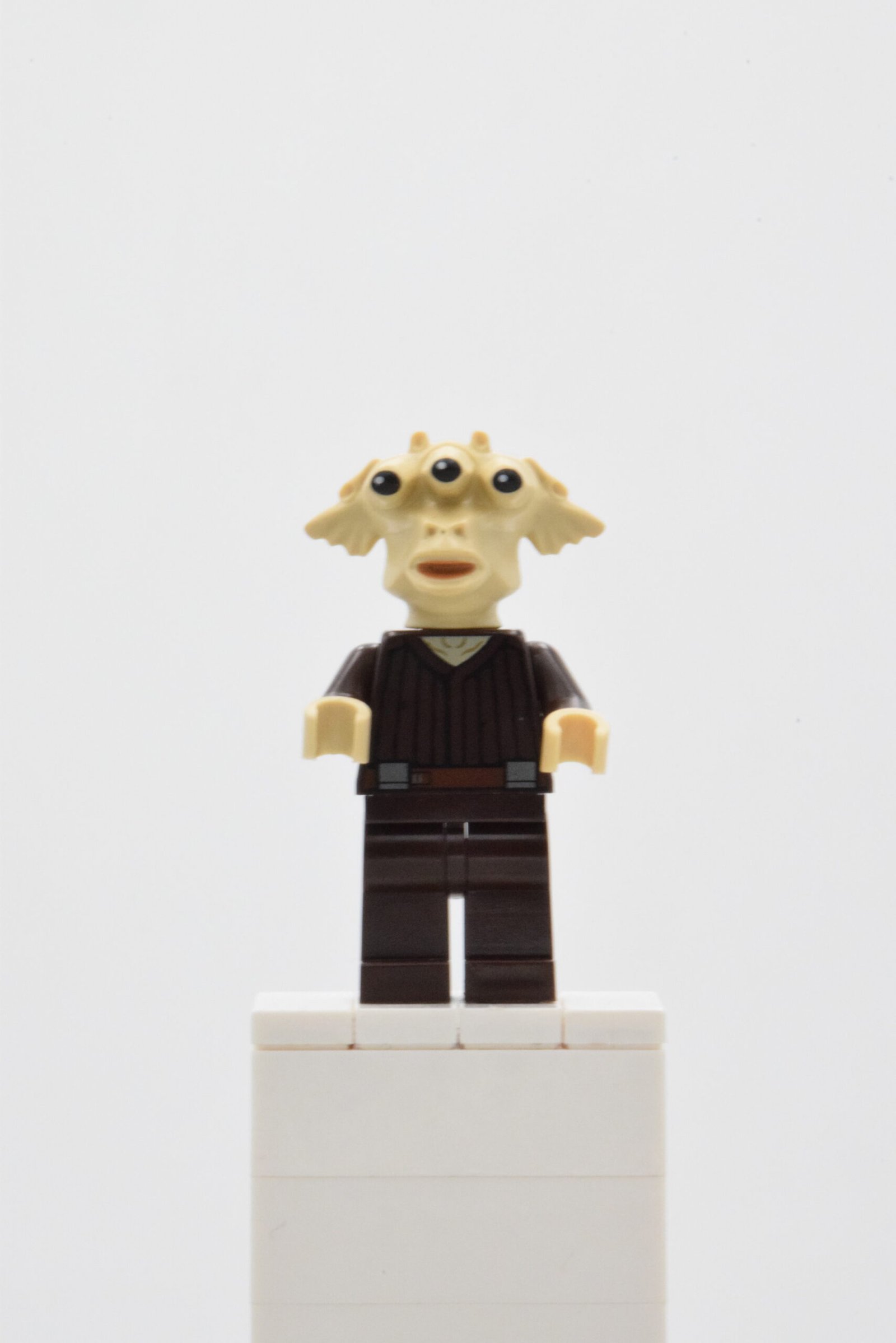 Côté tenue, l’ensemble reste volontairement sobre et efficace : torse dark brown avec motif de plis verticaux et ceinture, complété par des jambes dark brown unies. Ce choix donne un rendu cohérent pour une scène de palais / barge, tout en facilitant l’intégration parmi d’autres aliens de l’entourage de Jabba.