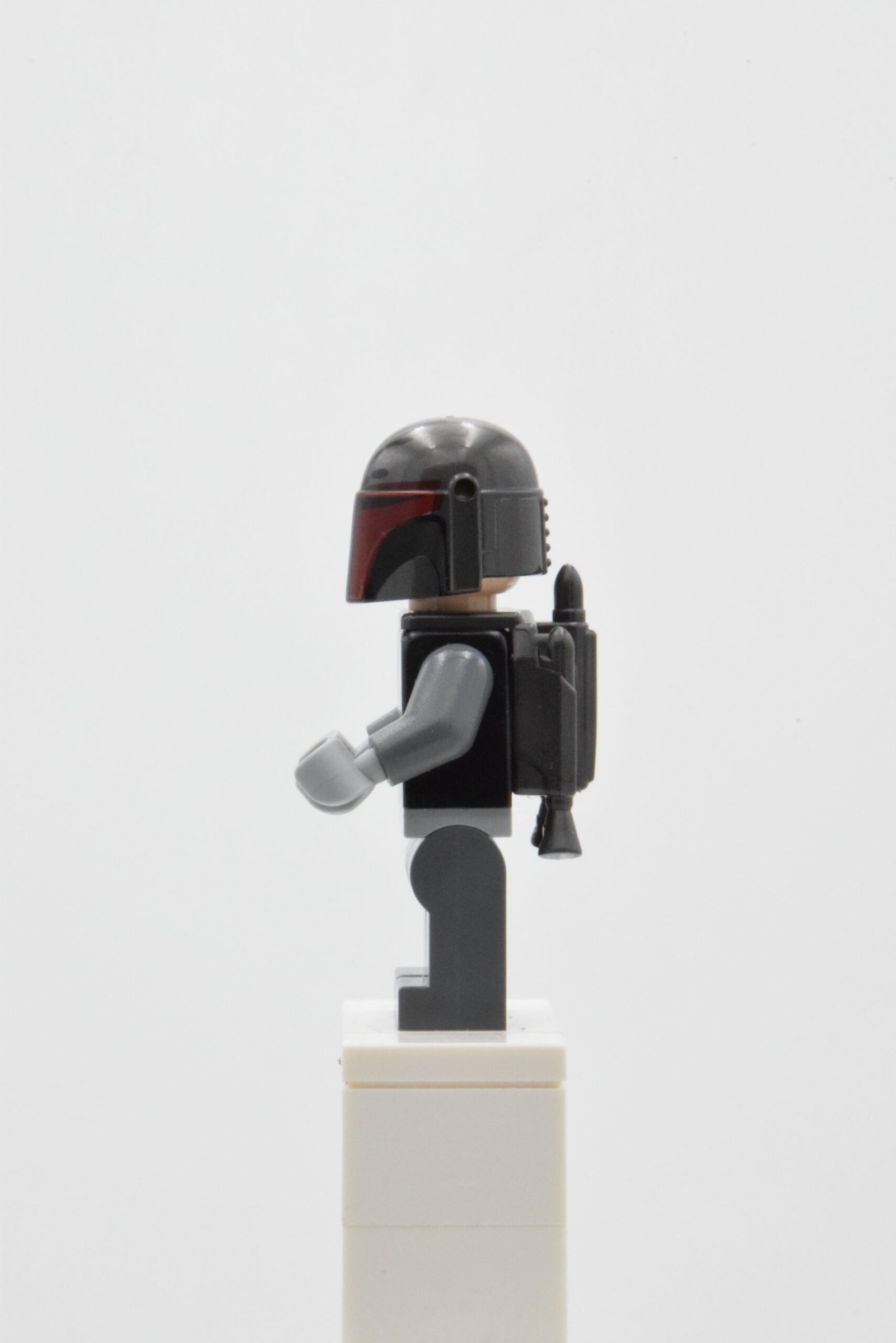 Le casque est un point fort visuel, avec un motif distinctif (visière dark red et marquages contrastés) qui donne immédiatement l’identité mandalorienne, même au second plan d’un diorama.