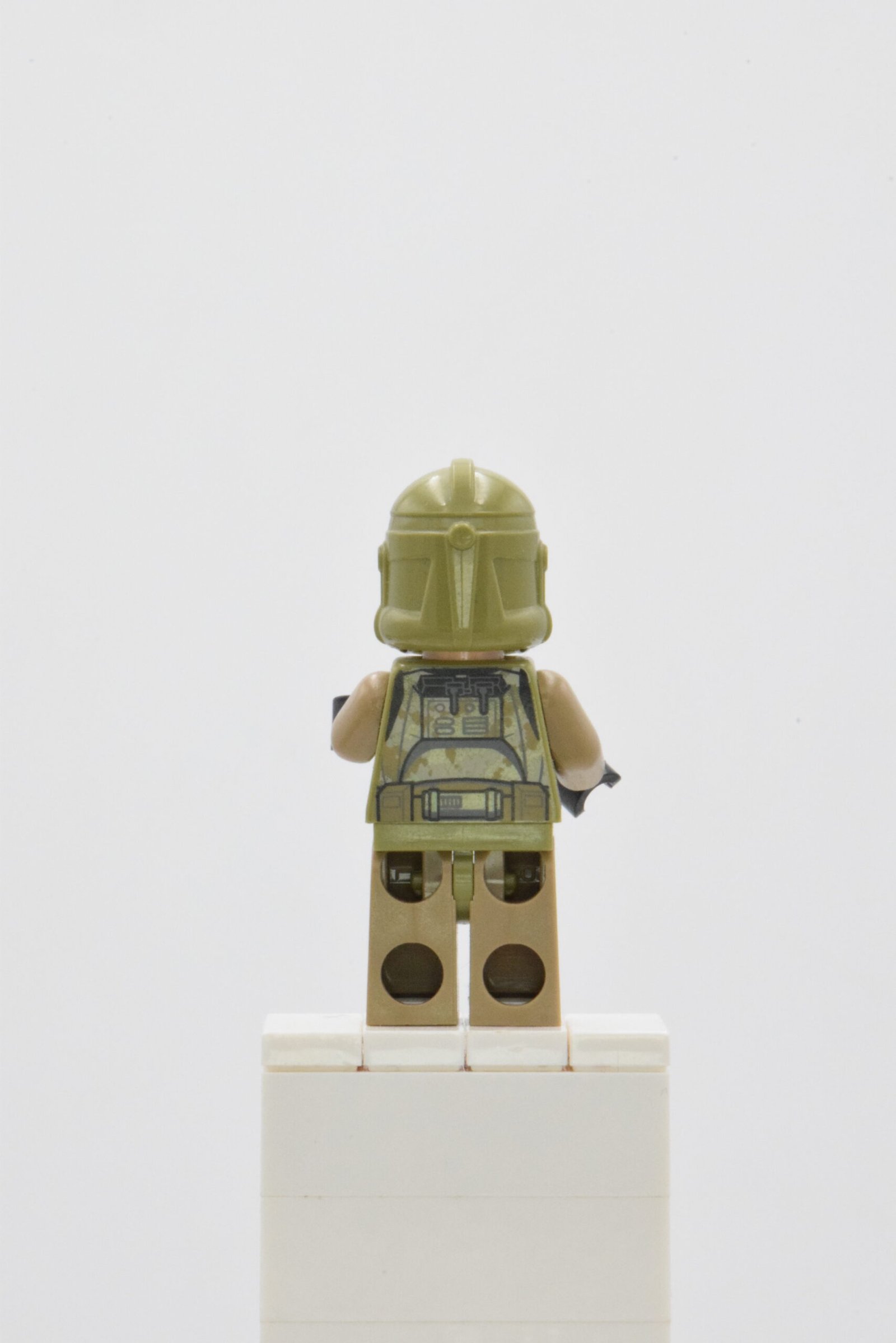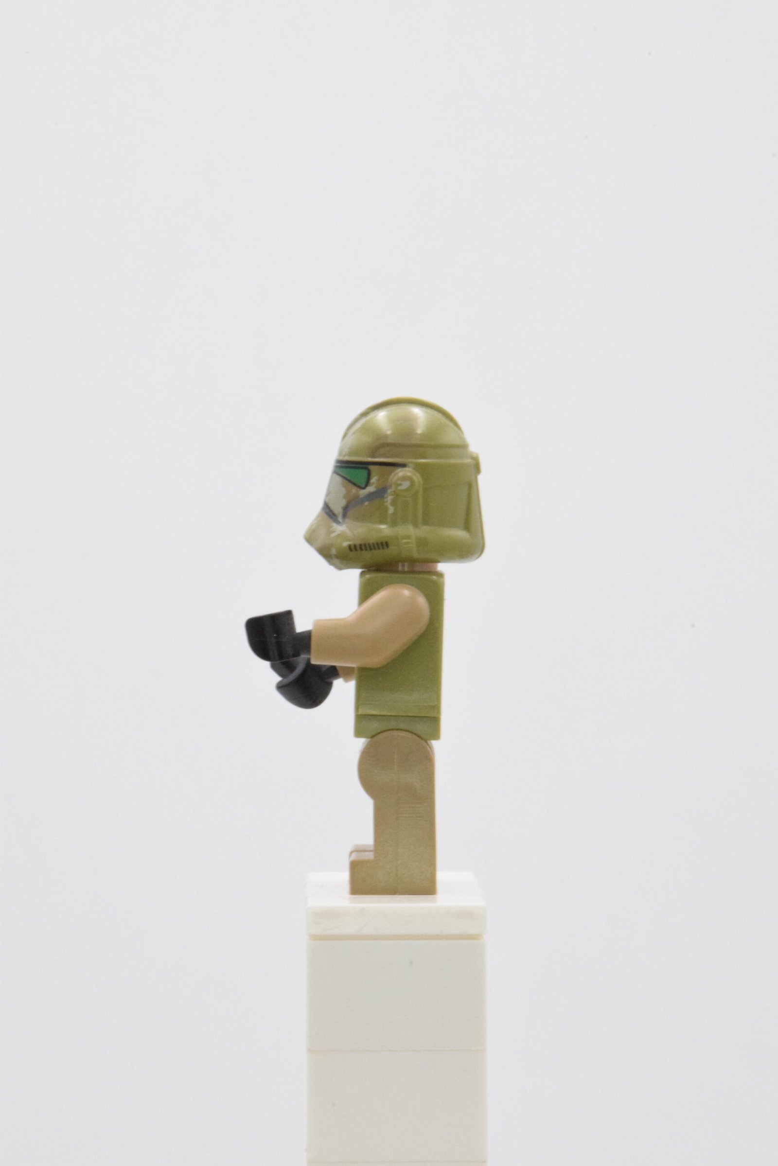 Sur sw0519, le design met clairement l’accent sur le camouflage Kashyyyk : le casque Phase 2 et le torse affichent des marquages verts/sable qui différencient immédiatement cette unité des clones standards. L’impression du torse est structurée (plastron, ceinture et détails d’équipement), et les jambes décorées prolongent la tenue sans laisser de zones trop neutres, ce qui améliore nettement le rendu en exposition.