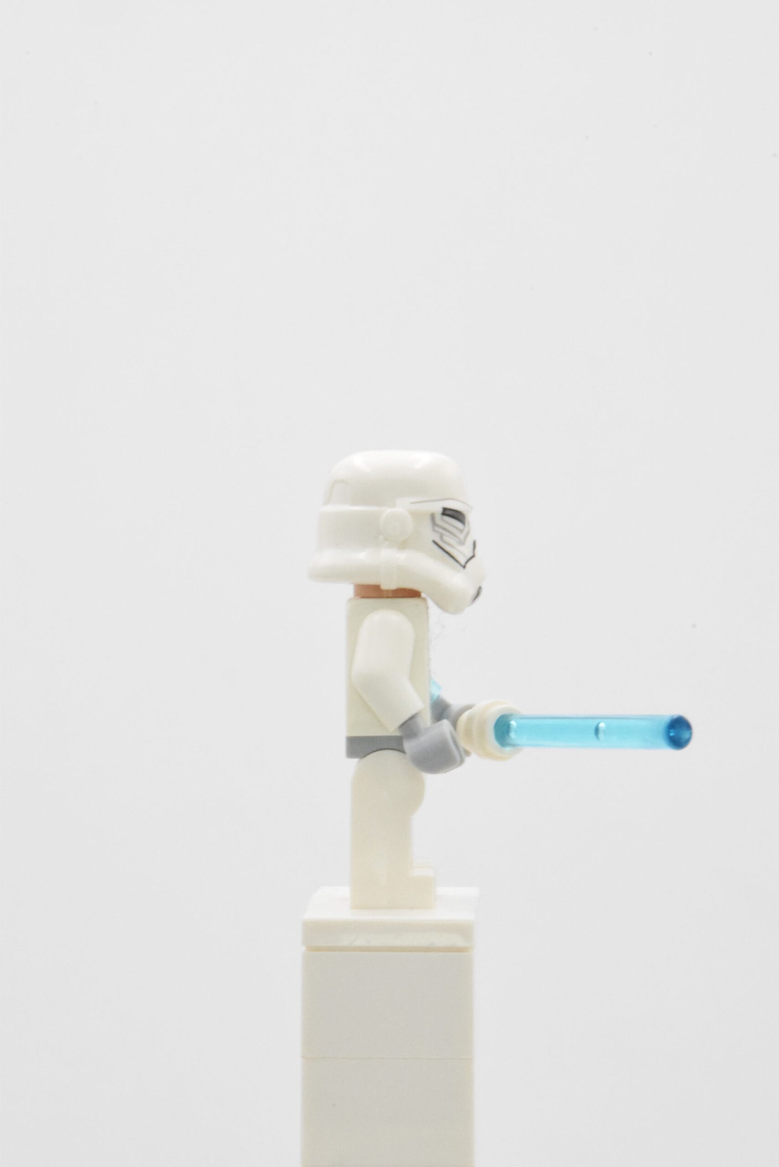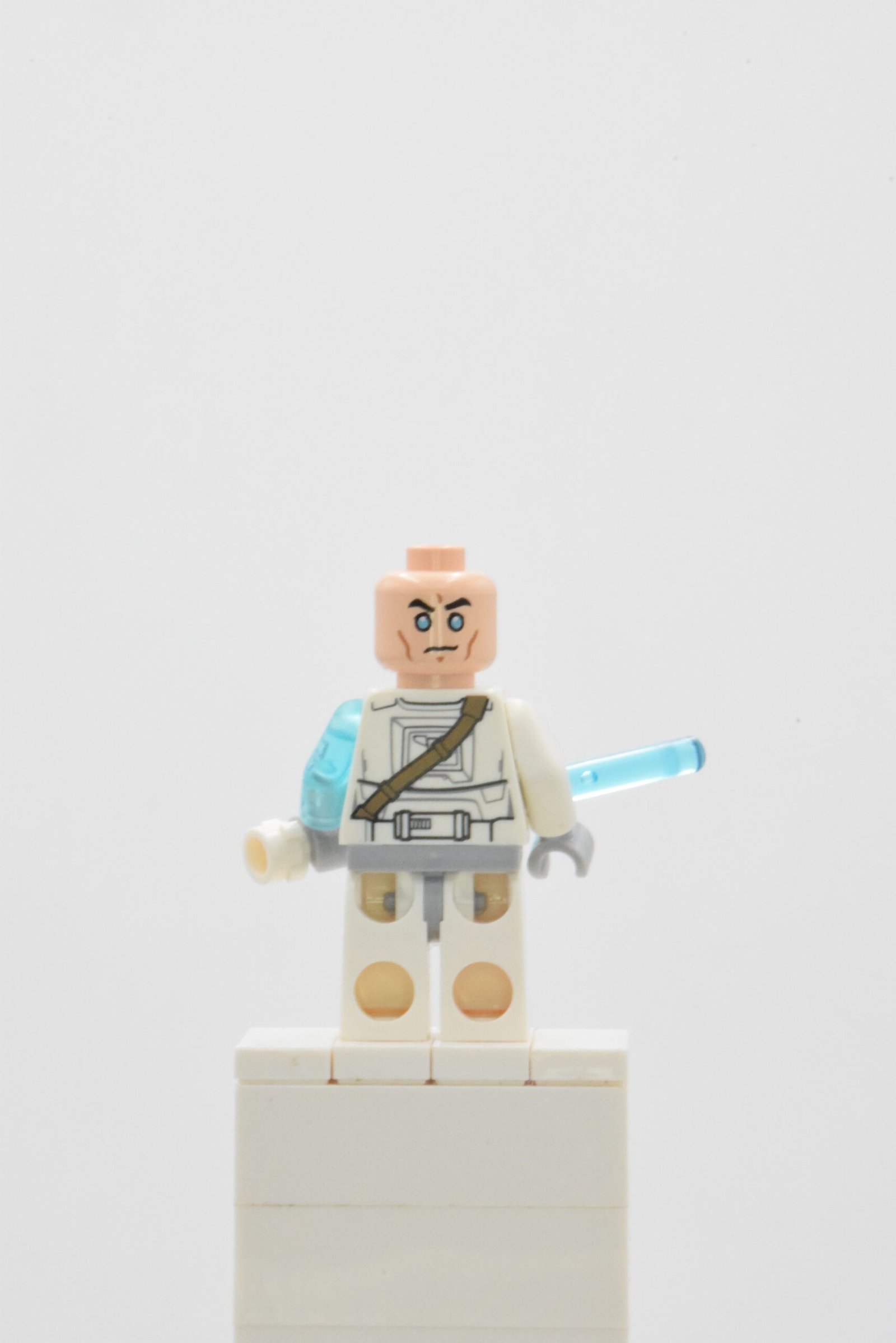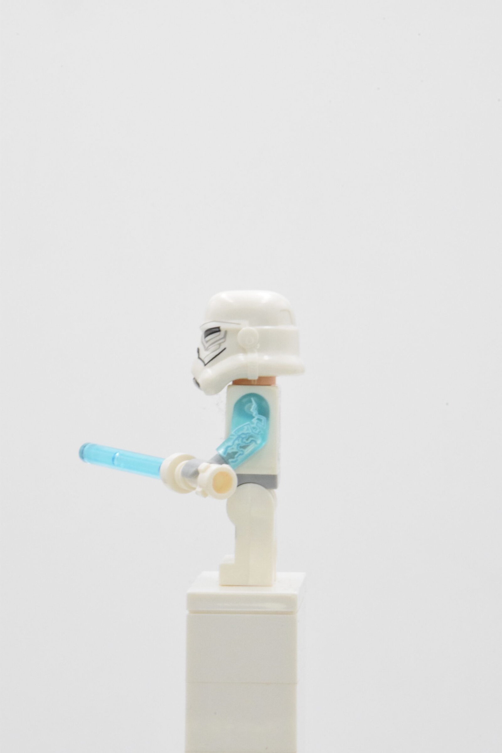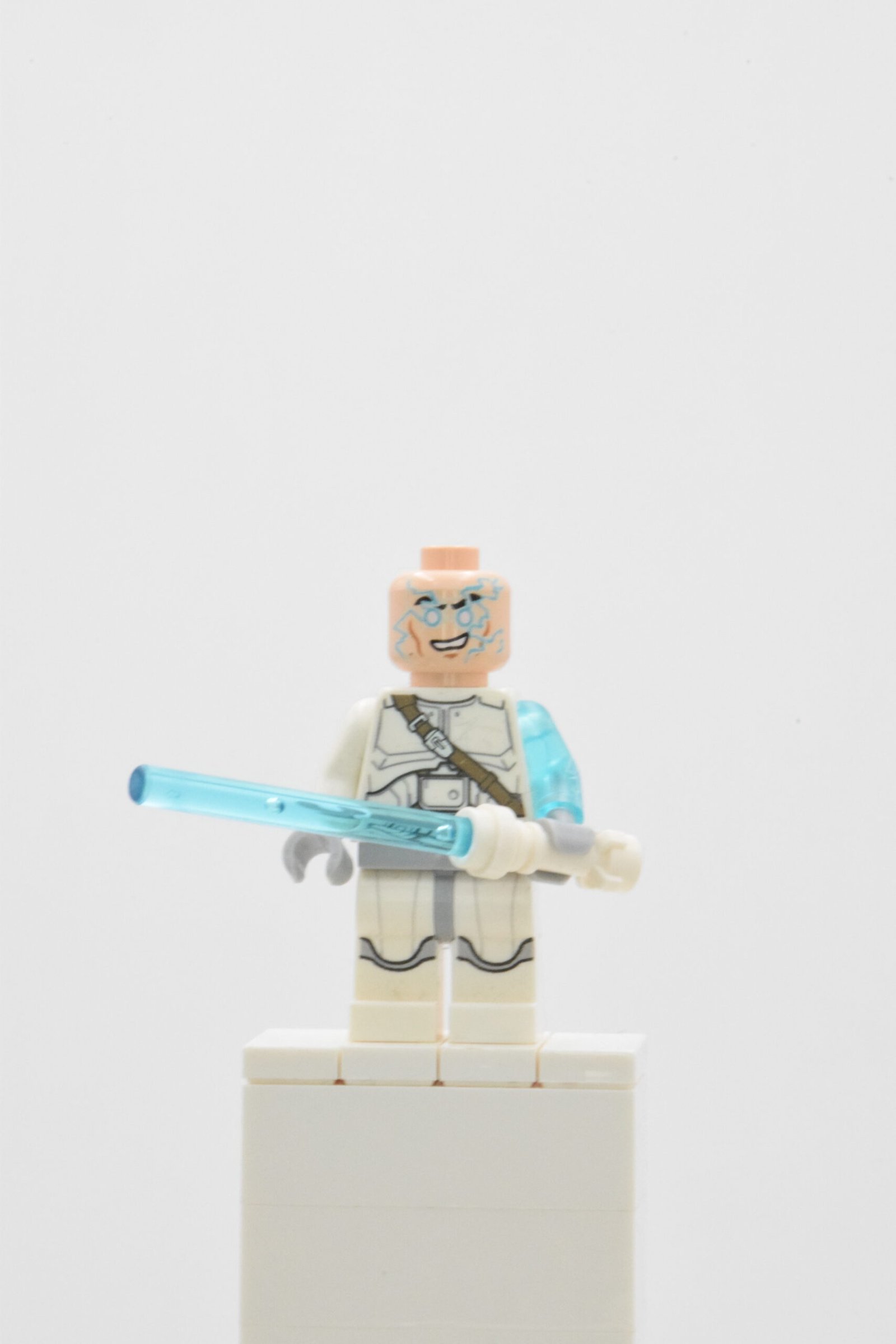 La figurine sw0571 Jek-14 se démarque par une lecture “clone/armure” très nette : torse blanc imprimé avec ceinture diagonale et détails d’armure, complété par des jambes blanches avec marquages gris clair qui donnent un rendu militaire propre en vitrine. Le point signature, c’est l’asymétrie : un bras translucide bleu sérigraphié façon éclairs, qui apporte immédiatement l’effet “pouvoir” et différencie la silhouette d’un simple trooper.