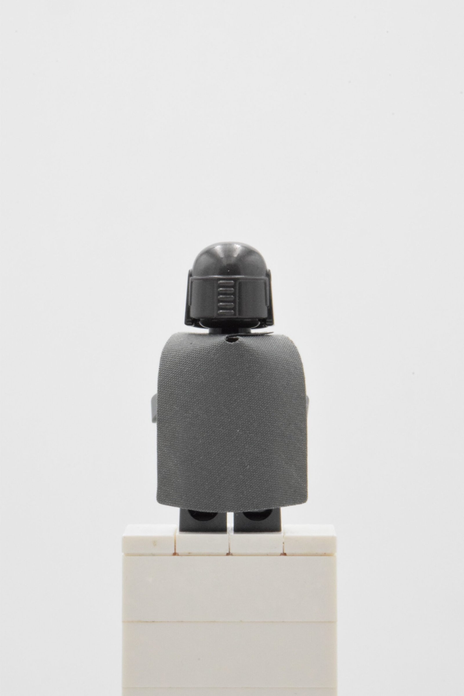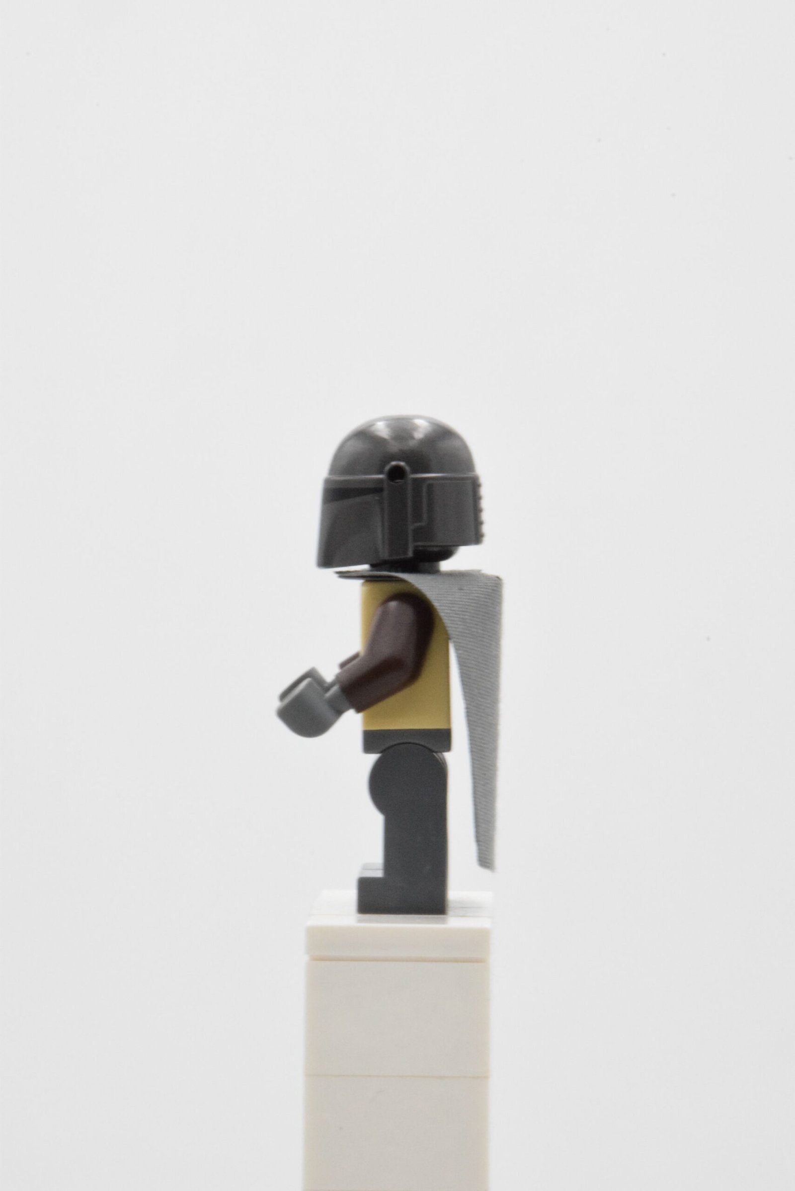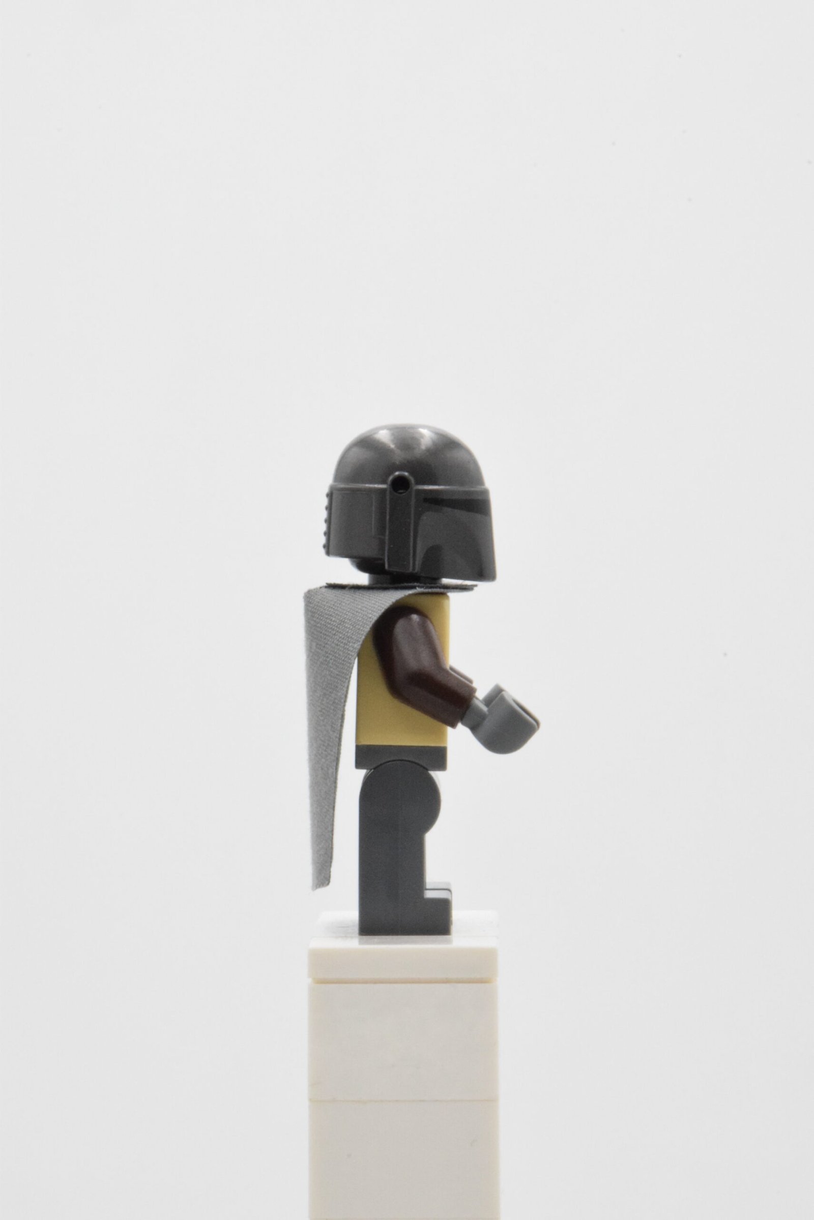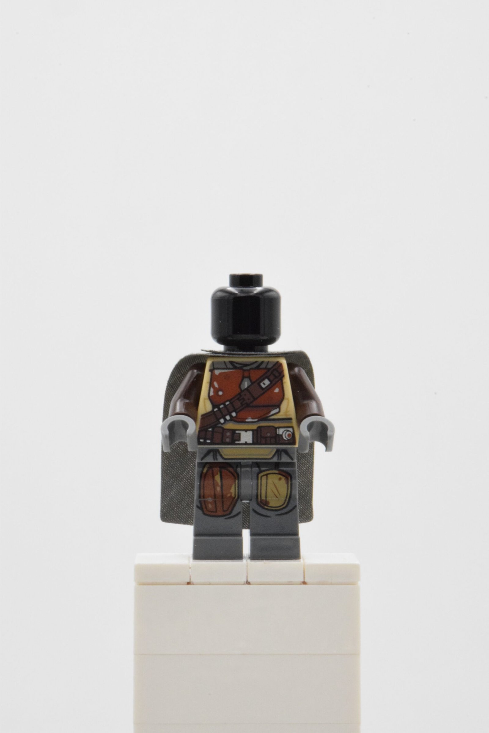 Le design de Din Djarin sur sw1057 se distingue par un rendu très lisible, avec un casque pearl dark gray à visière noire, une cape en tissu dark bluish gray, un torse tan imprimé d’armure usée avec plaques dark orange, bandoulière dark brown et ceinture utilitaire, ainsi que des jambes dark bluish gray décorées de pièces d’armure et d’empiècements patinés. L’ensemble offre une présence visuelle forte, cohérente et particulièrement convaincante pour une vitrine ou une fiche e-commerce centrée sur un personnage principal.